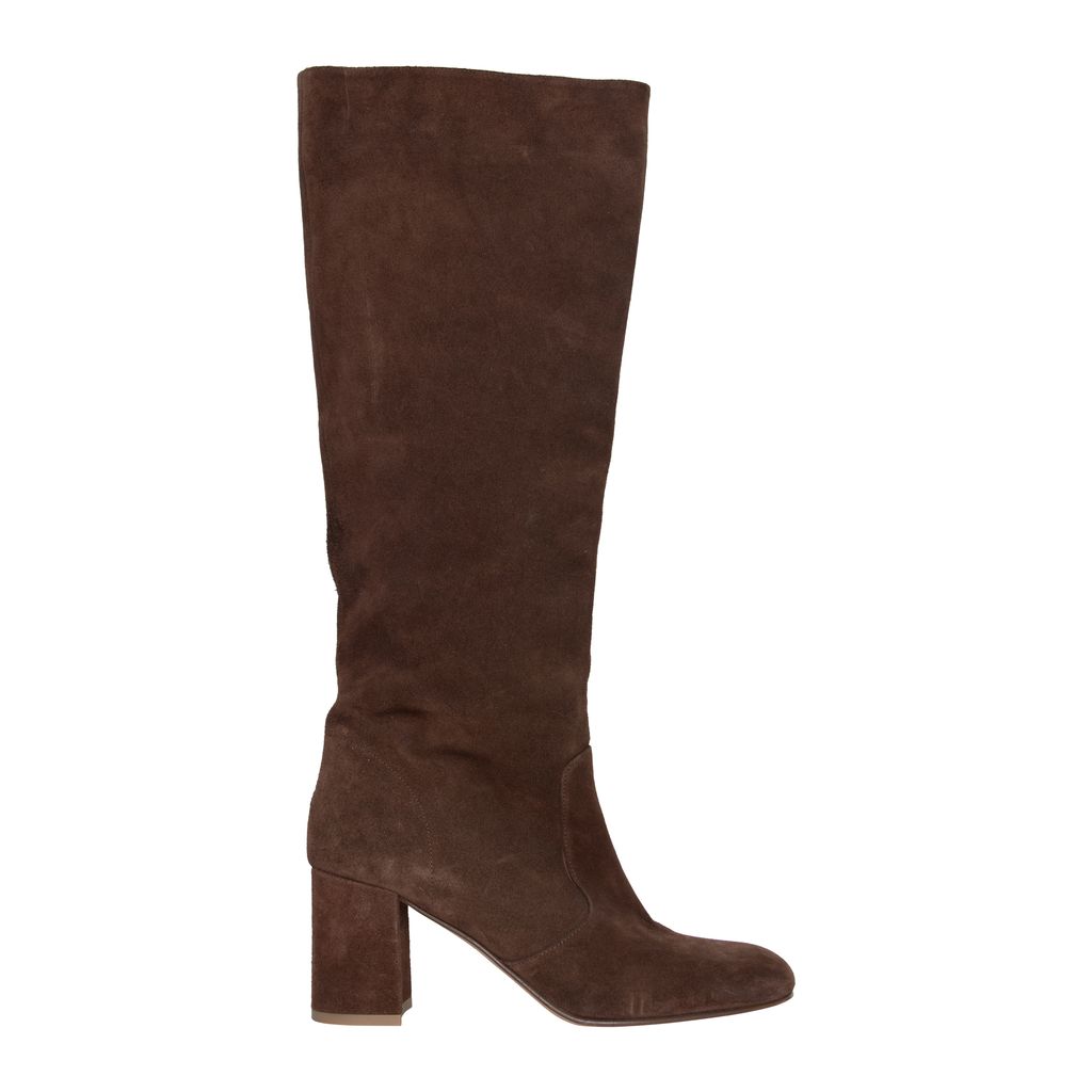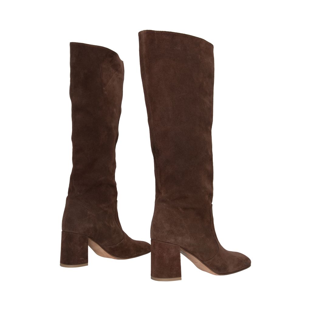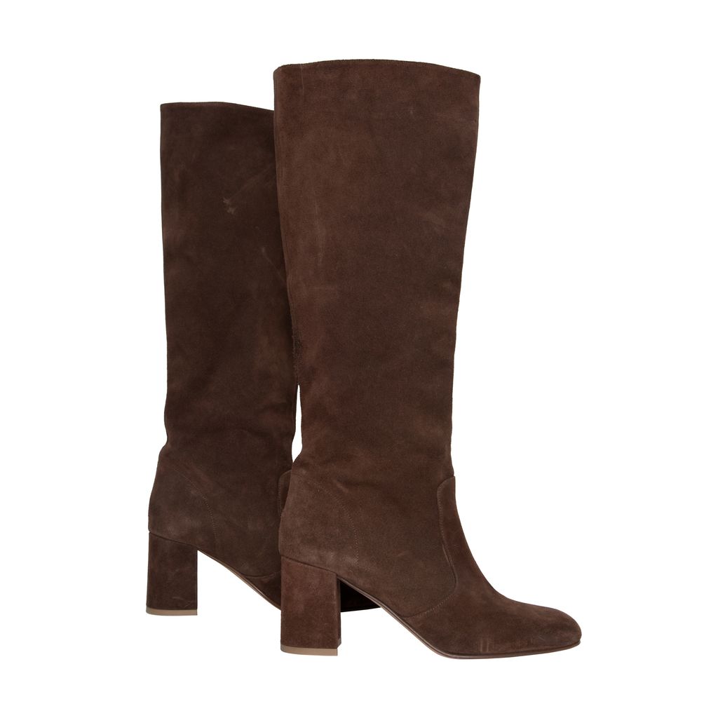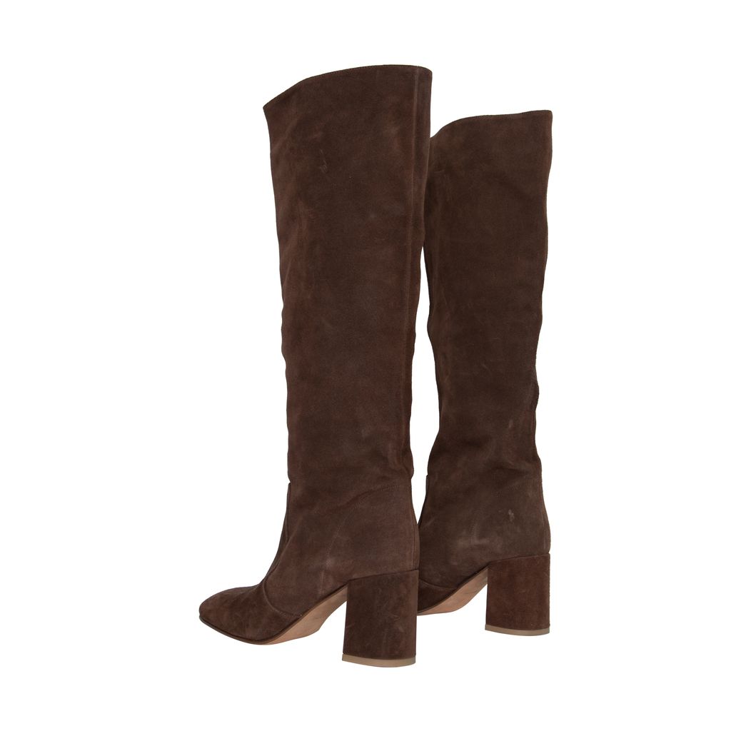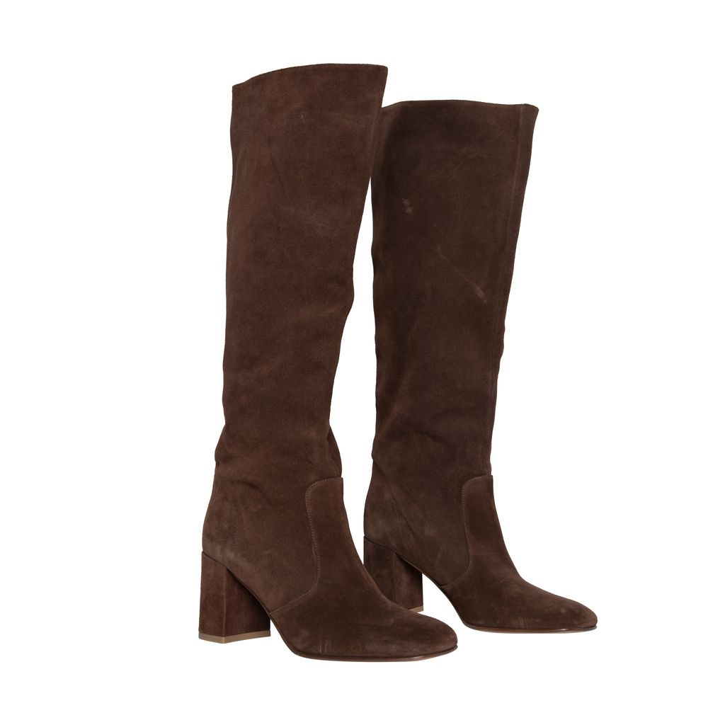 Maryam Nassir Zadeh Brown Knee High Boots features suede material, square toe, and platform.