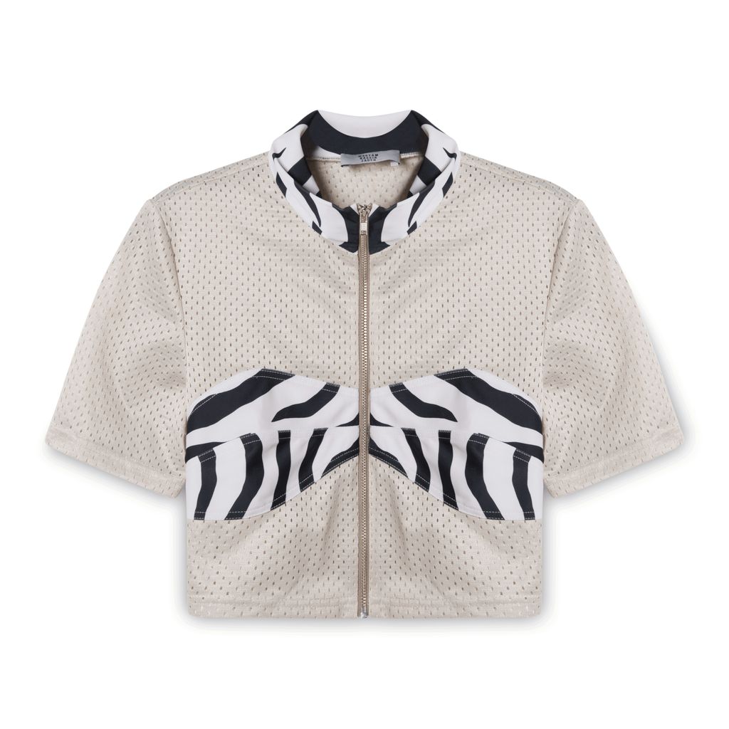 Maryam Nassir Zadeh mesh crop top features a silver zip going down the zebra print collar and chest.