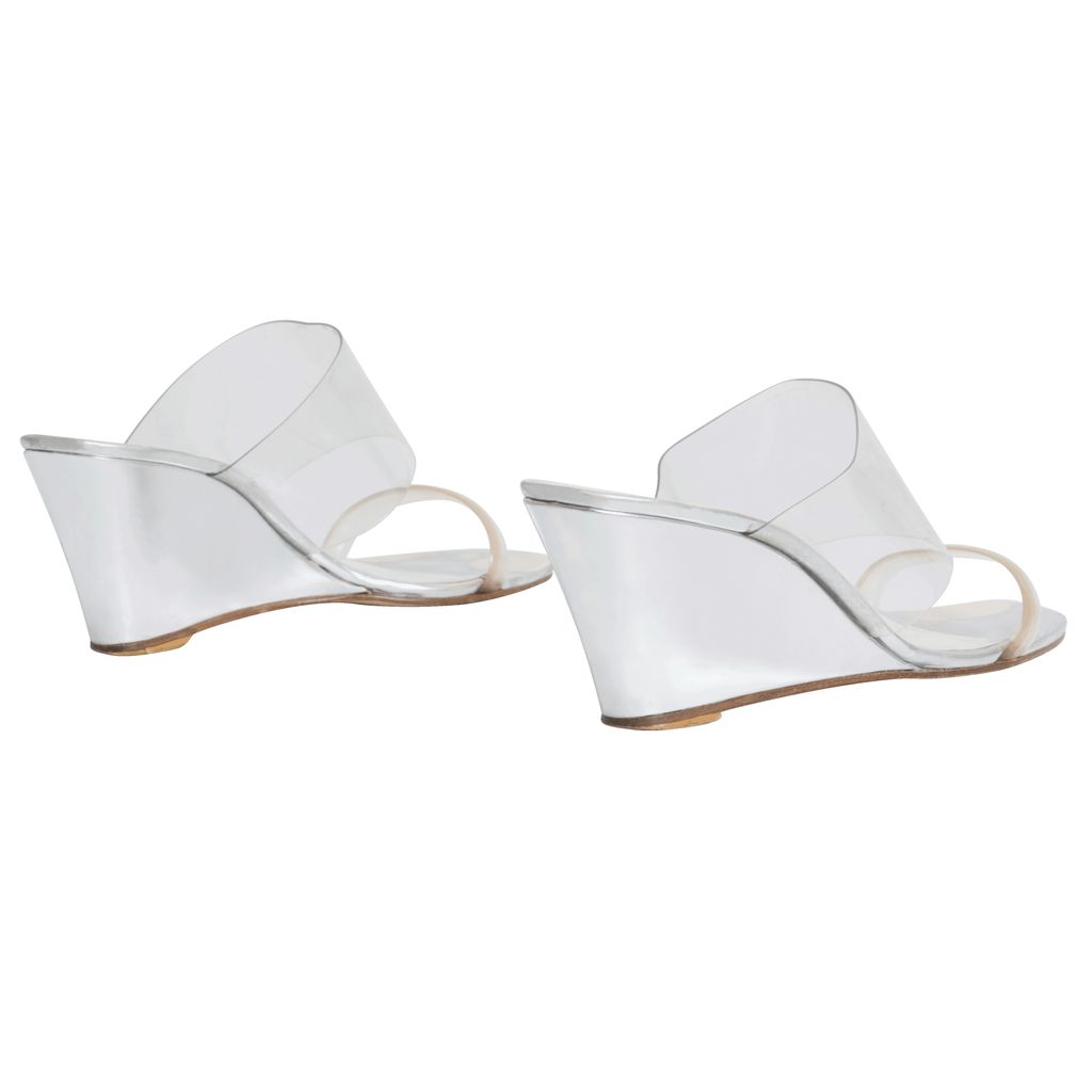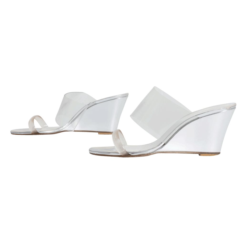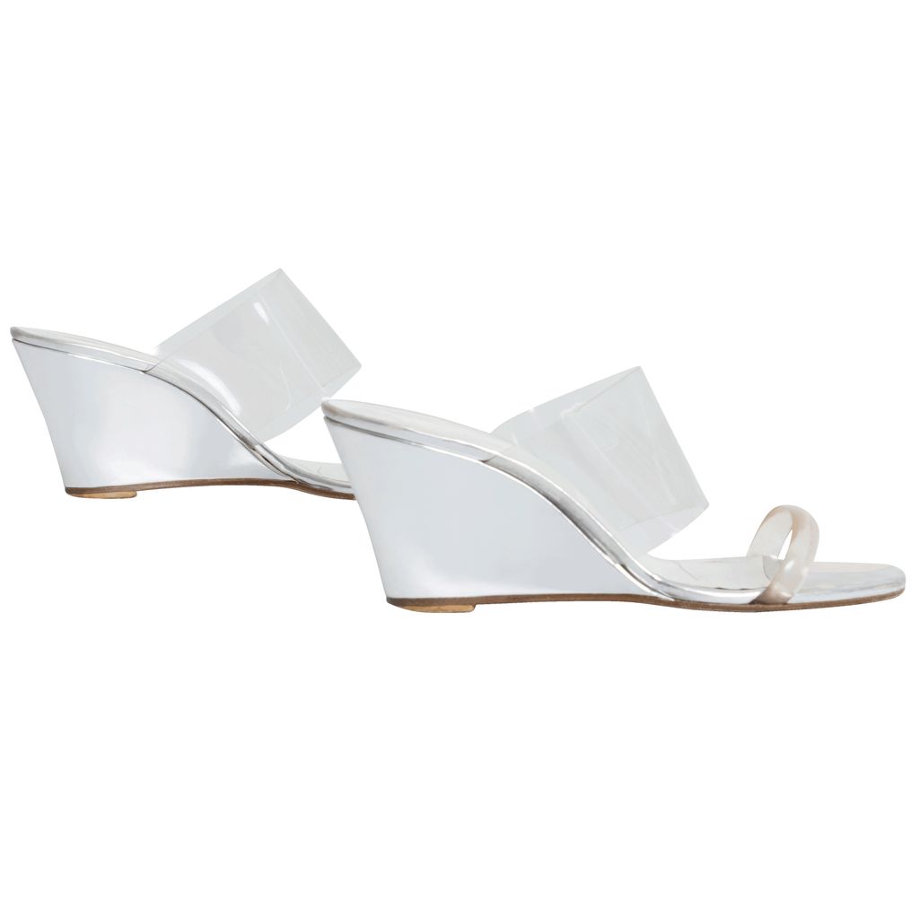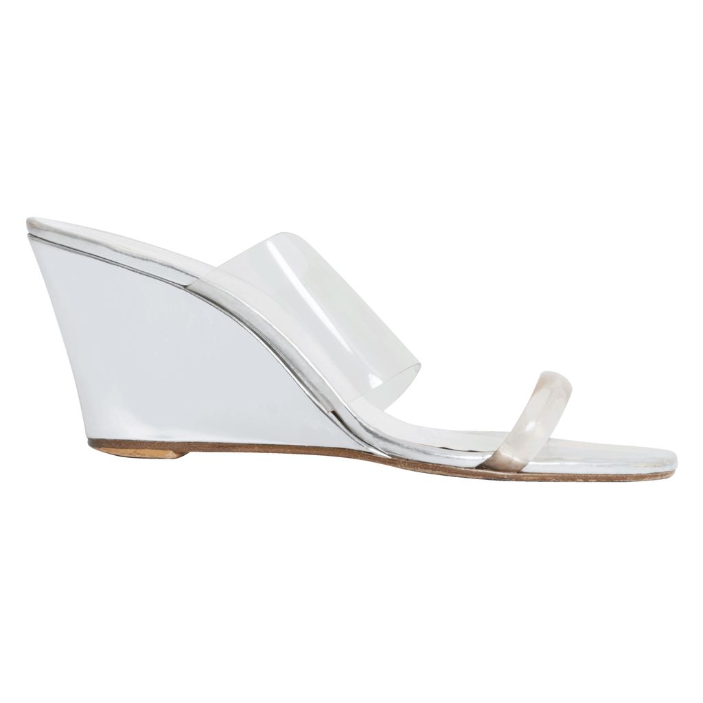 Silver Olympia wedge with clear straps. Please note the toe marks on the shoe, a worn bottom, and the back of the left shoe is a little nicked.