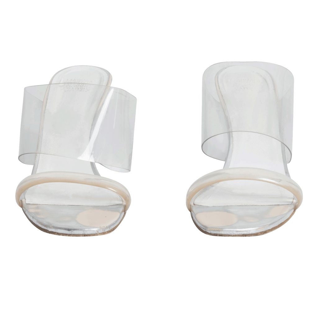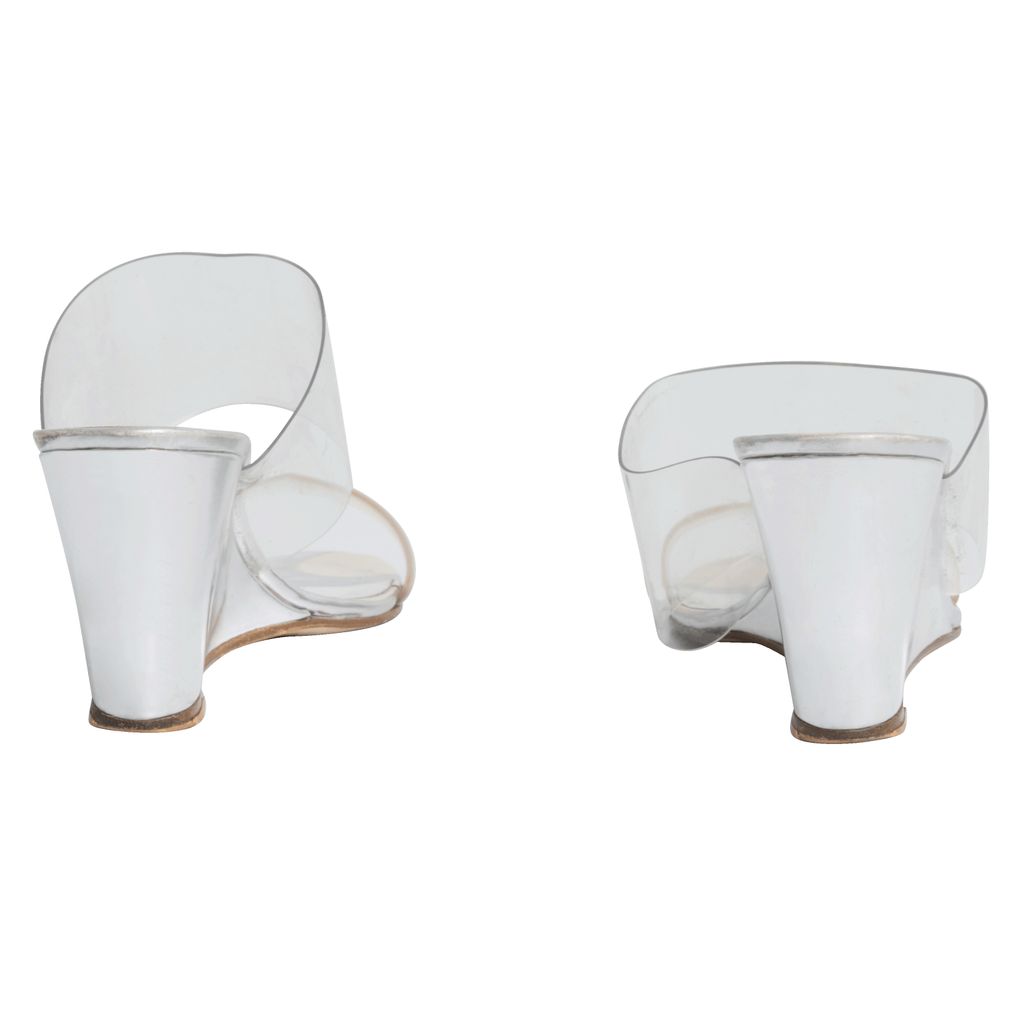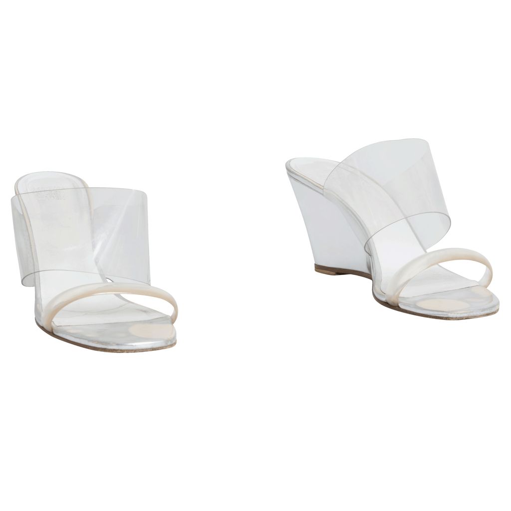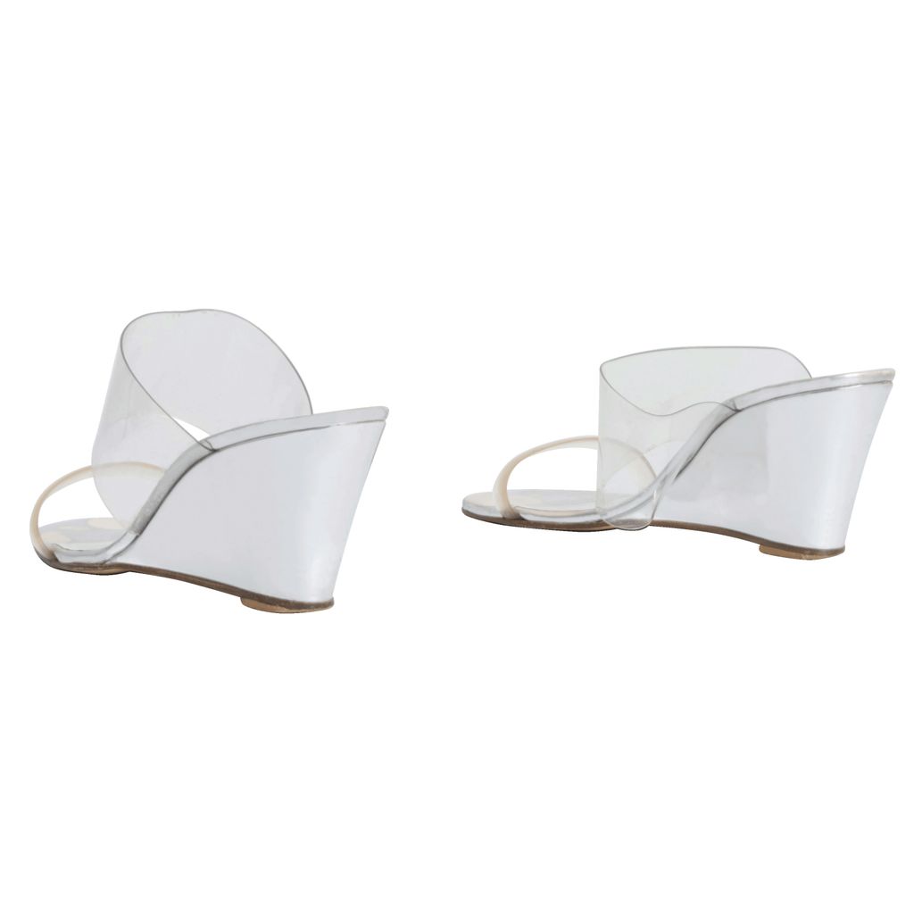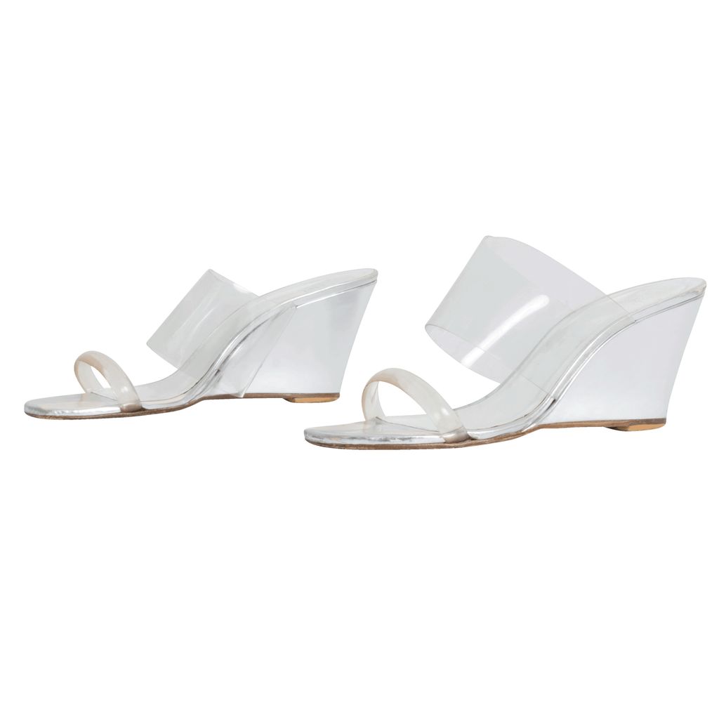 Silver Olympia wedge with clear straps. Please note the toe marks on the shoe, a worn bottom, and the back of the left shoe is a little nicked.