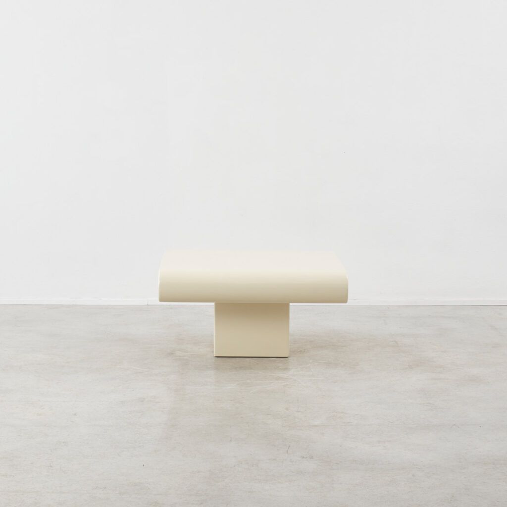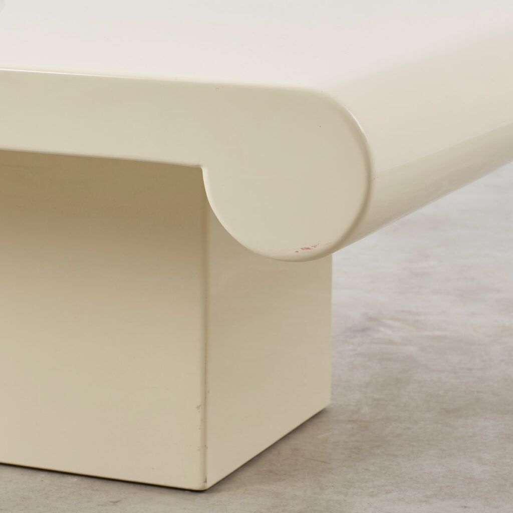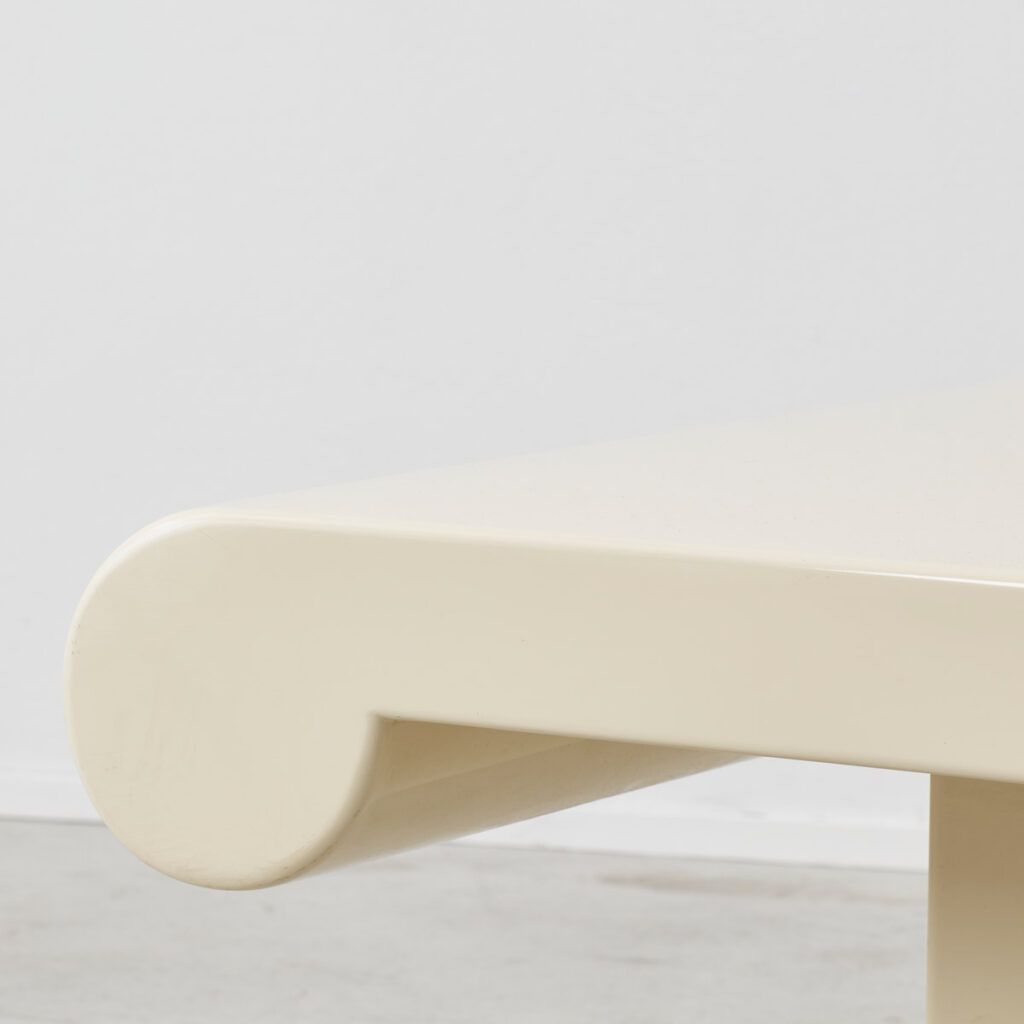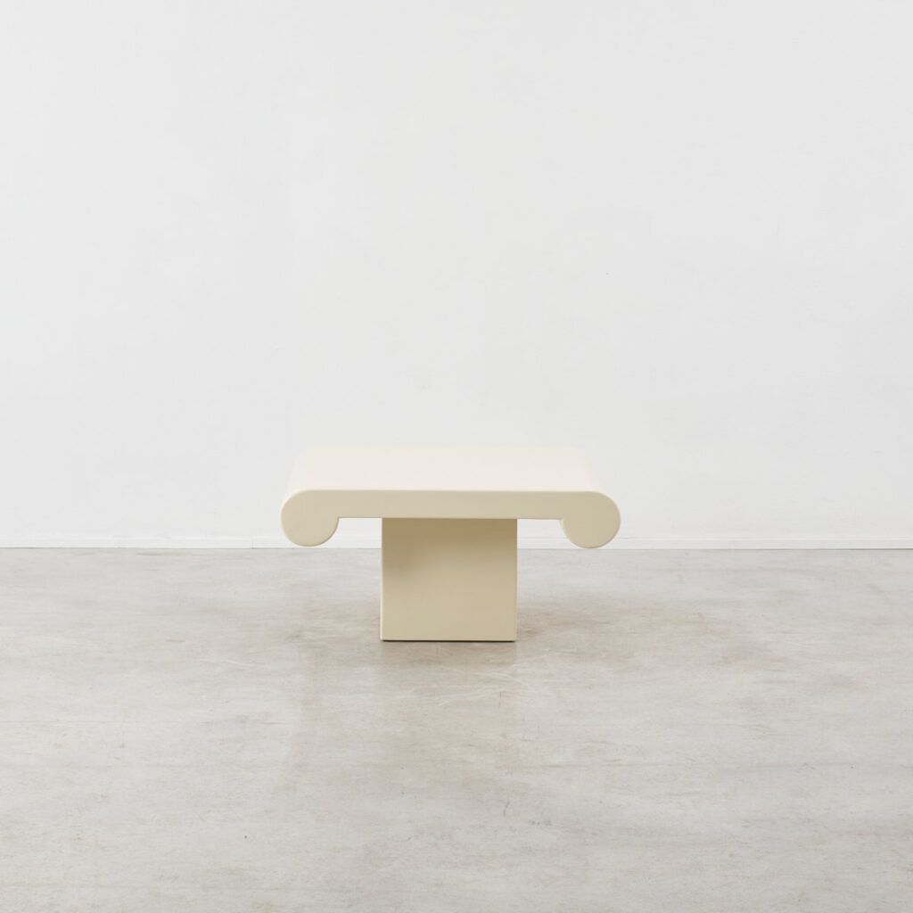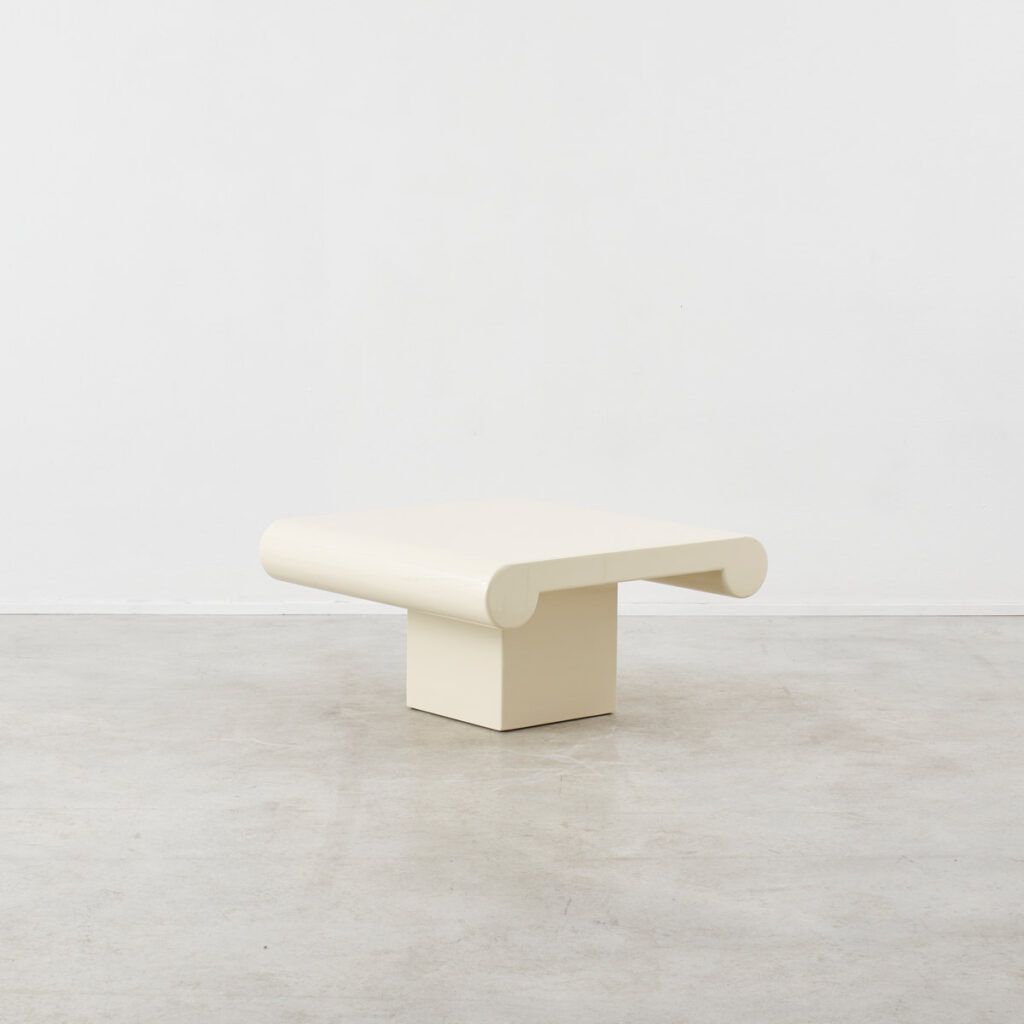 The suggestion of a scroll-like volute lends classical appeal to this rare side table, which sits on a simple square pedestal and is wrapped in a cream lacquer.