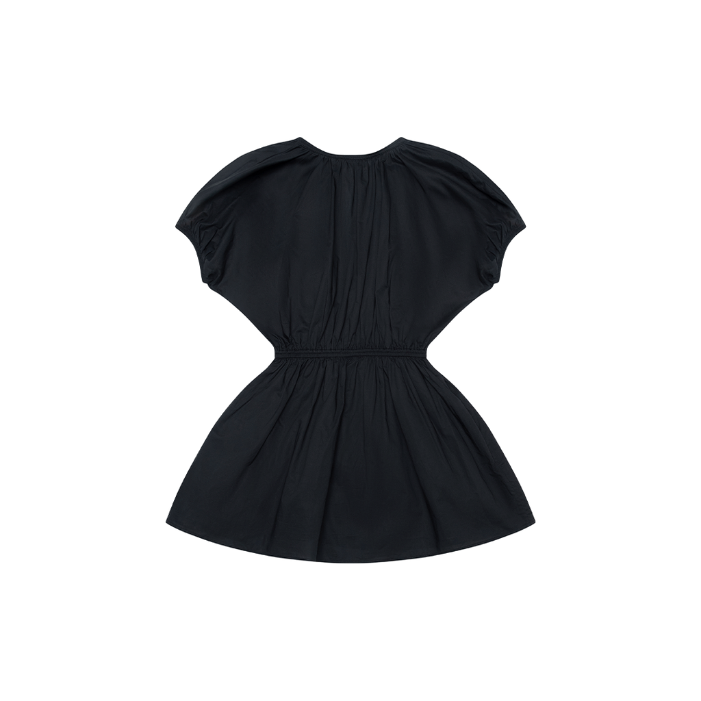 Matteau Black Cotton Shirt Dress features button at collar and elasticized collar, arm holes, and waistband.