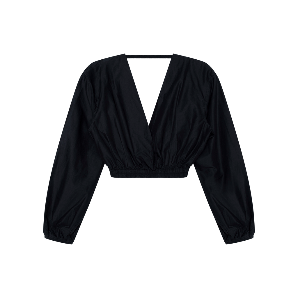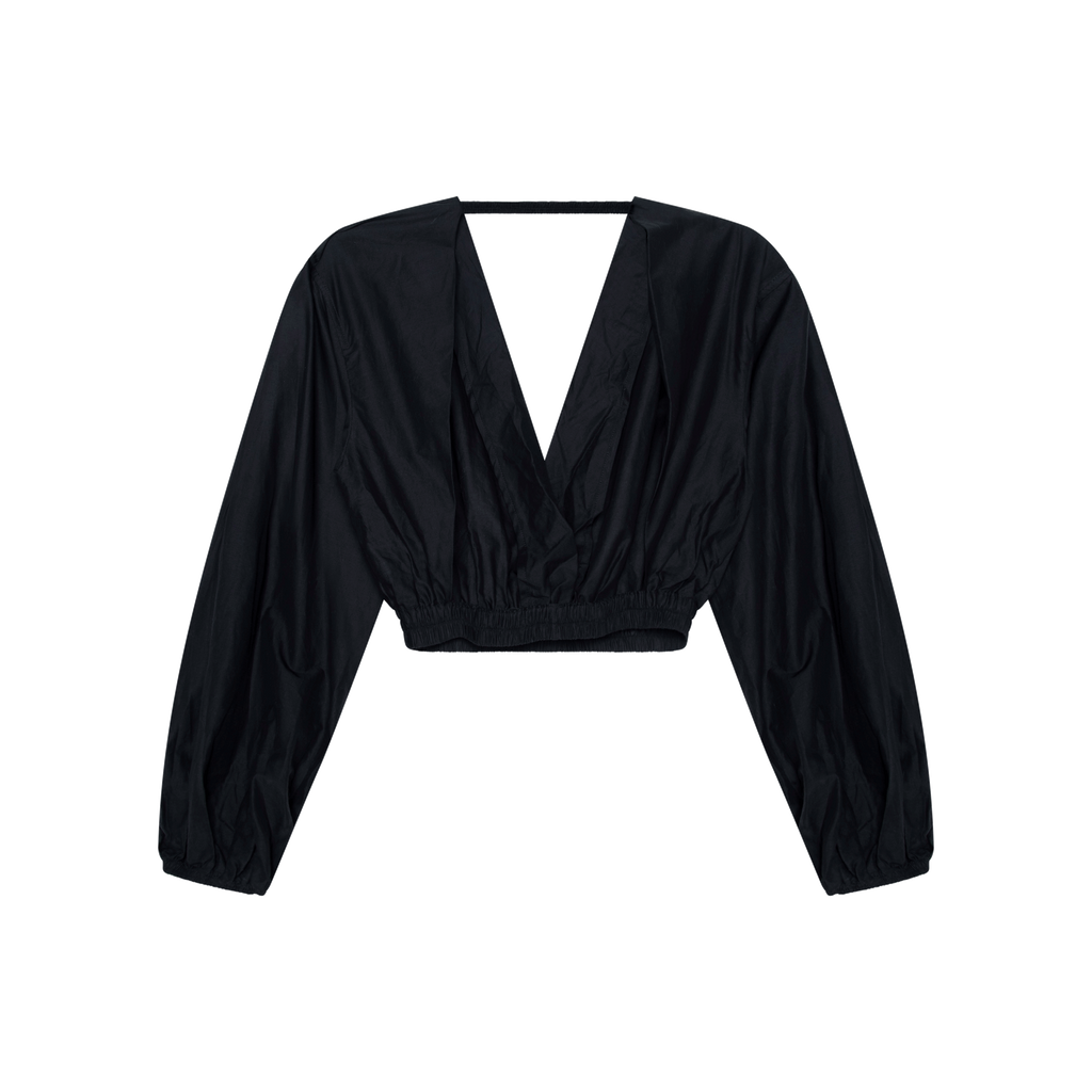 Matteau Black Open Back Blouse features cross over V-neck, long balloon sleeves, open back, and elastic waist.