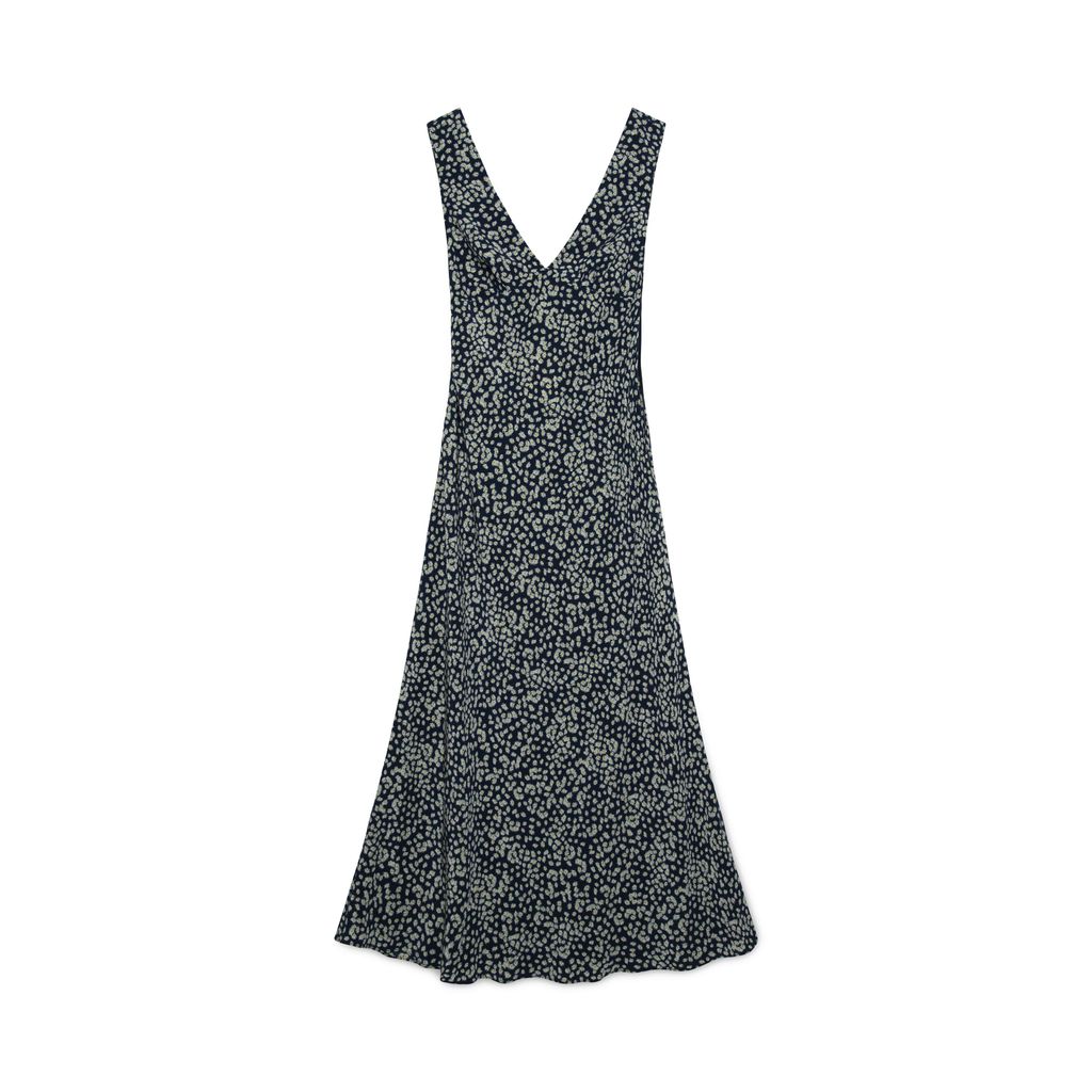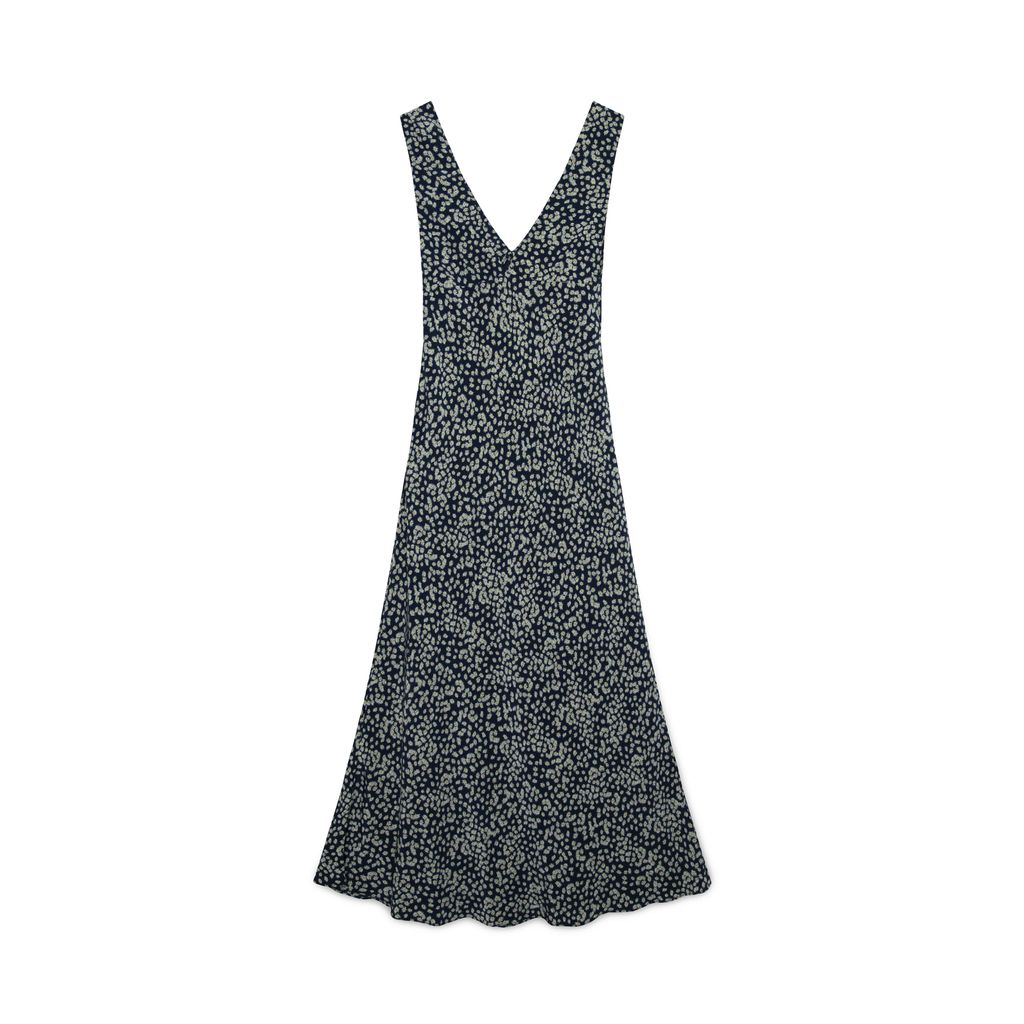 Matteau Plunge Slip Dress in Midnight Daisy features plunging V neck, V back, and ankle length dress.