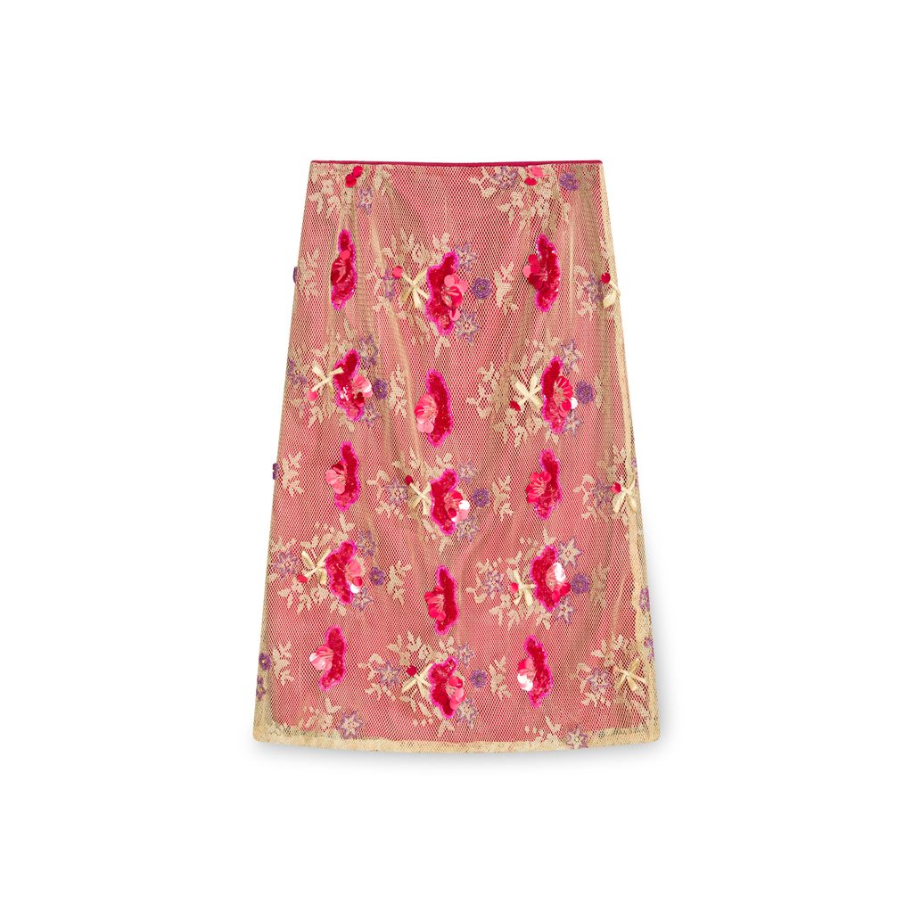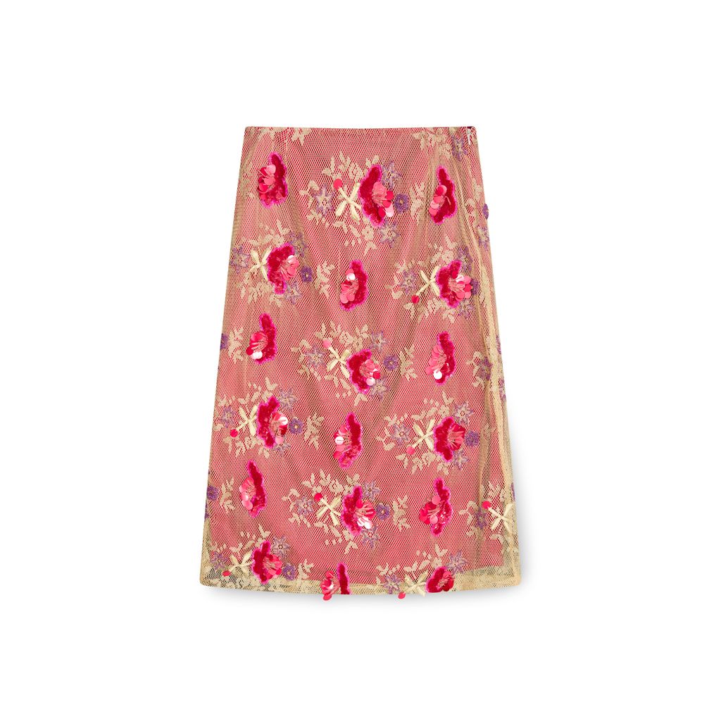 Matthew Williamson Gold Midi Skirt features silky lining layered under gold netting. Intricate beading and embroidery detail throughout.