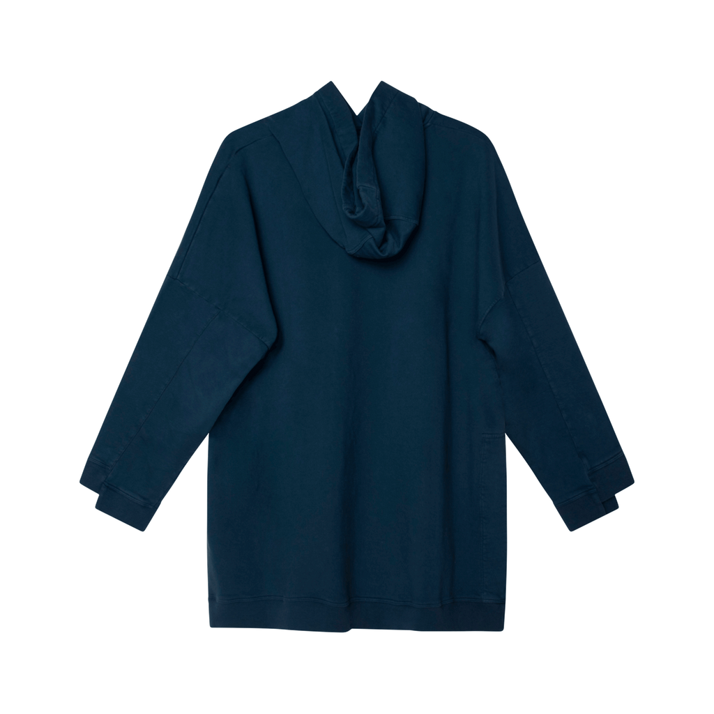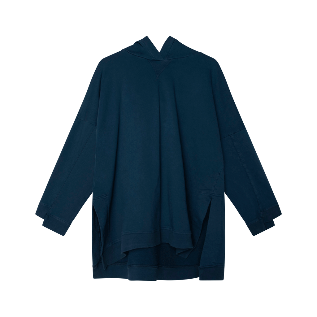 Maxi Hoodie in Navy features triangle detail at collar, side vents, and rib knit cuffs and hem.