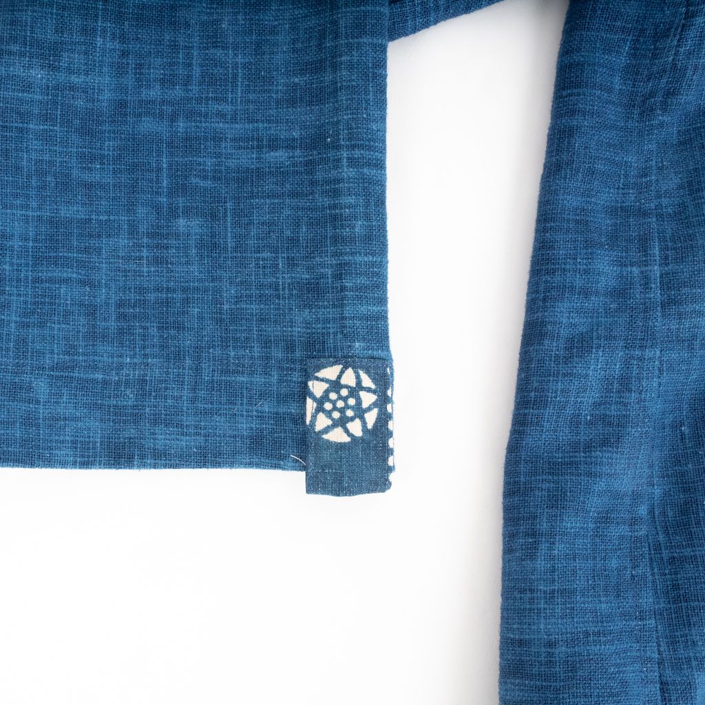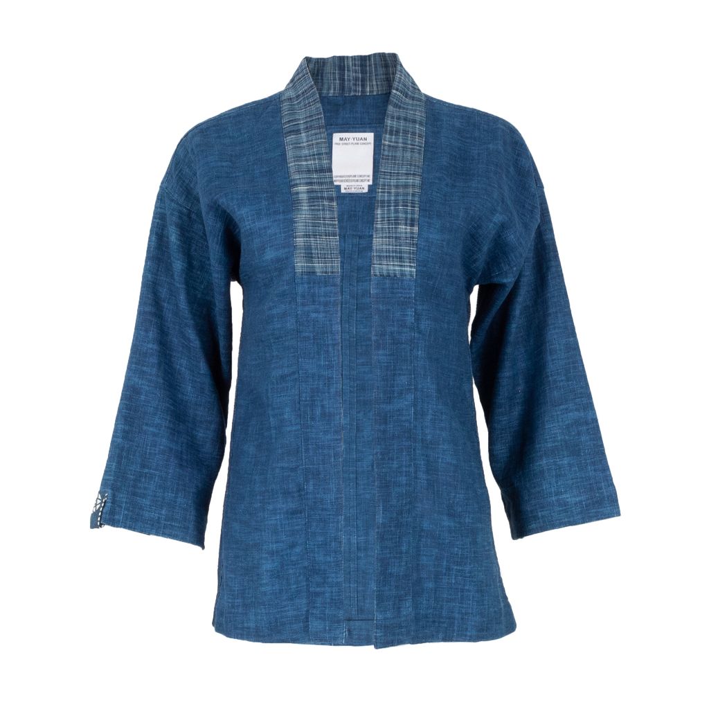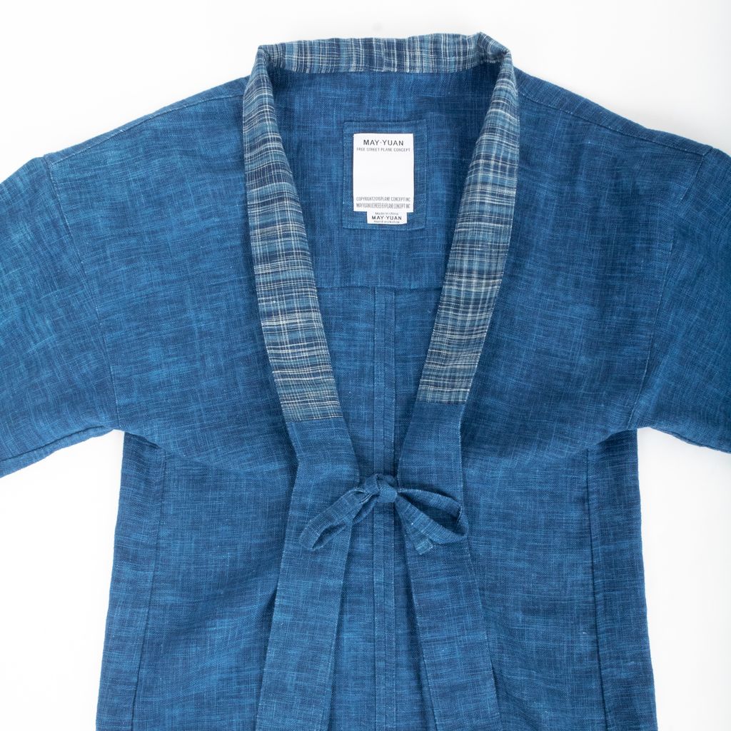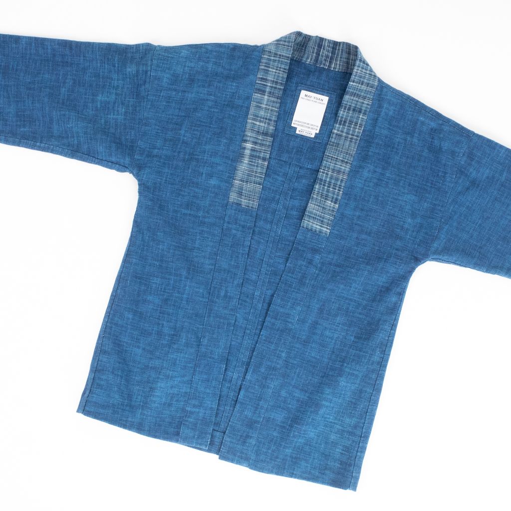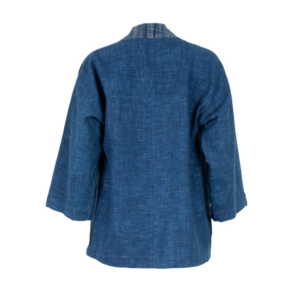 Craftsmanship is king hen it comes to this beautifully dyed and constructed noragi from May Yuan. Features indigo hatch dyed body, patterned fabric patch around neck, open front, 3/4 length sleeves, and logo patch on right arm at sleeve.