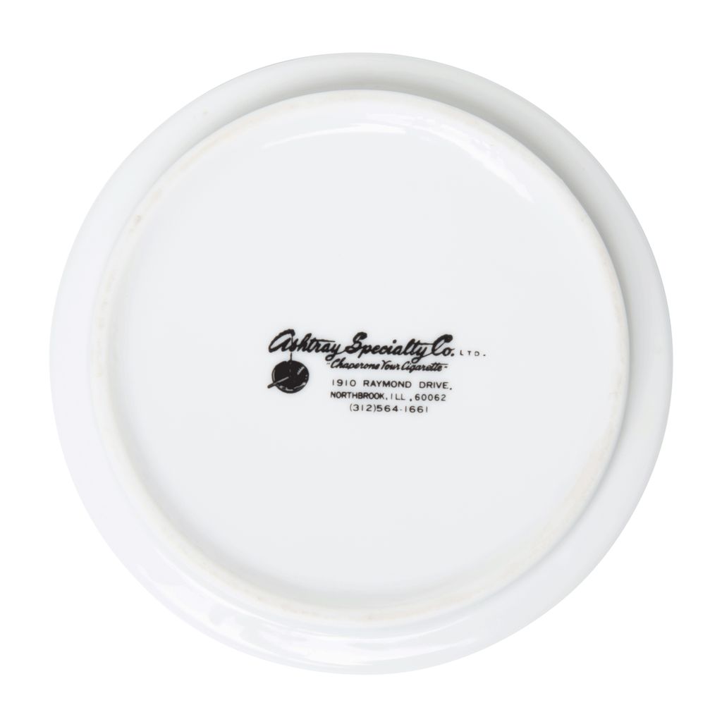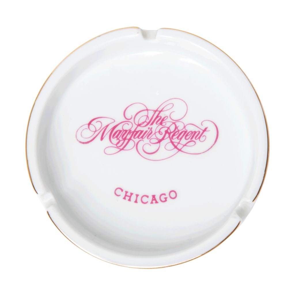 Mayfair Regent Chicago Ashtray features pink printed calligraphy on white porcelain with gold trim.