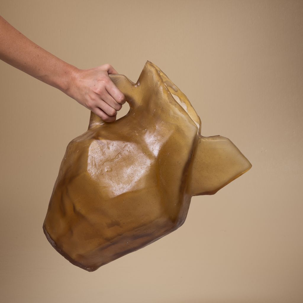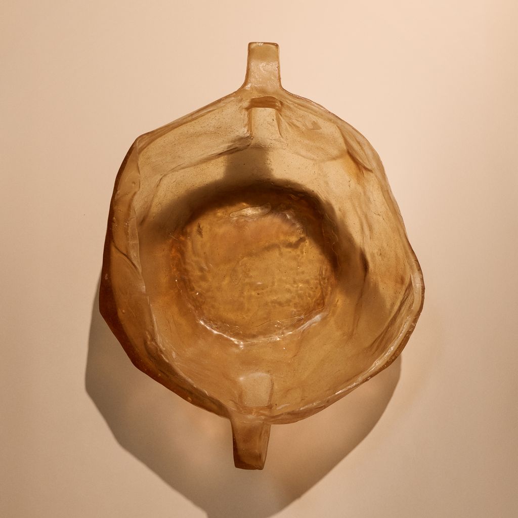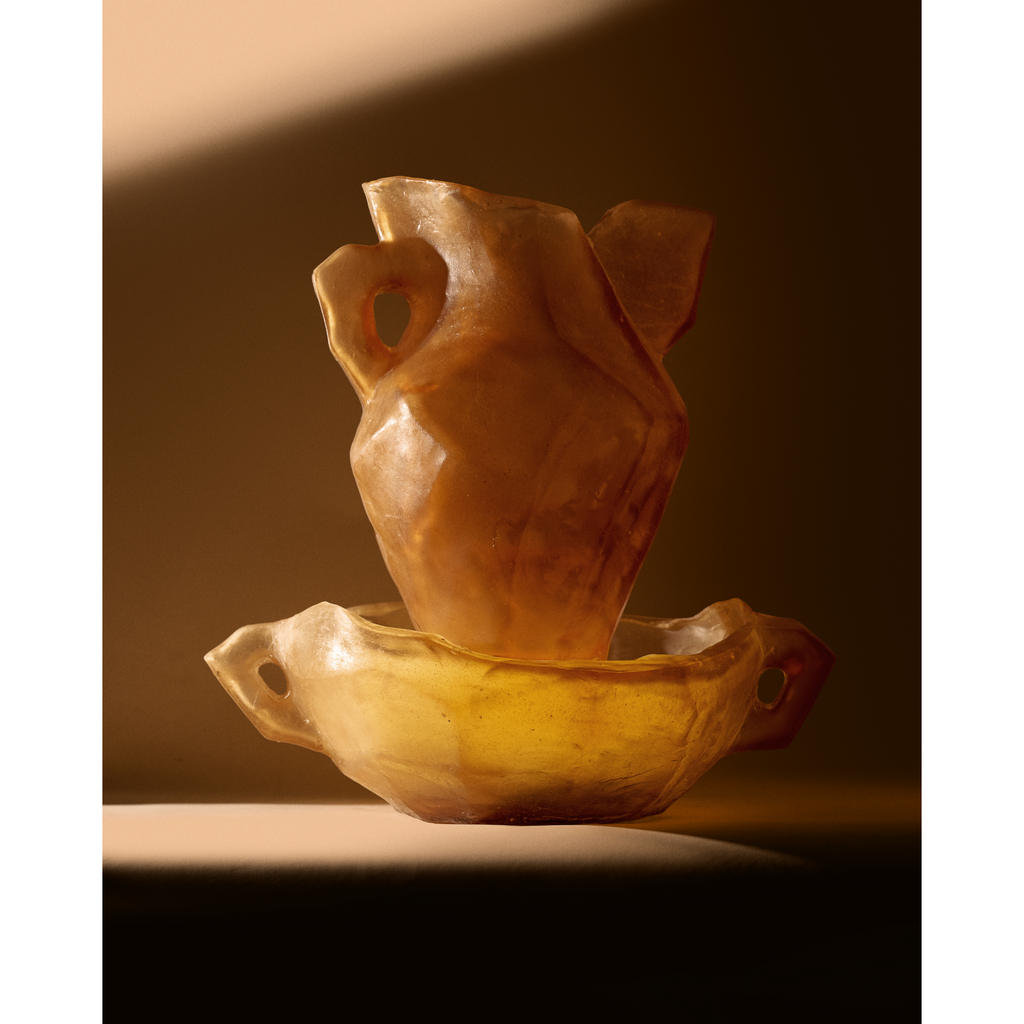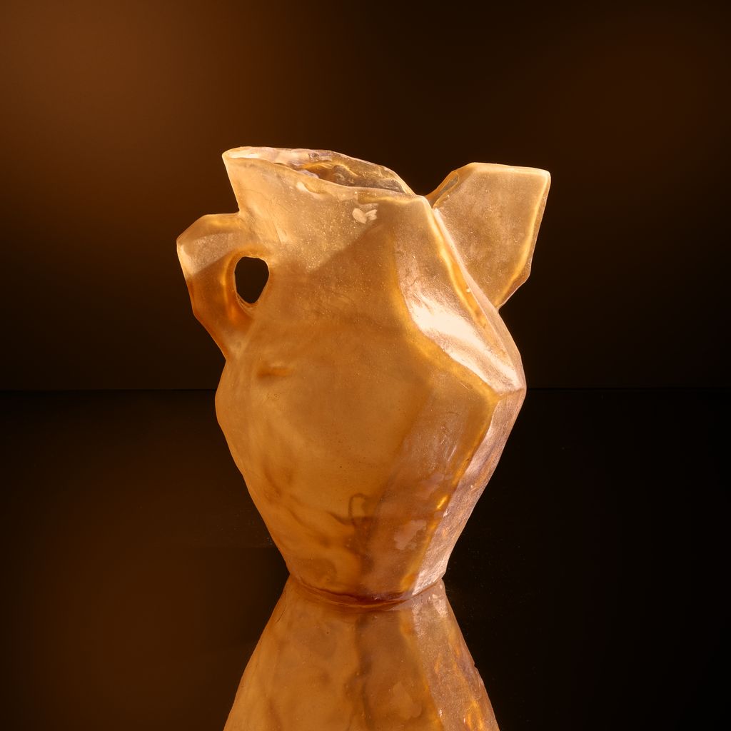 A faceted vessel with a single sculptural “ear,” like a fossilized fragment of dialogue. Its scale and asymmetry make it equally suited for pedestal or floor, anchoring space with quiet power.