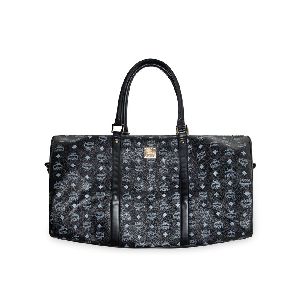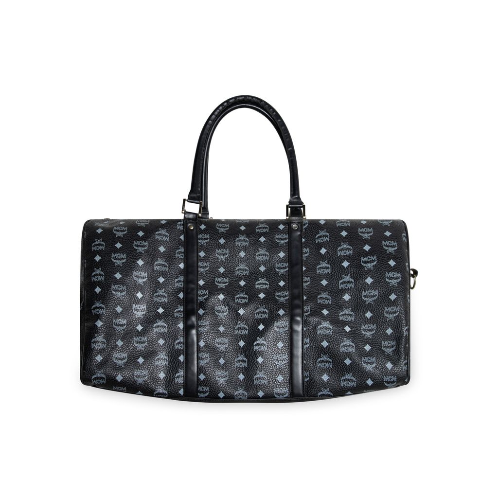 MCM Black Leather Duffel Bag features MCM monogrammed logo print, gold hardware, and 2 straps on top.