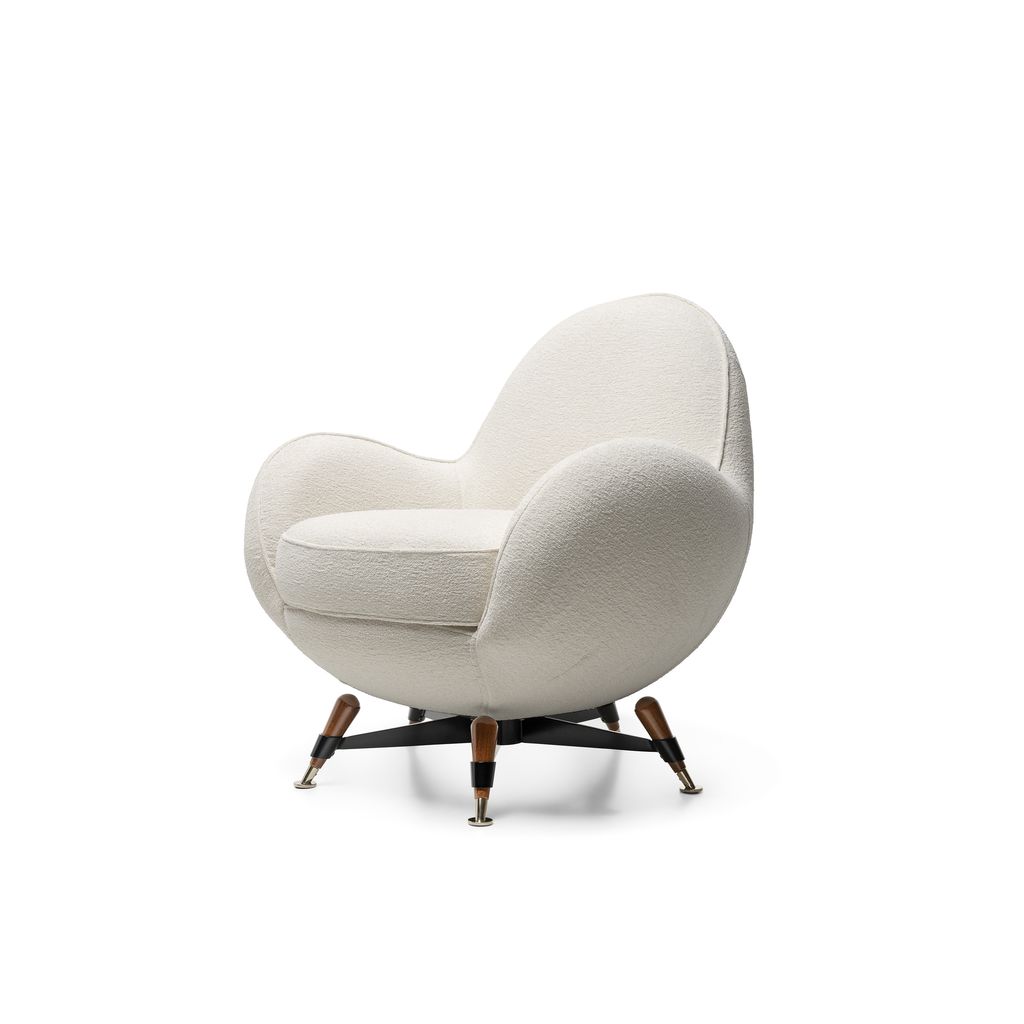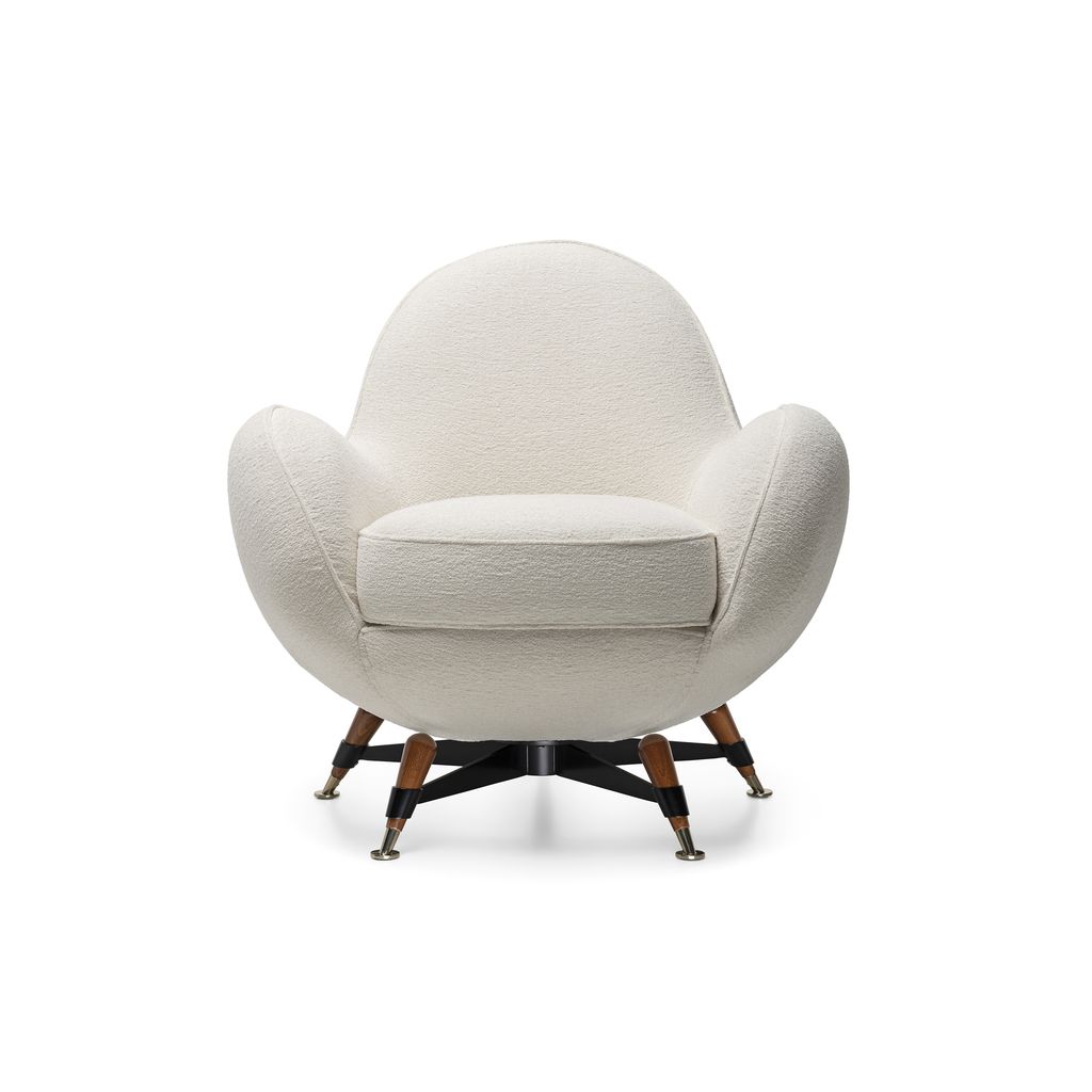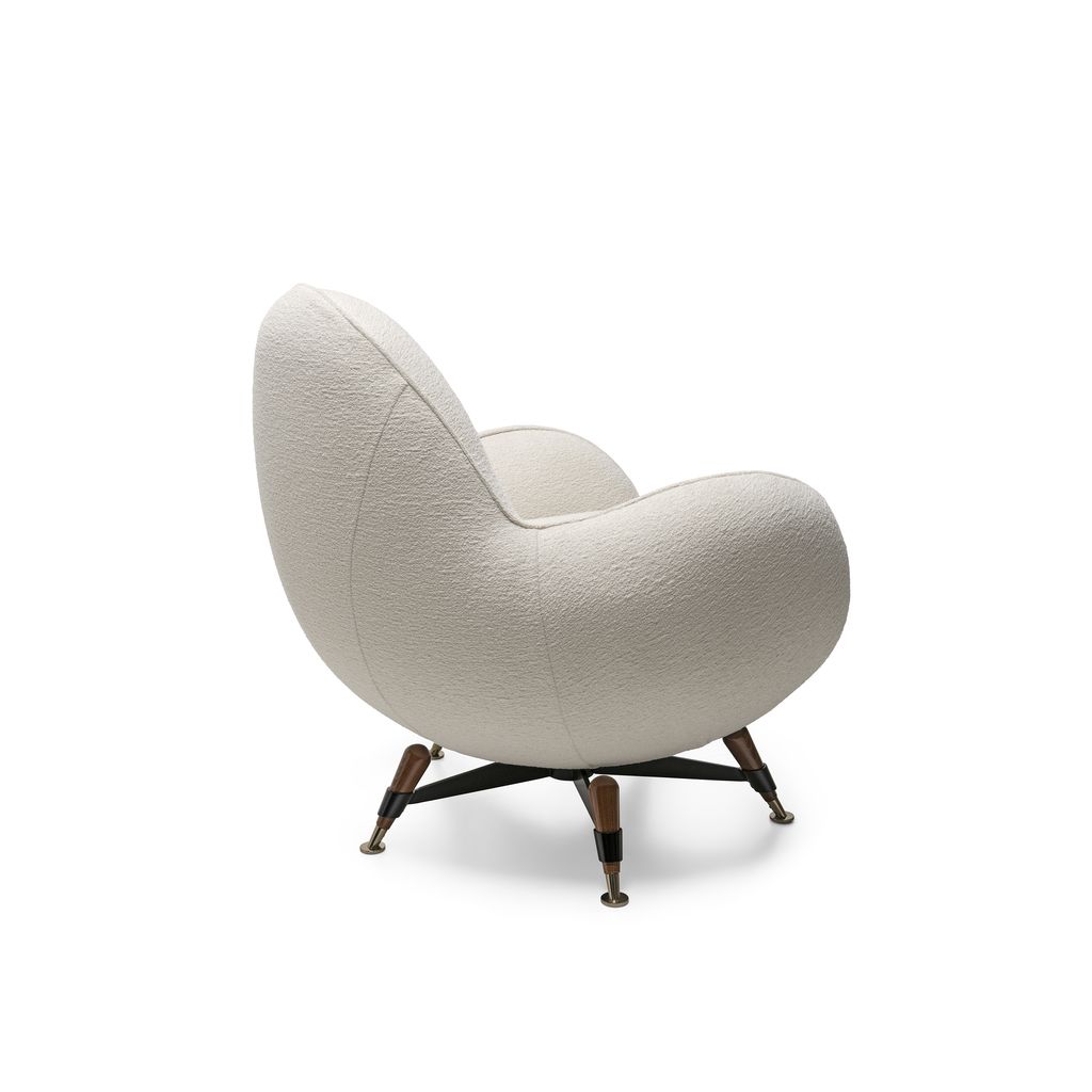 Armchair upholstered in elastic fabric. Main structure in solid wood and plywood. Seat equipped with elastic spring belts. Padding in polyurethane foams with different densities and acrylic fiber. The base consists of a five spokes star in black steel and feet in solid wood with tips in brass lacquered in any colour of the polish metal finish selection.