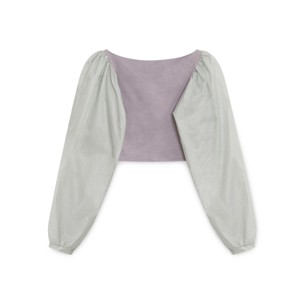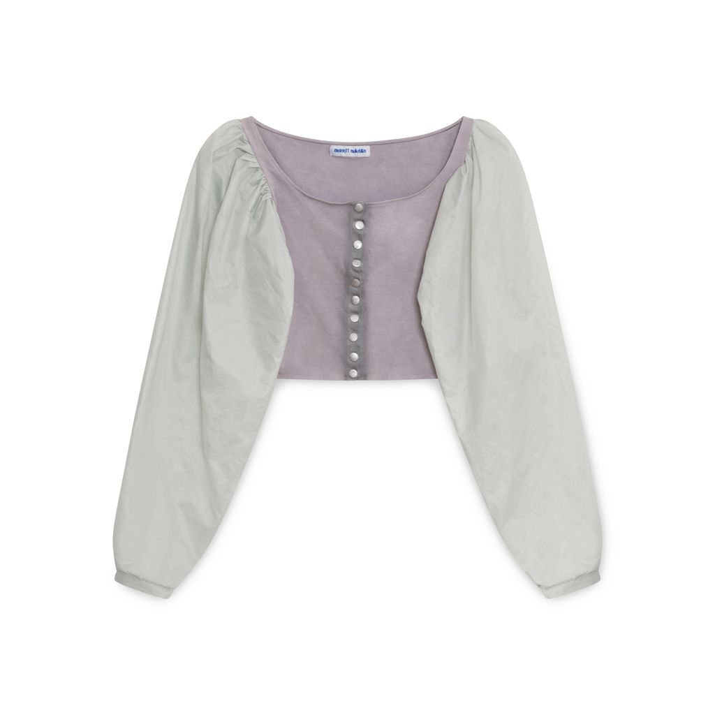 Merritt Meacham Grey Cropped Top features snap-up closure, nylon sleeves.