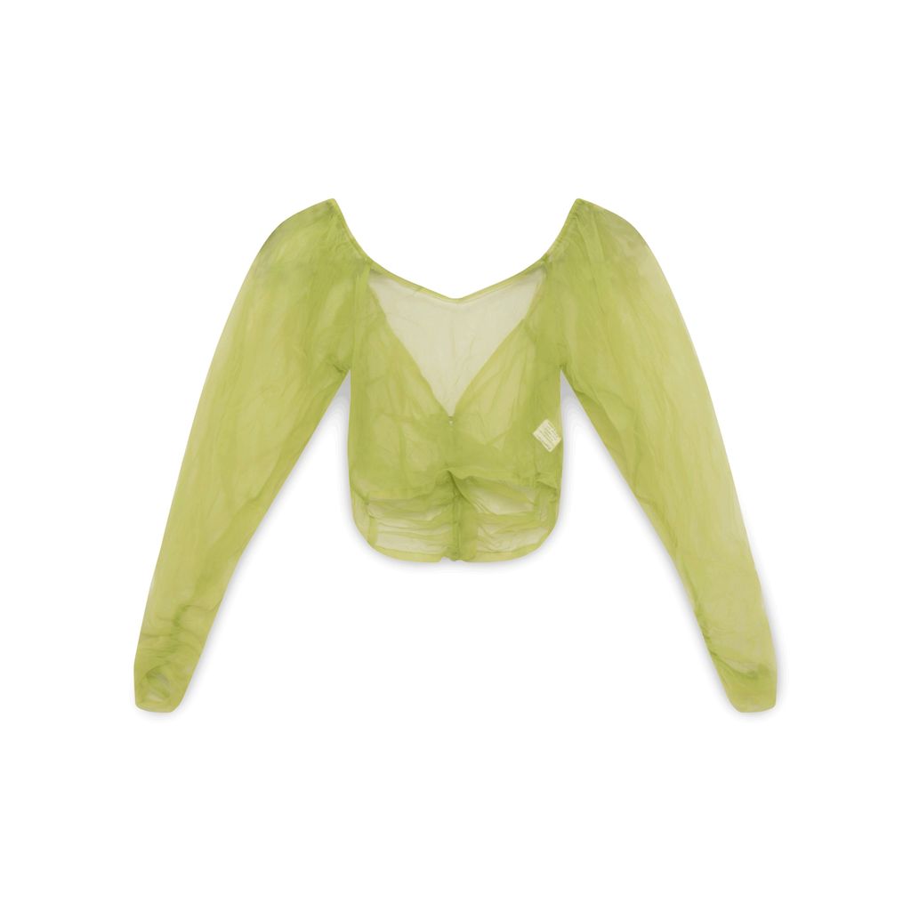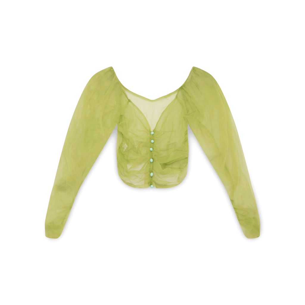 Mesh Long Sleeve Crop Top features button up closure, elastic fit.