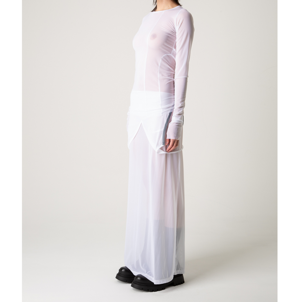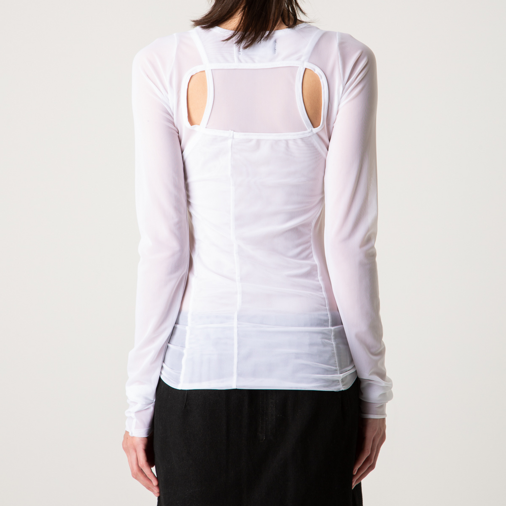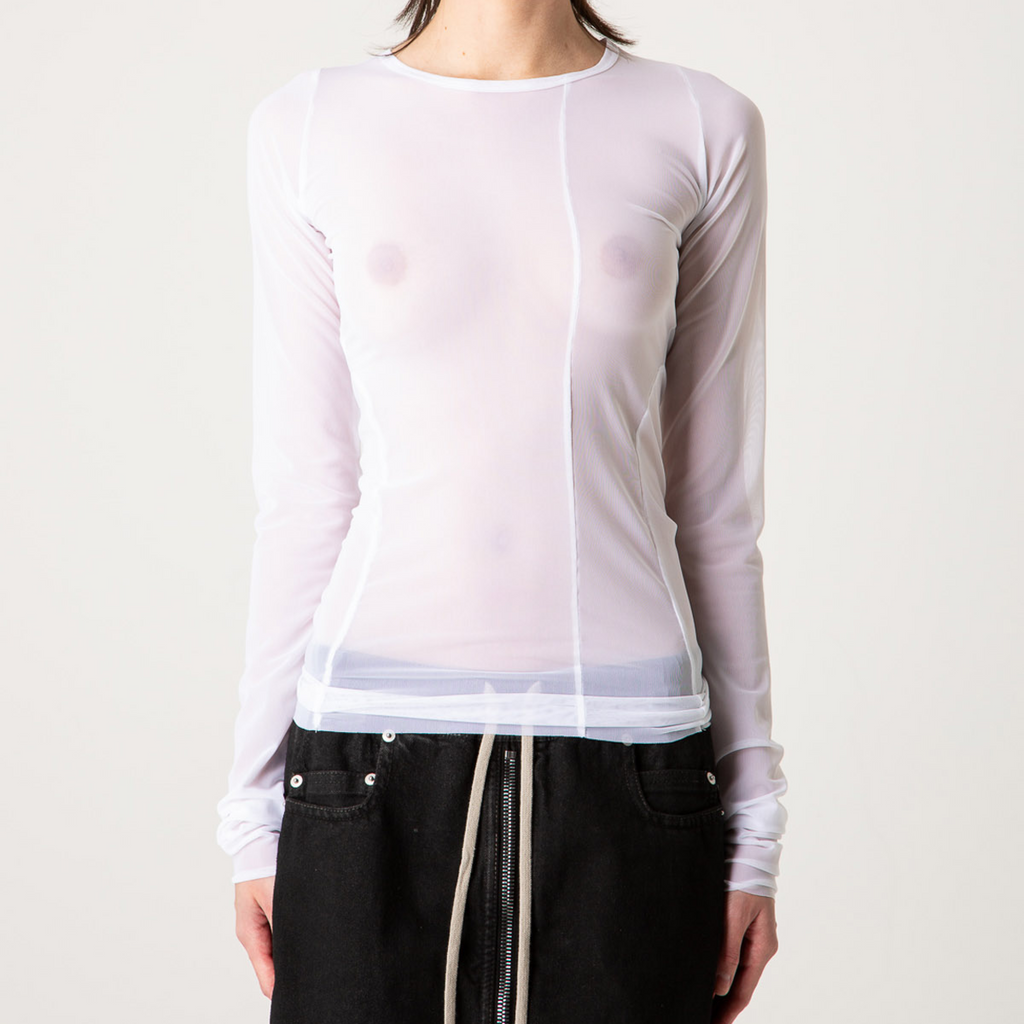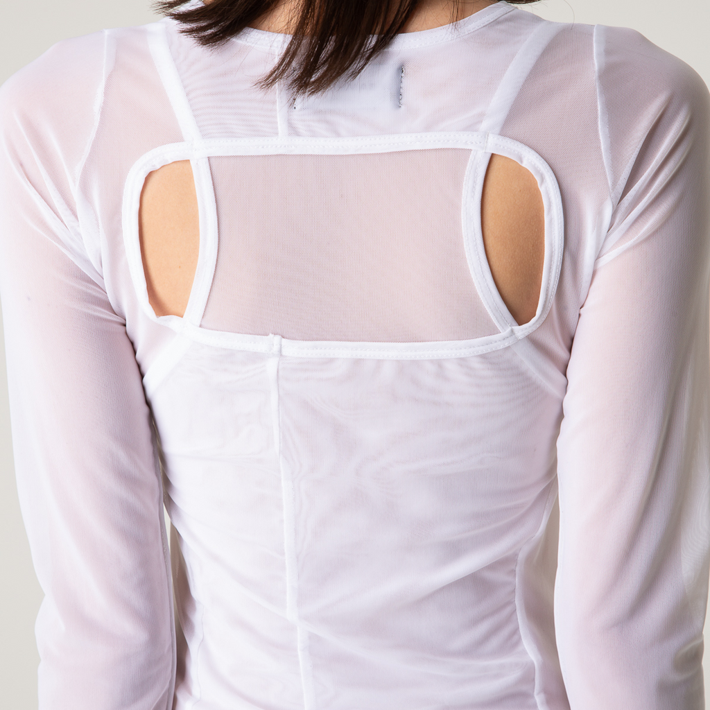 This window tee is made from a 4x4 100% nylon power mesh. It is accentuated with an asymmetric seam down the front and back pane, arched side panels, sewn in tank insert, and trademark Dreamhouse bound window. All orders are made to order.