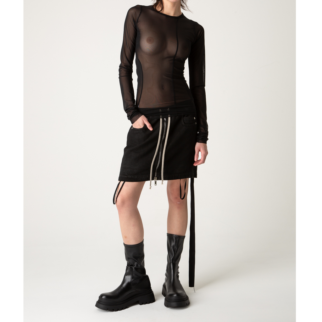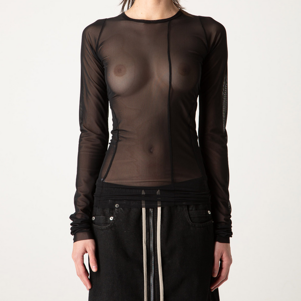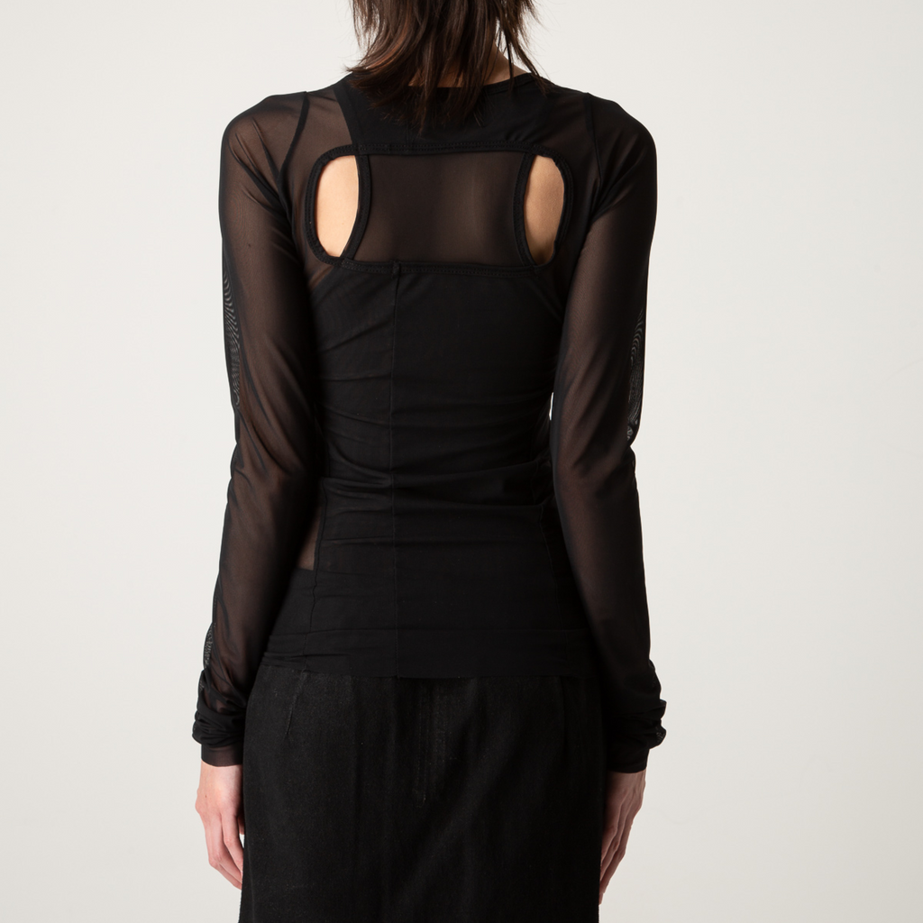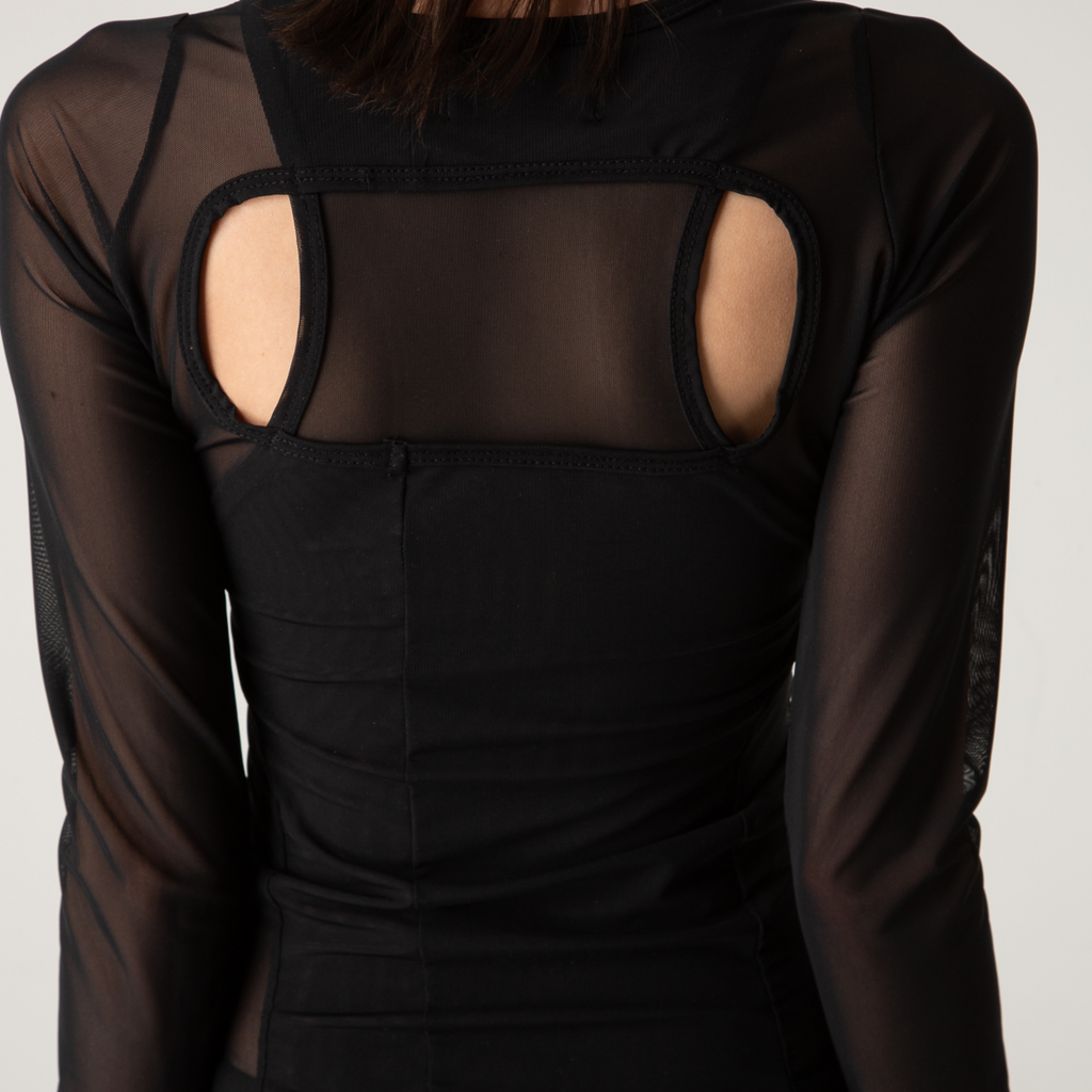 This window tee is made from a 4x4 100% nylon power mesh. It is accentuated with an asymmetric seam down the front and back pane, arched side panels, sewn in tank insert, and trademark Dreamhouse bound window. All orders are made to order.