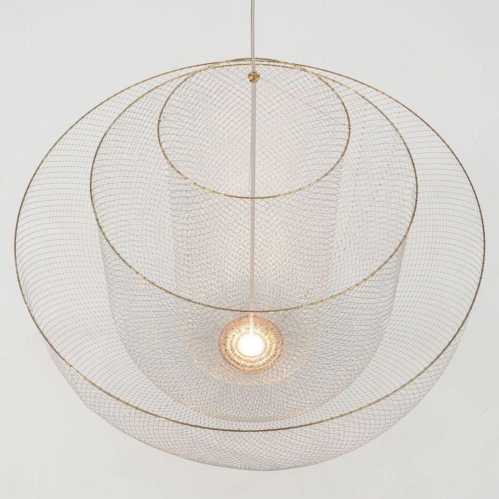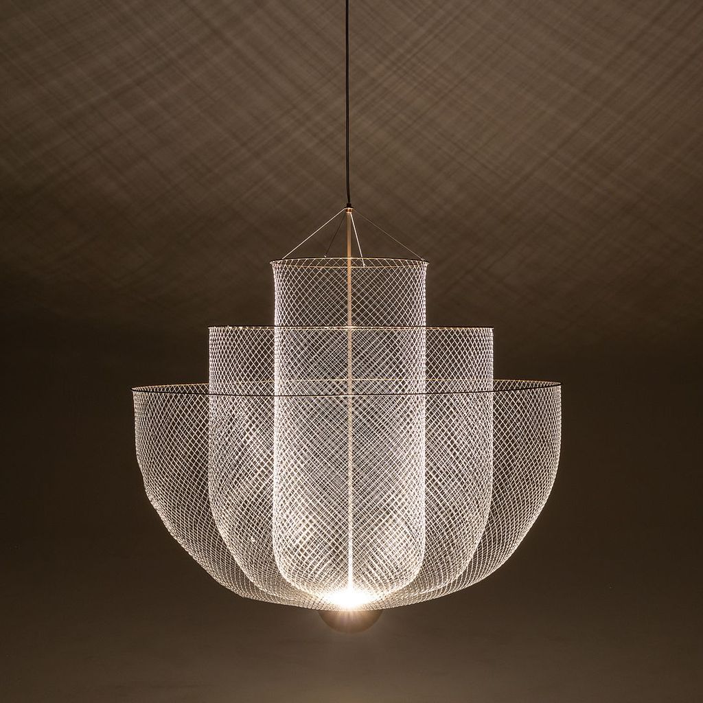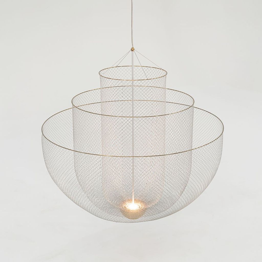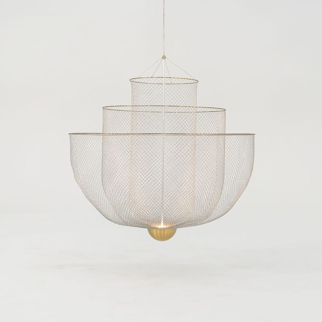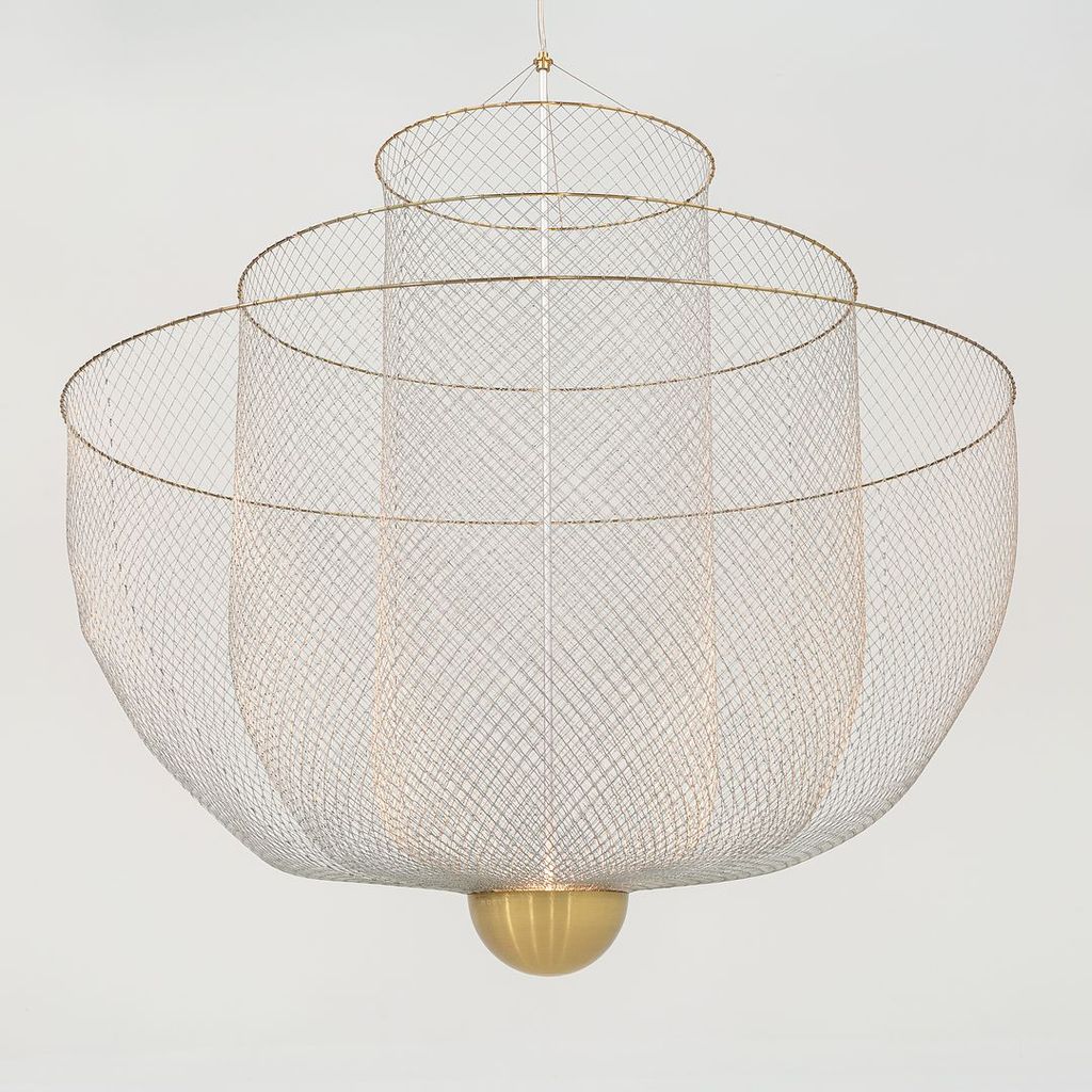 Listed for sale is a large Meshmatics Chandelier made of galvanized steel and brass. The lamp was designed by Rick Tegelaar and produced by Moooi in the Netherlands. It dates to circa 2022 and is guaranteed as authentic. Condition is excellent without notable signs of wear. See photos