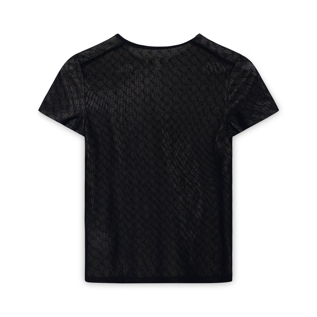 Miaou Mini Tee features semi-sheer mesh overlay, all-over logo detail, and cap sleeves.