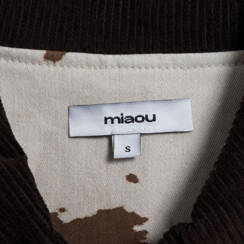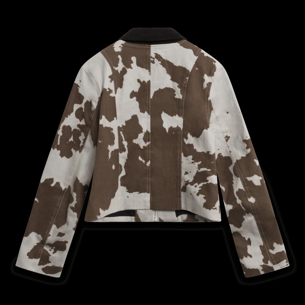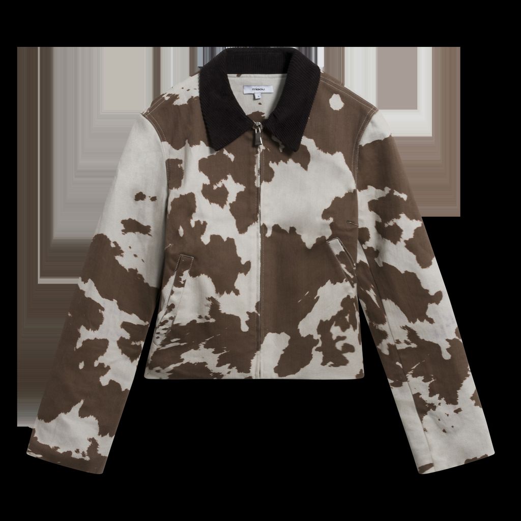 This cropped denim jacket from Miaou features a kitschy cow print, corduroy lined collar, front zipper closure, and front slit pockets. Gently worn, in good condition.