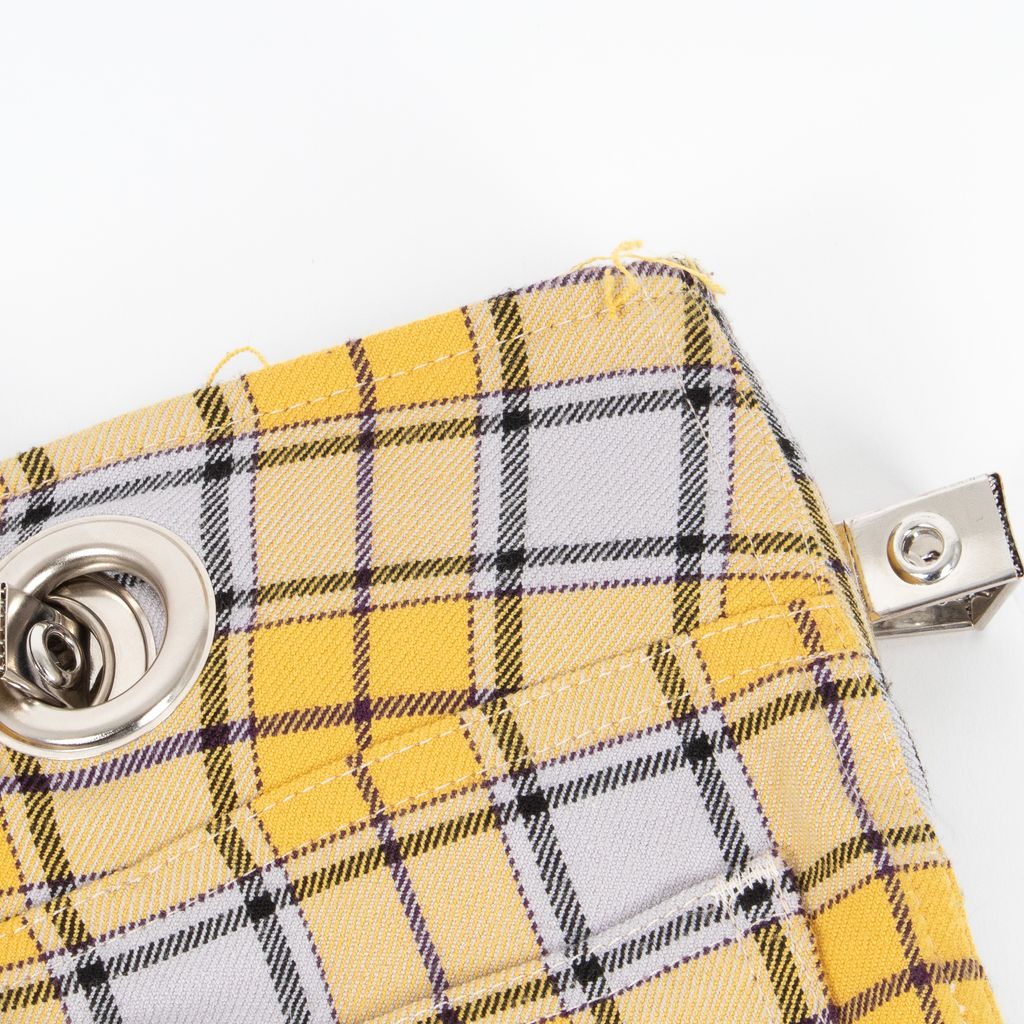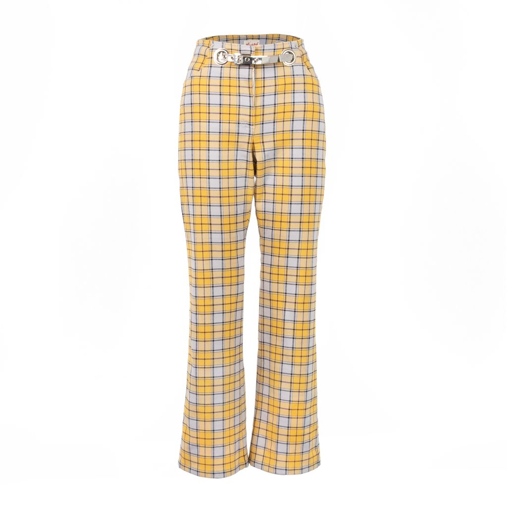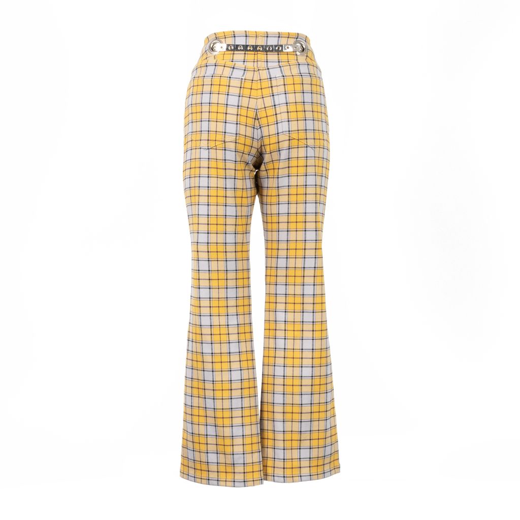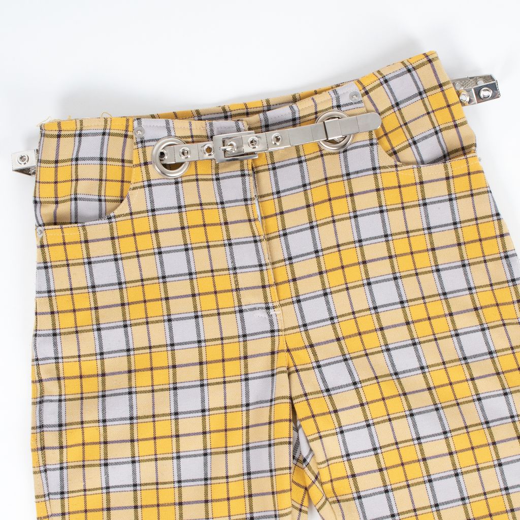A modern cut mixed with a mod era pattern makes for a super cute ensemble in the form of these plaid pants from Miaou. Features all over yellow plaid print, removable metal belt, grommets on front and back for belt threading, sets of front and back pockets, kick flare leg silhouette, zip and slide front closure, and minor signs of wear. Signs of wear include thread pulling near waist as photographed.