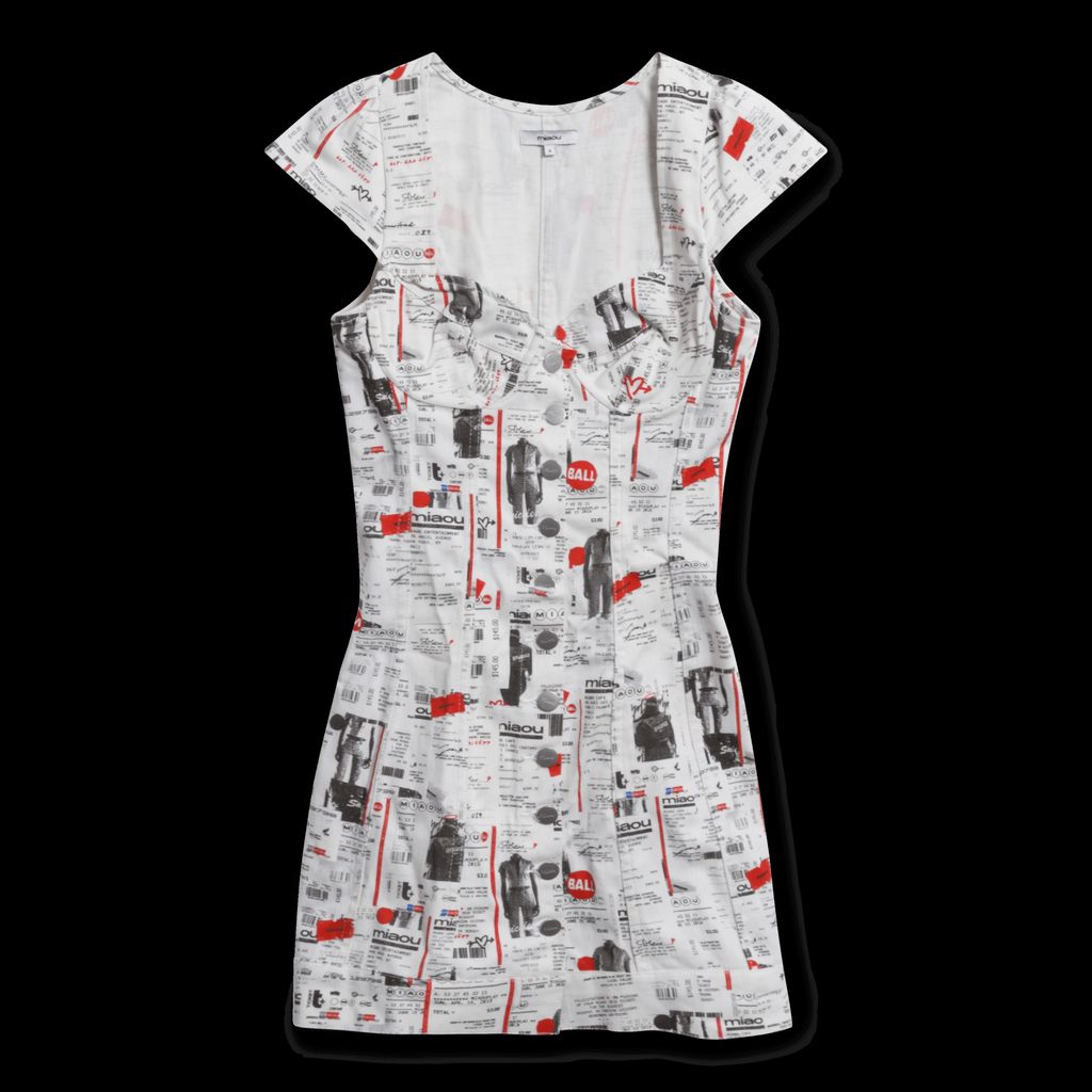 Make headlines in this denim newsprint dress from Miaou- Cut for a slim fit, this number features button front closures, underwire full cup and flirty caps sleeves. Gently worn, in good condition.