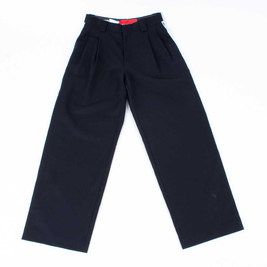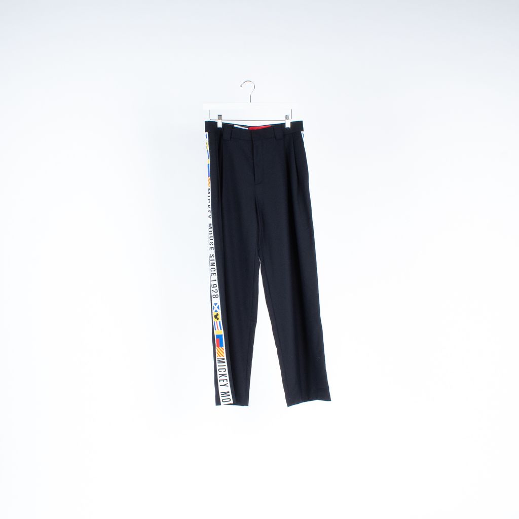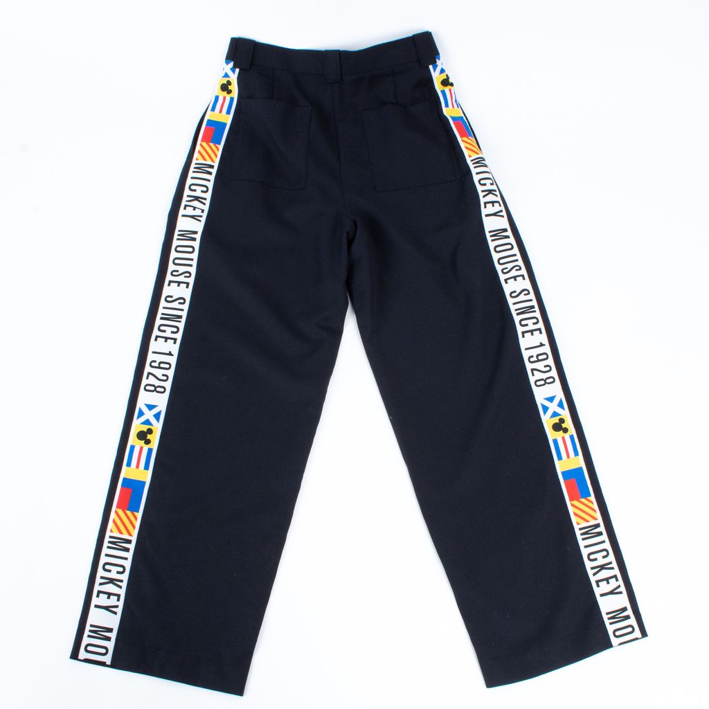 Fun and funky, these side striped pants features a famous childhood favorite...Mickey Mouse! Features Mickey Mouse flag detail stripe down both legs, large back pockets, front pleating at waist, relaxed fit straight leg silhouette, and zip and slide closure. Size is not listed, refer to measurements for exact fit.