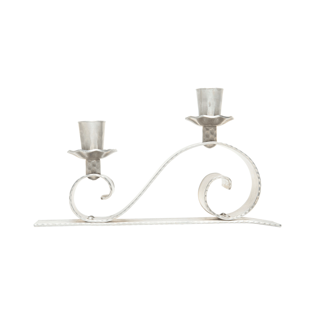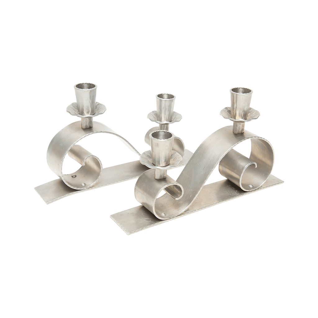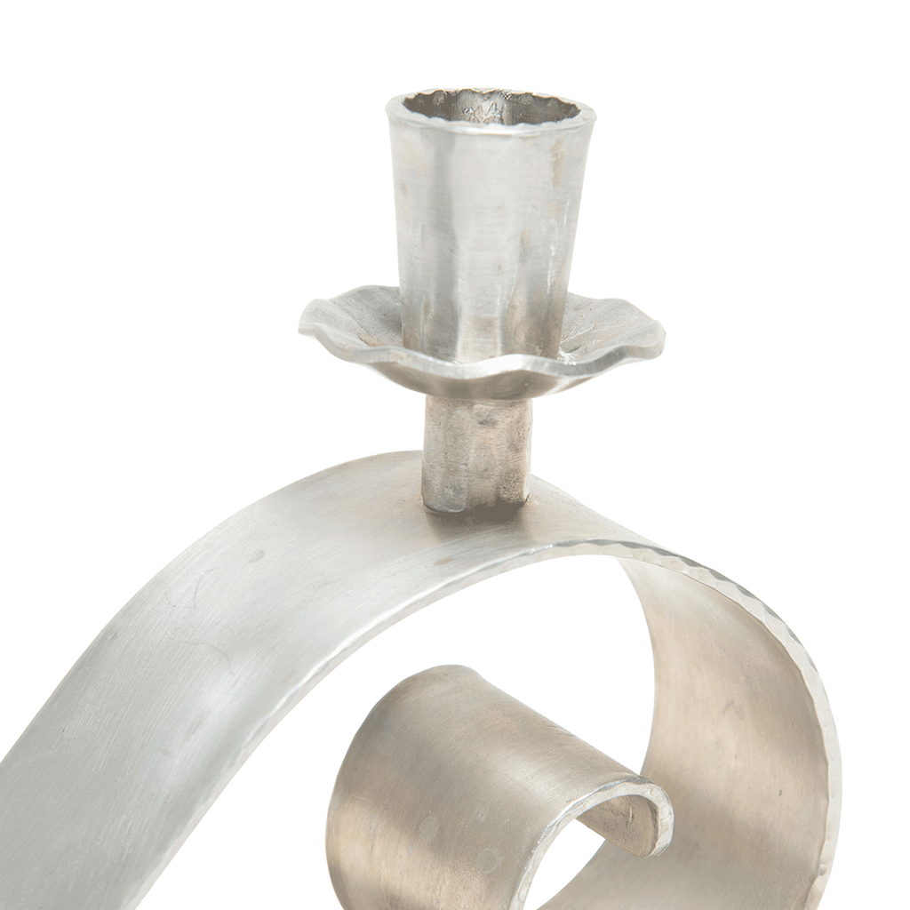 Midcentury Hand-Forged Candle Holders are a pair of midcentury hand-forged aluminum candle holders. They are stamped and feature swirl shape with hammered details on the base and candle cups.