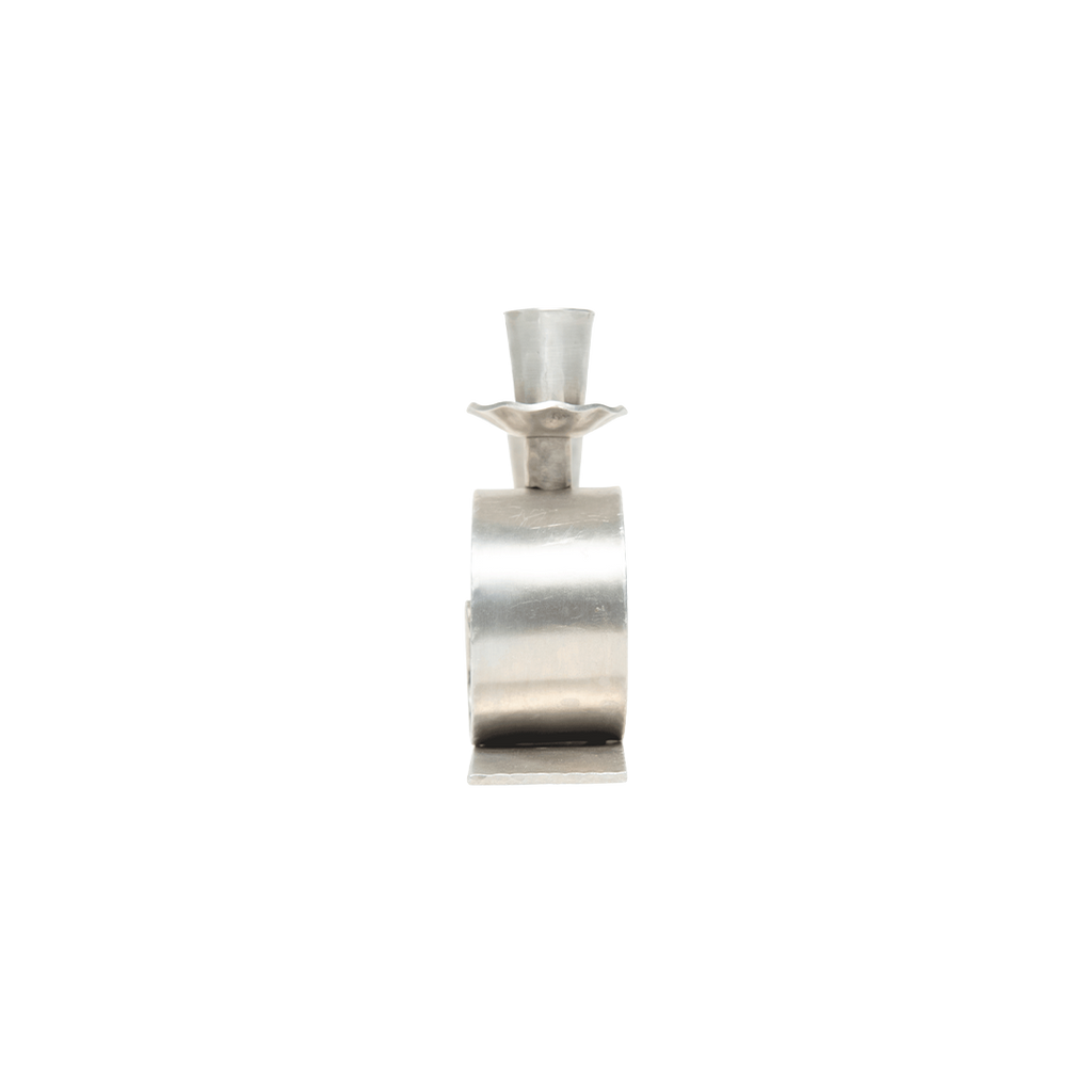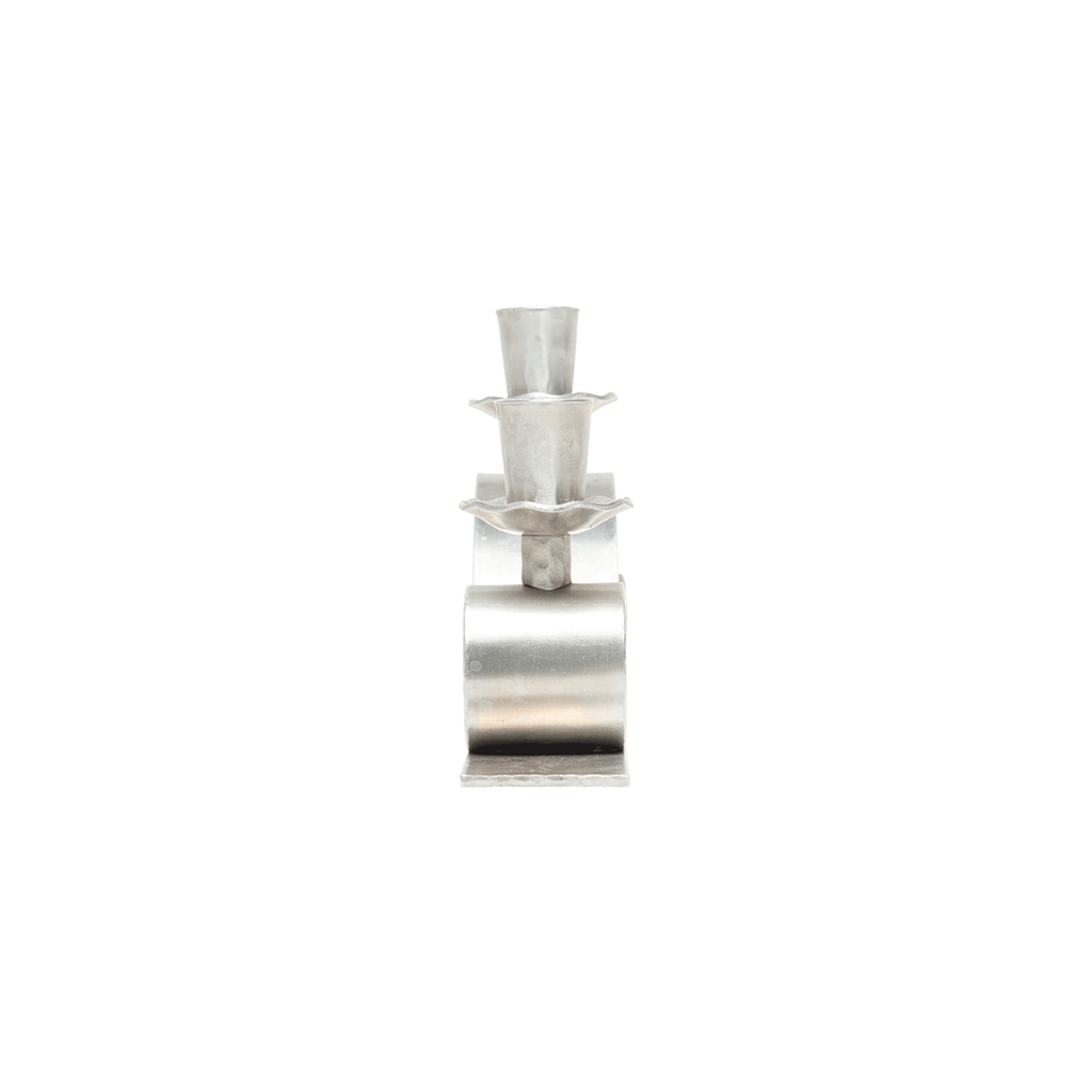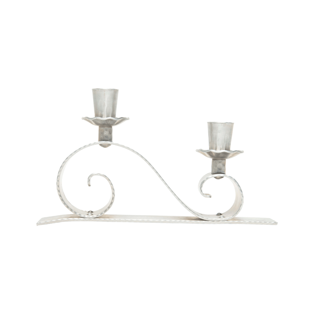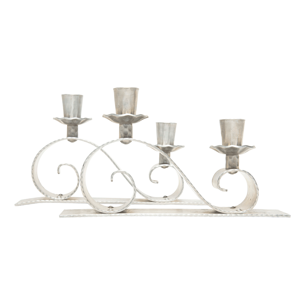 Midcentury Hand-Forged Candle Holders are a pair of midcentury hand-forged aluminum candle holders. They are stamped and feature swirl shape with hammered details on the base and candle cups.