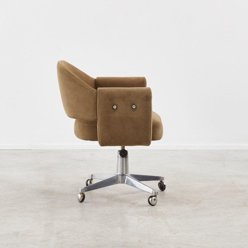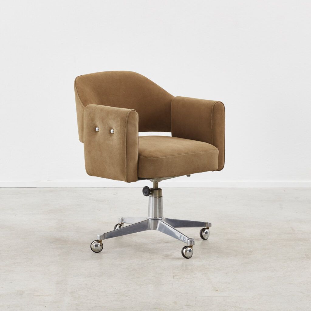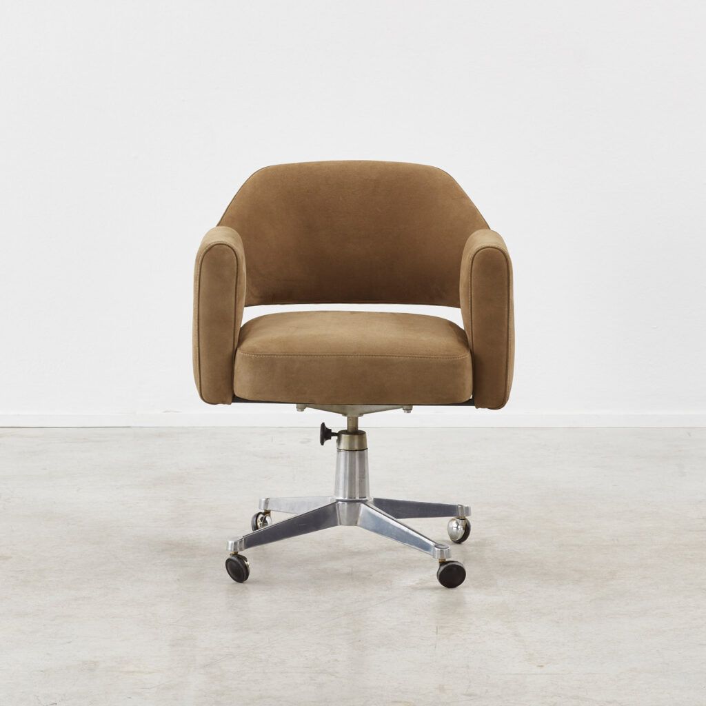 Reminiscent of Eero Saarinen’s influential Conference design, these substantial swivel desk chairs wrap the sitter in padded leather. Generous rectangular armrests with an unusual double stud detail connect the curved backrest and seat, while steel swivel casters provide practical movement.