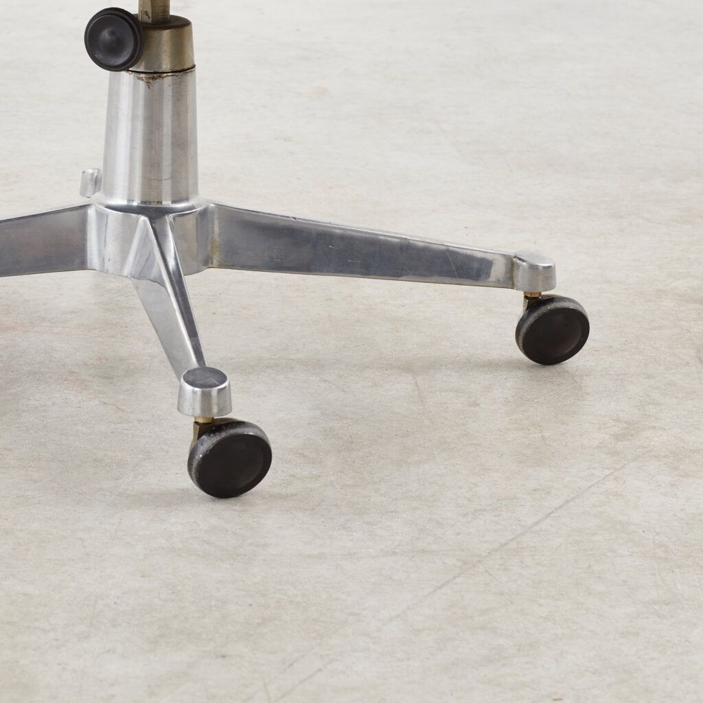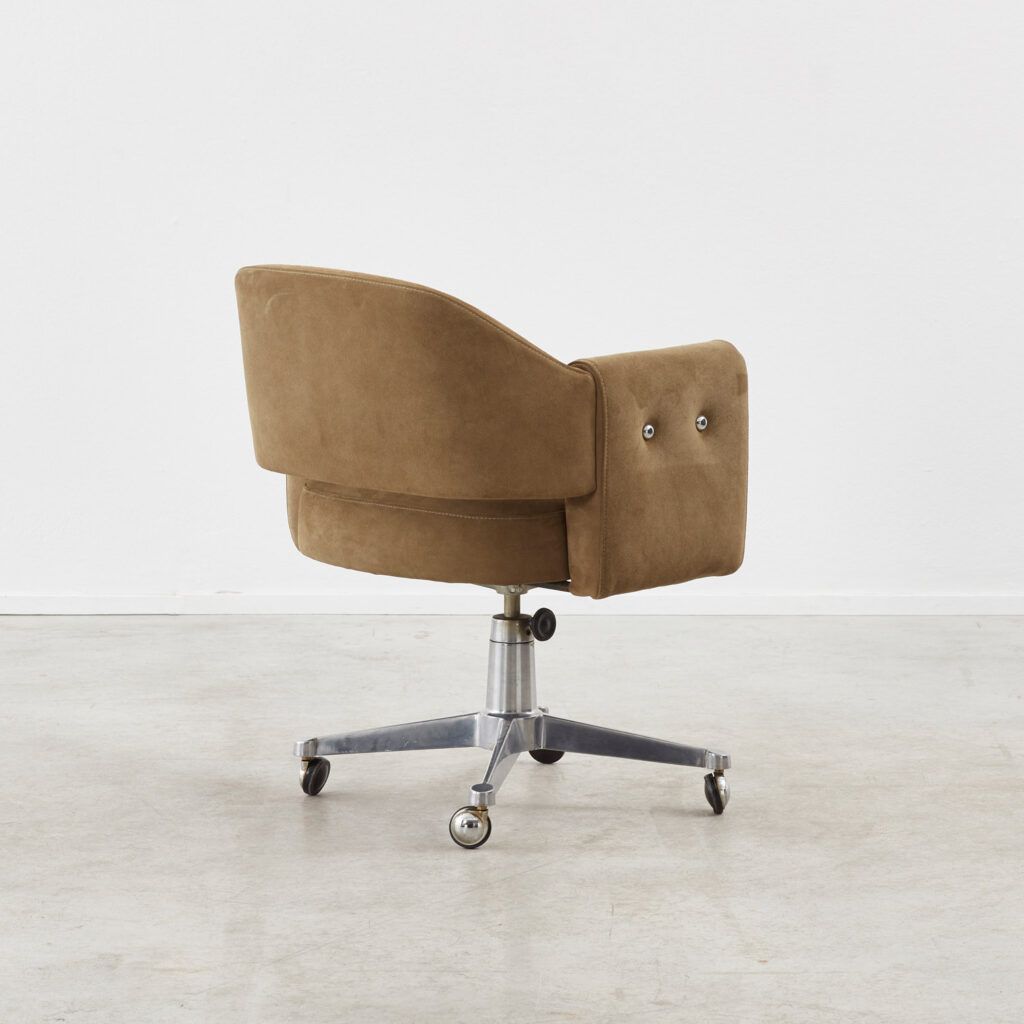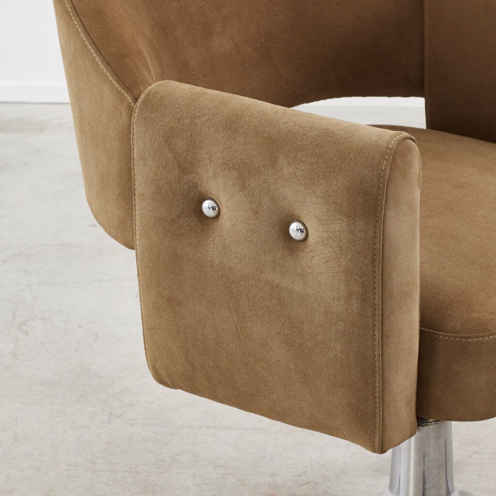 Reminiscent of Eero Saarinen’s influential Conference design, these substantial swivel desk chairs wrap the sitter in padded leather. Generous rectangular armrests with an unusual double stud detail connect the curved backrest and seat, while steel swivel casters provide practical movement.