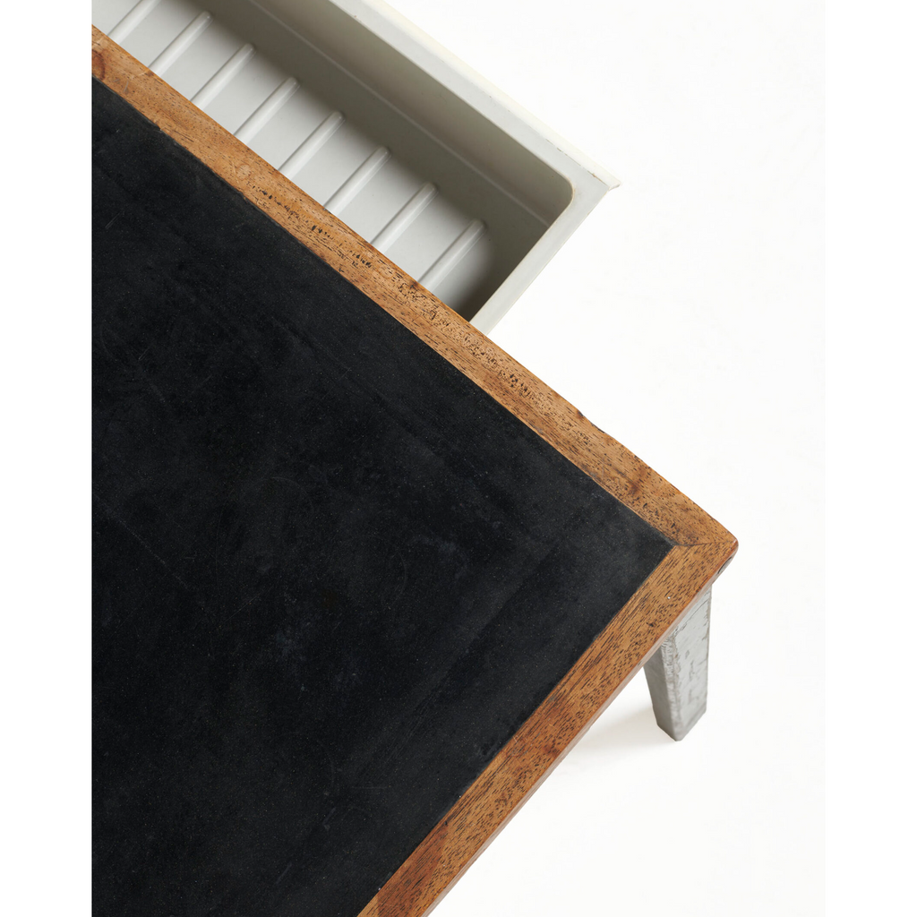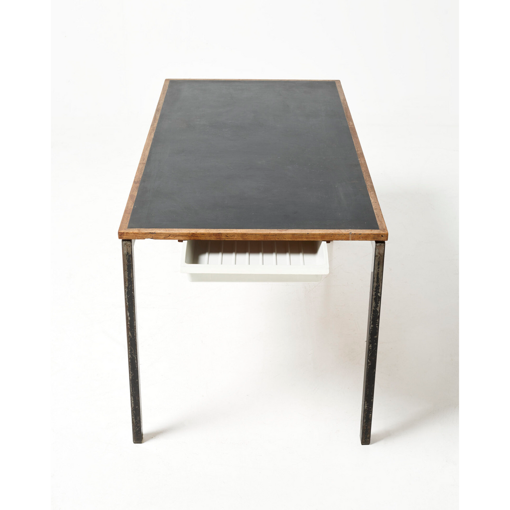Rectangular shape, in wood, with a linoleum-covered top in the center, resting on steel feet with a drawer on one side.