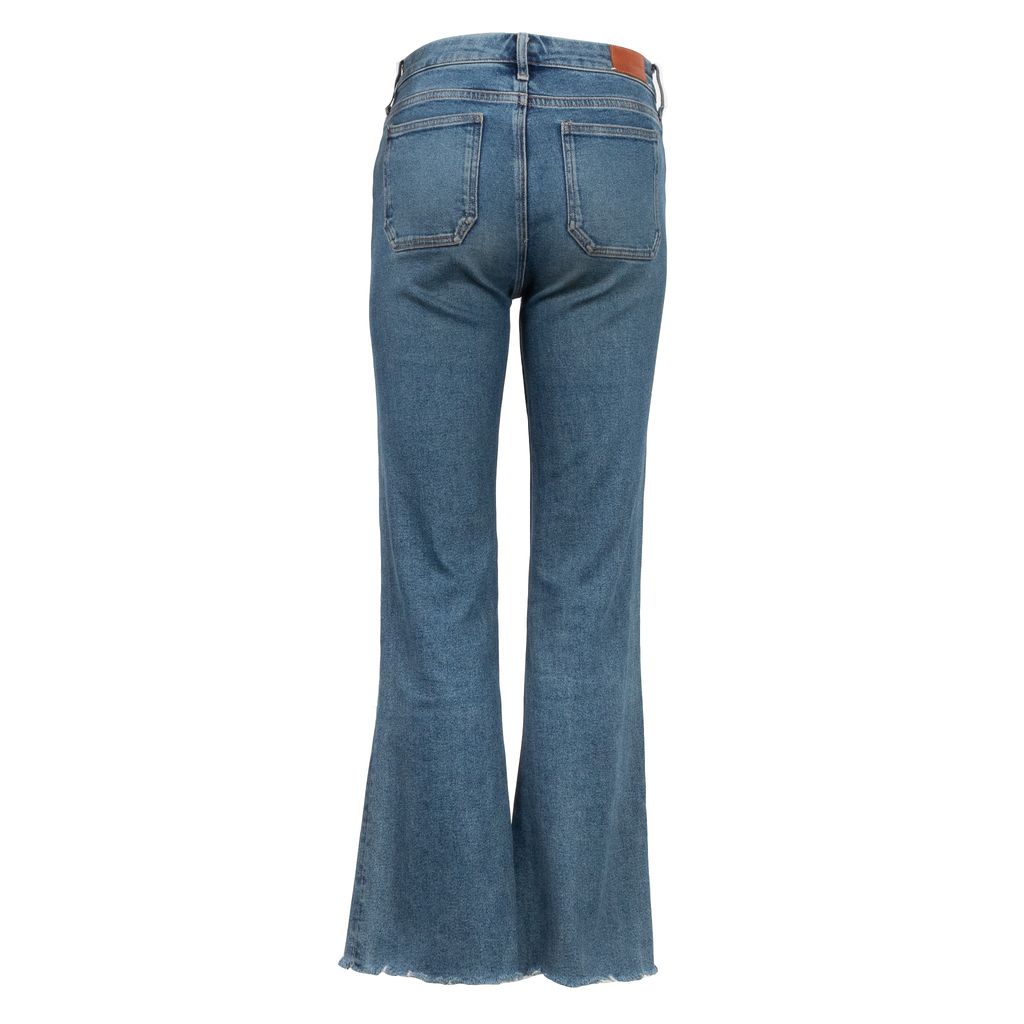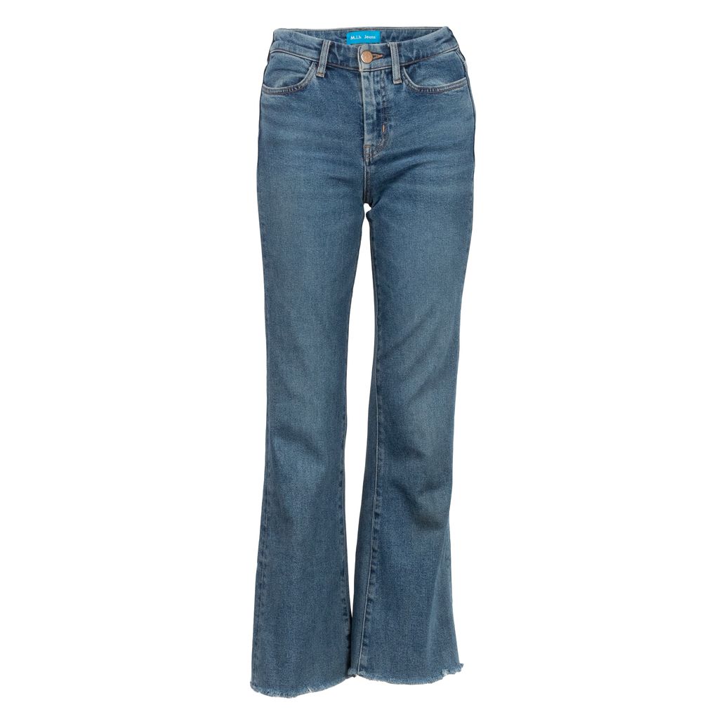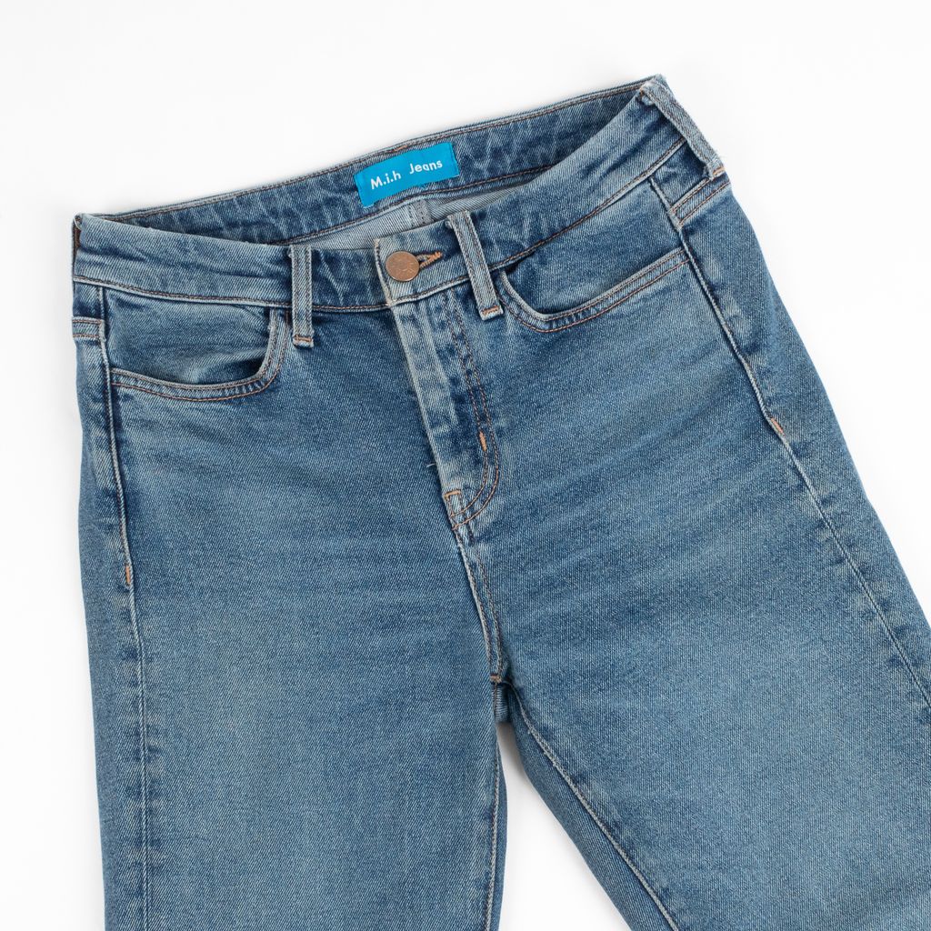 A modernized take on a 70's icon, these jeans from M.i.h are a faded blue dream with a fitted, feminine feel. Features high rise waist, straight leg silhouette with a cropped and flared ankle, Japanese denim fabrication with natural fading, zip and button closure, set of pockets in front and back, and M.i.h Jeans leather patch at back waist.