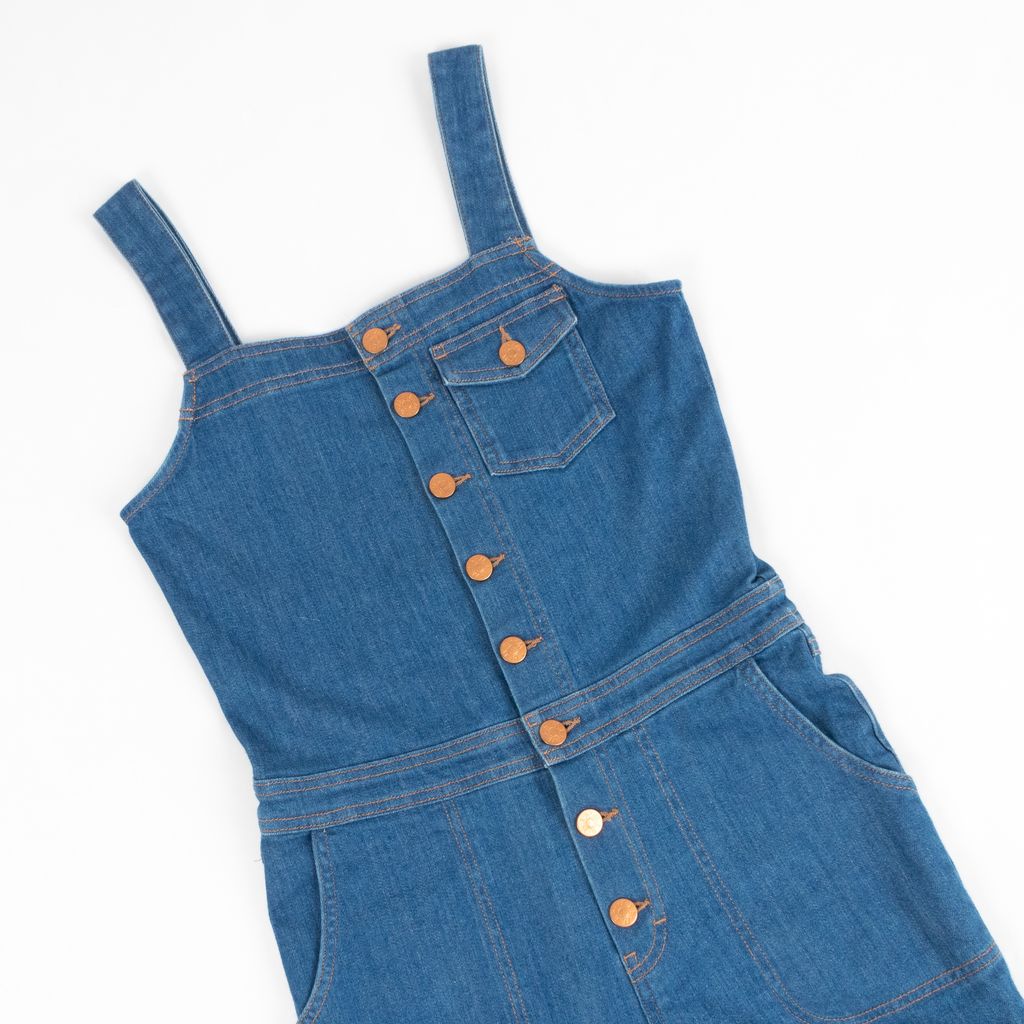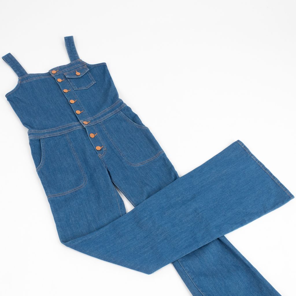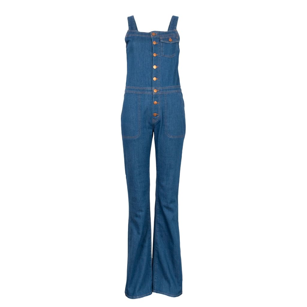 London label M.i.h Jeans looked back to its '70s roots when designing these stretch-denim overalls that are flared to give the illusion of longer, slimmer legs. Features apron style front, button front closure, small pocket on chest, side pockets, flared leg, square shaped back, and set of butt pockets.