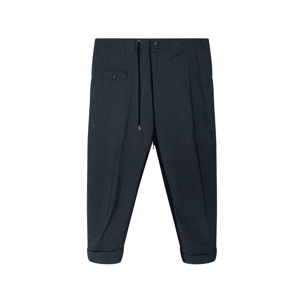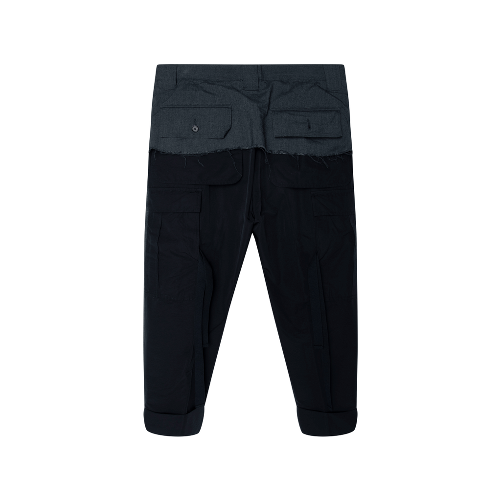 Mihara Yasuhiro Two Toned Deconstructed Pant feature draw string waist, front button closure, two front pockets, two back button closure pockets, two cargo pockets, and deconstructed detail in the back.