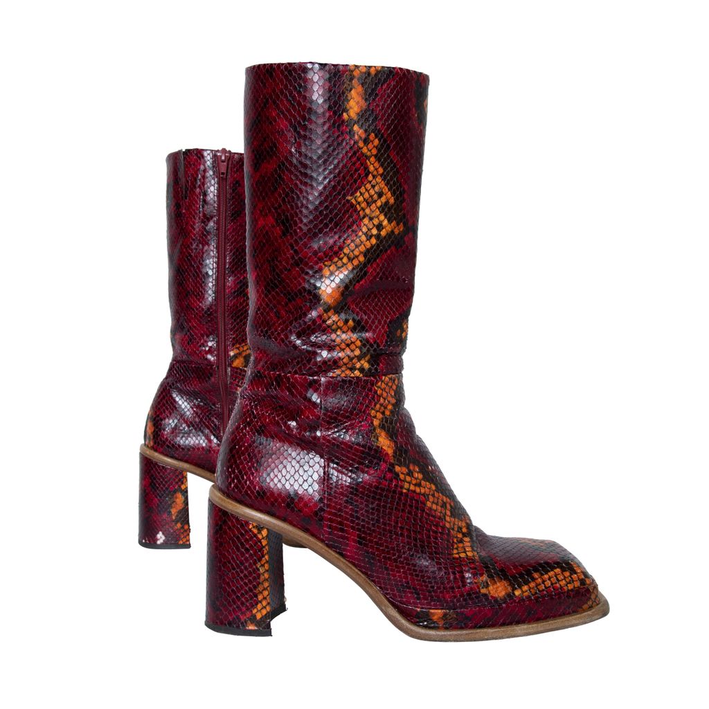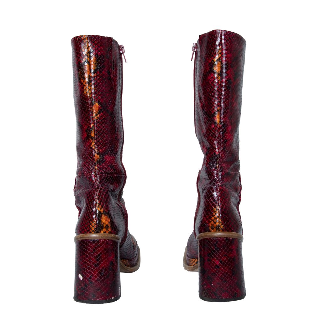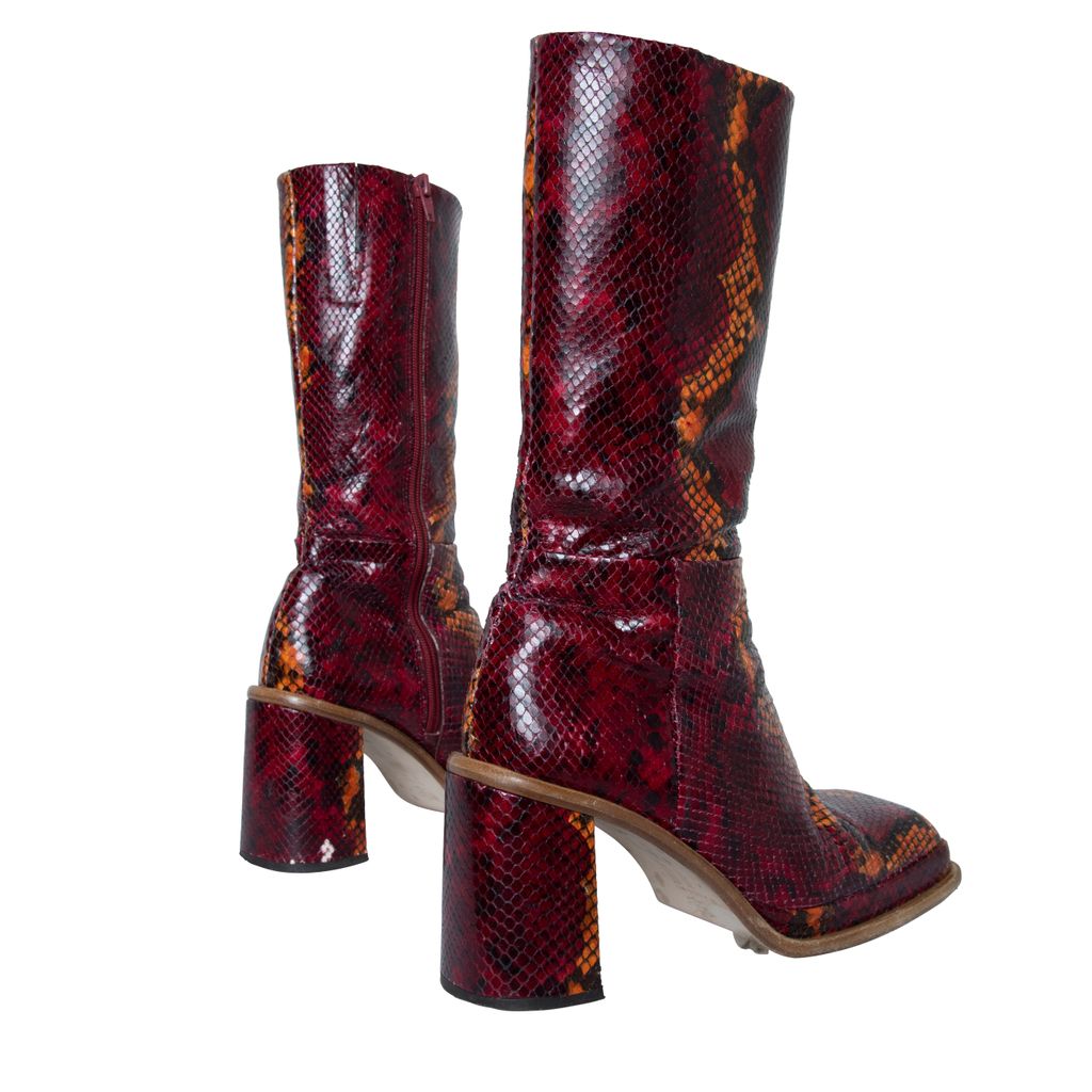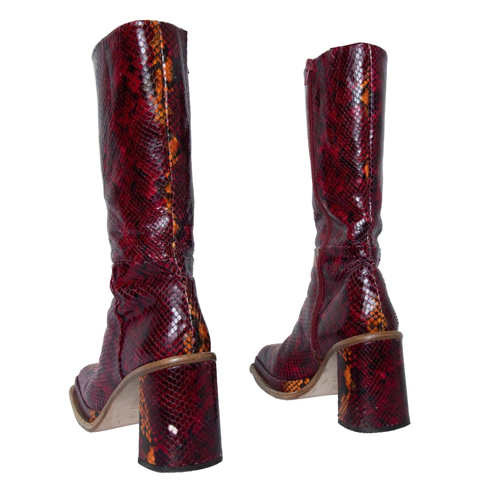 Miista Abril Red Boots features mid-calf, platformed, and square toe.