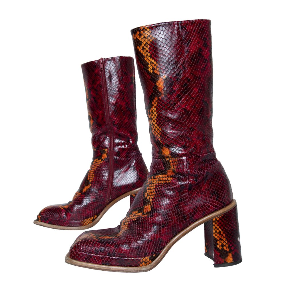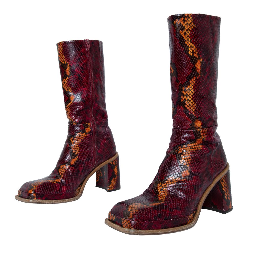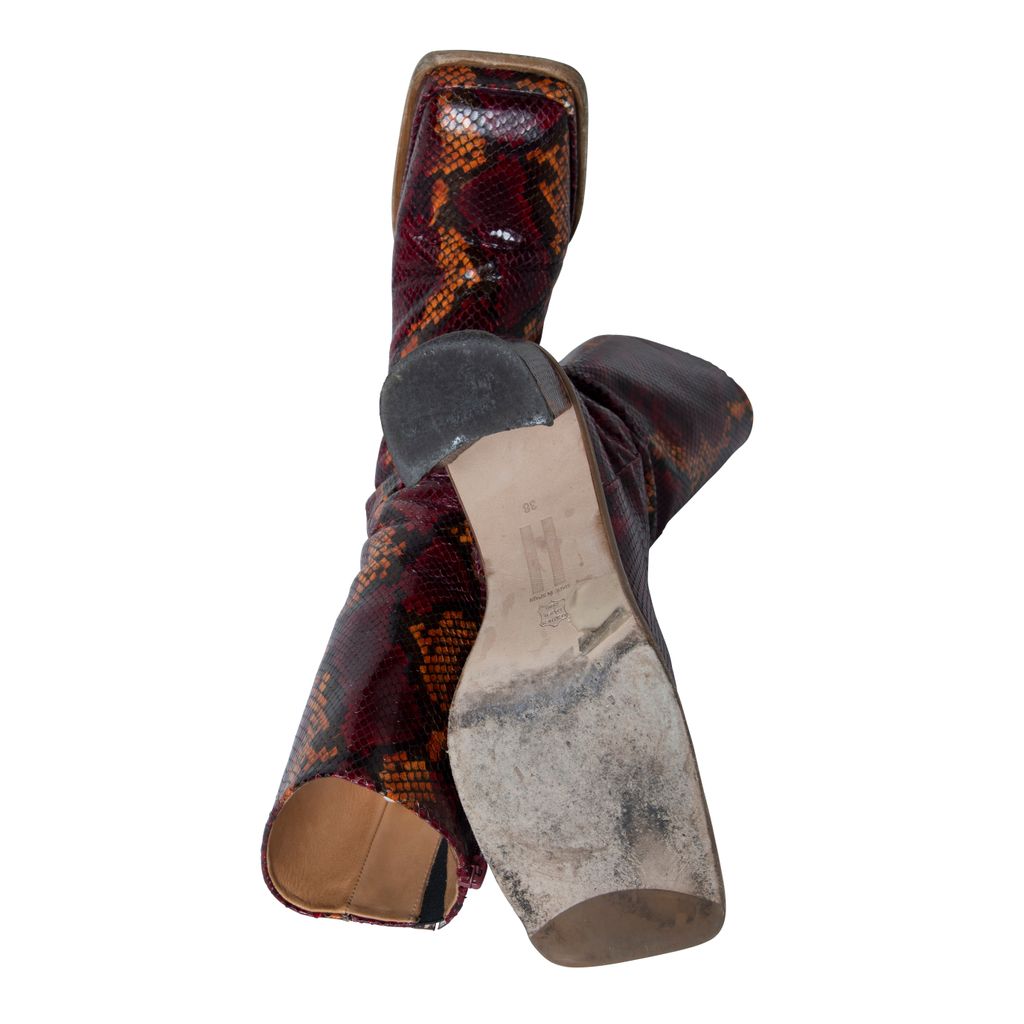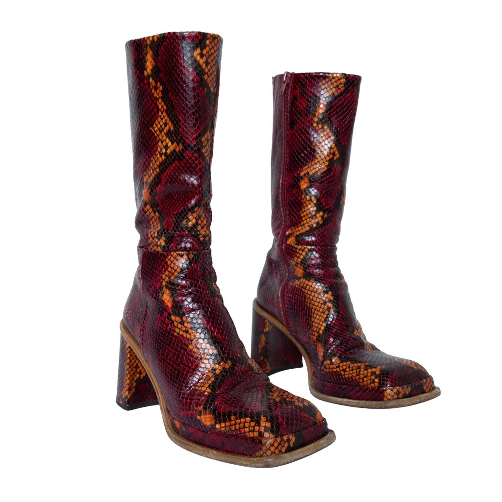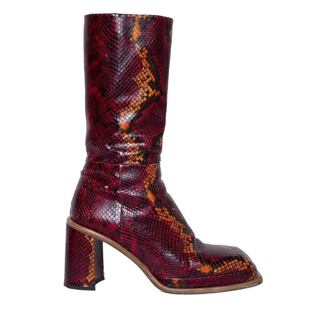 Miista Abril Red Boots features mid-calf, platformed, and square toe.