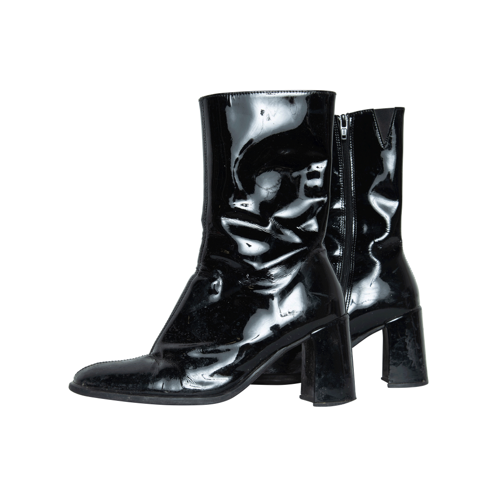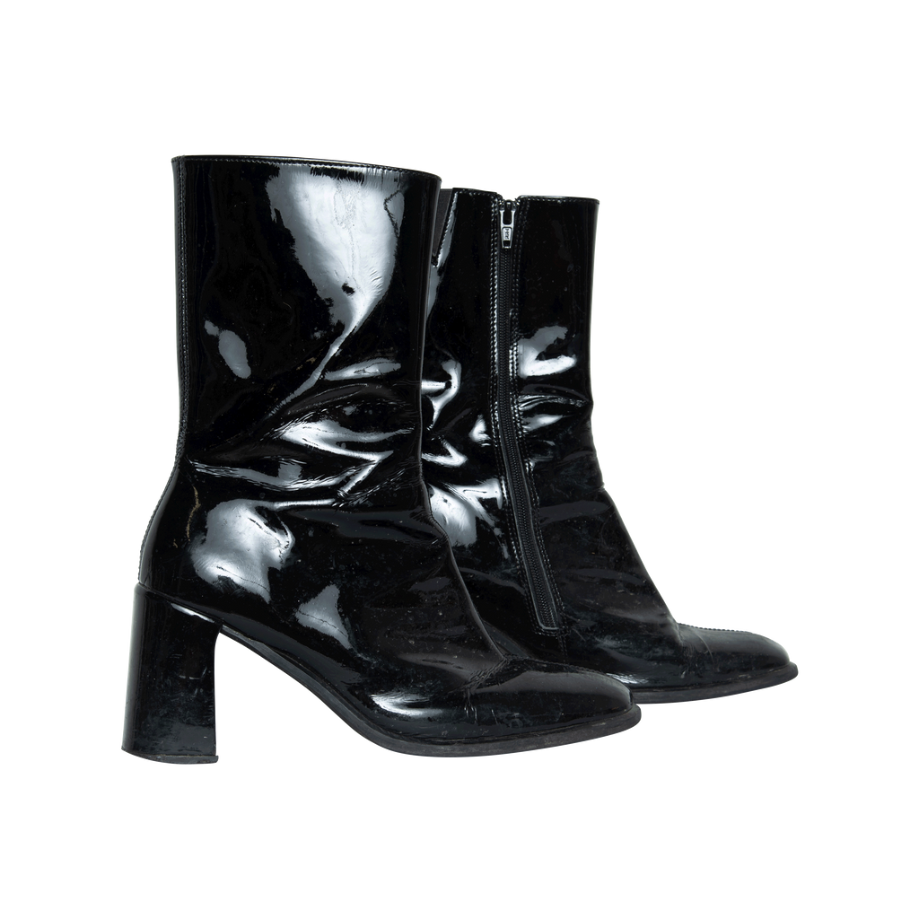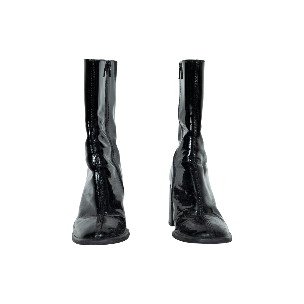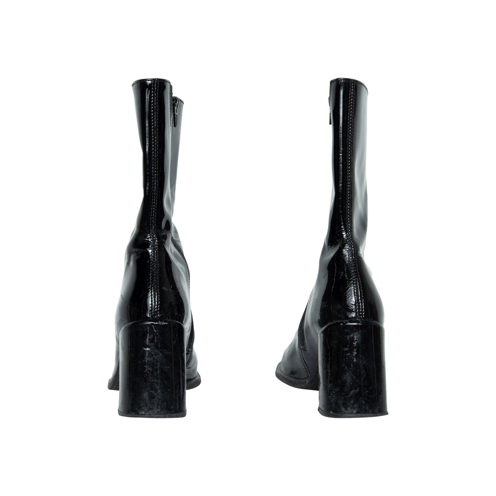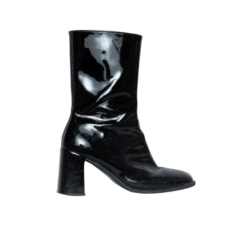 Miista E8 Black Patent Leather Boots features block heel, inner zip closure, and slight square toe.
