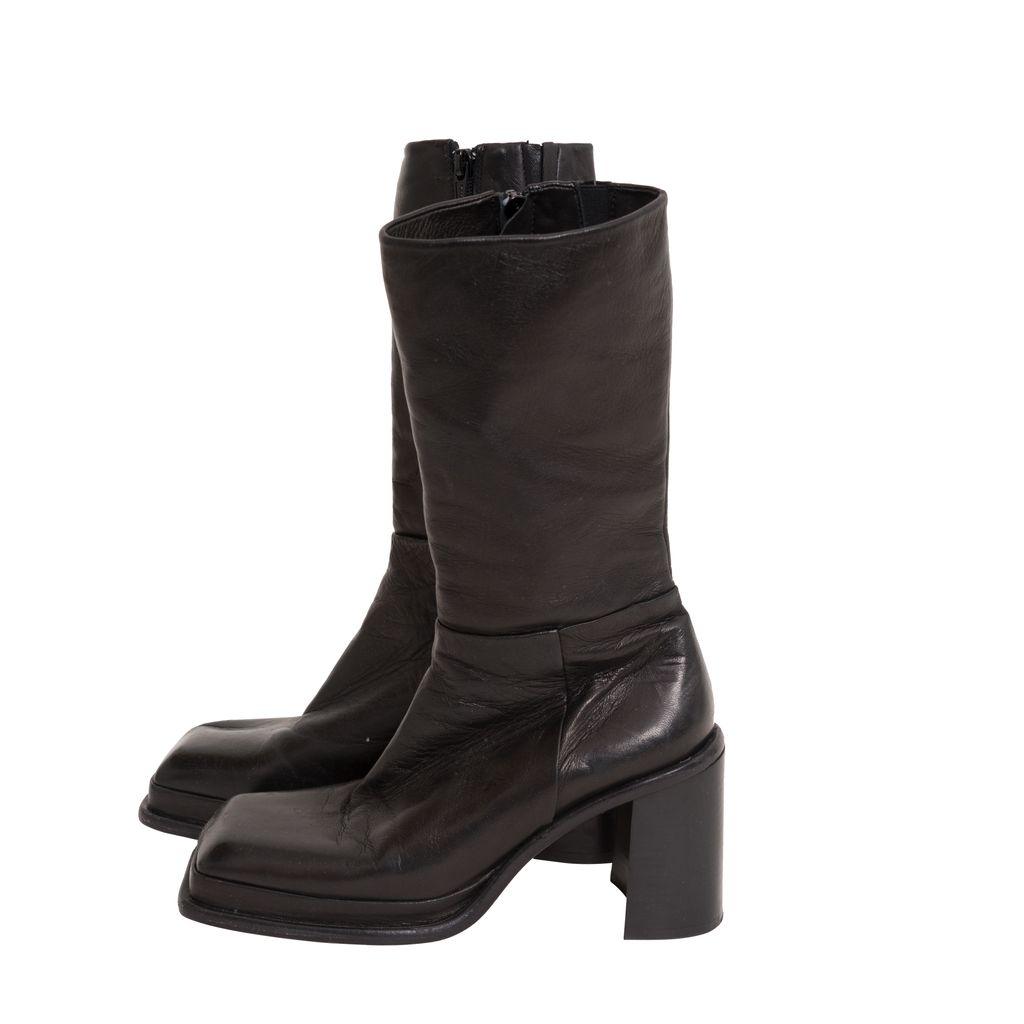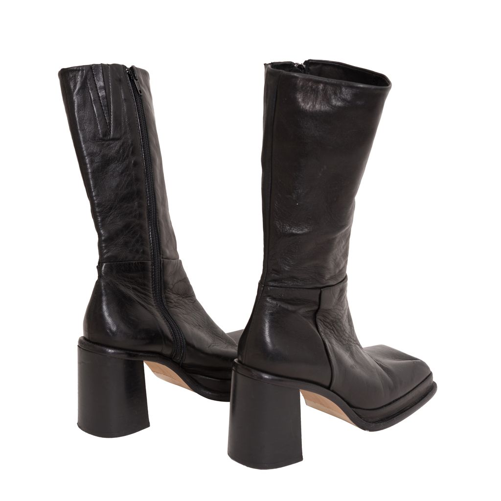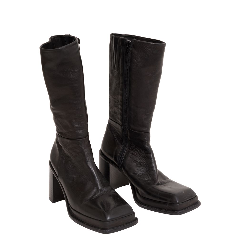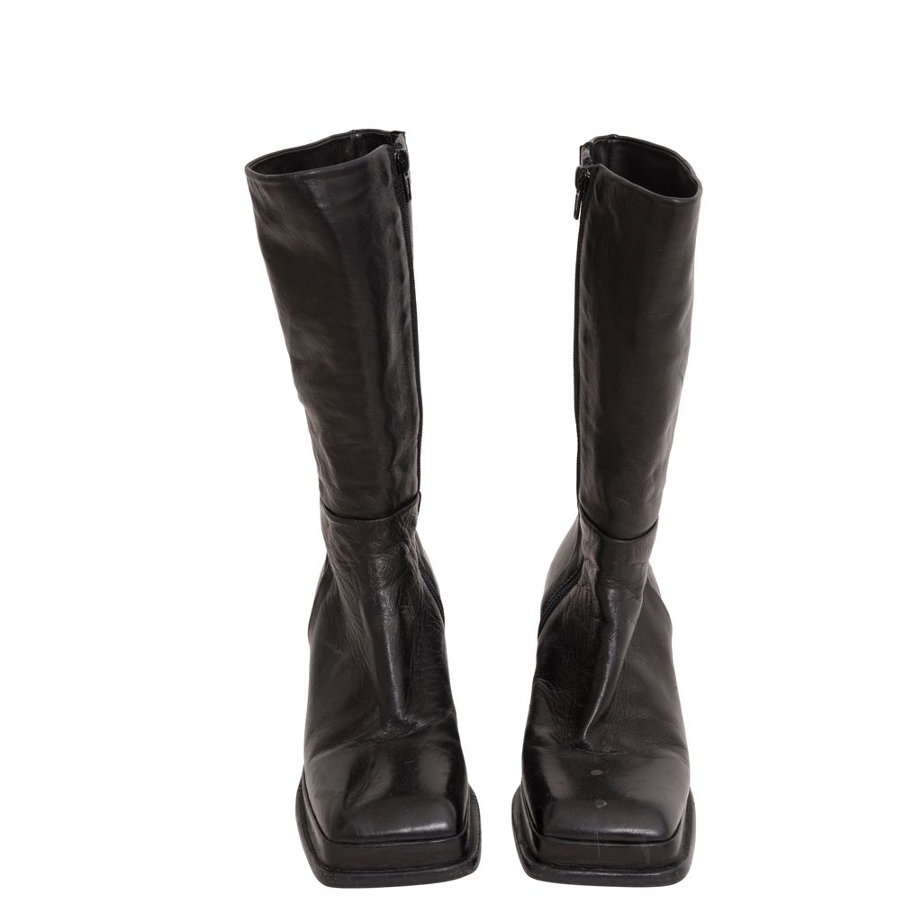 Miista Square Toe Boots features leather material, zipper on inside leg, thick heel, moderate wear on soles, moderate creasing throughout.