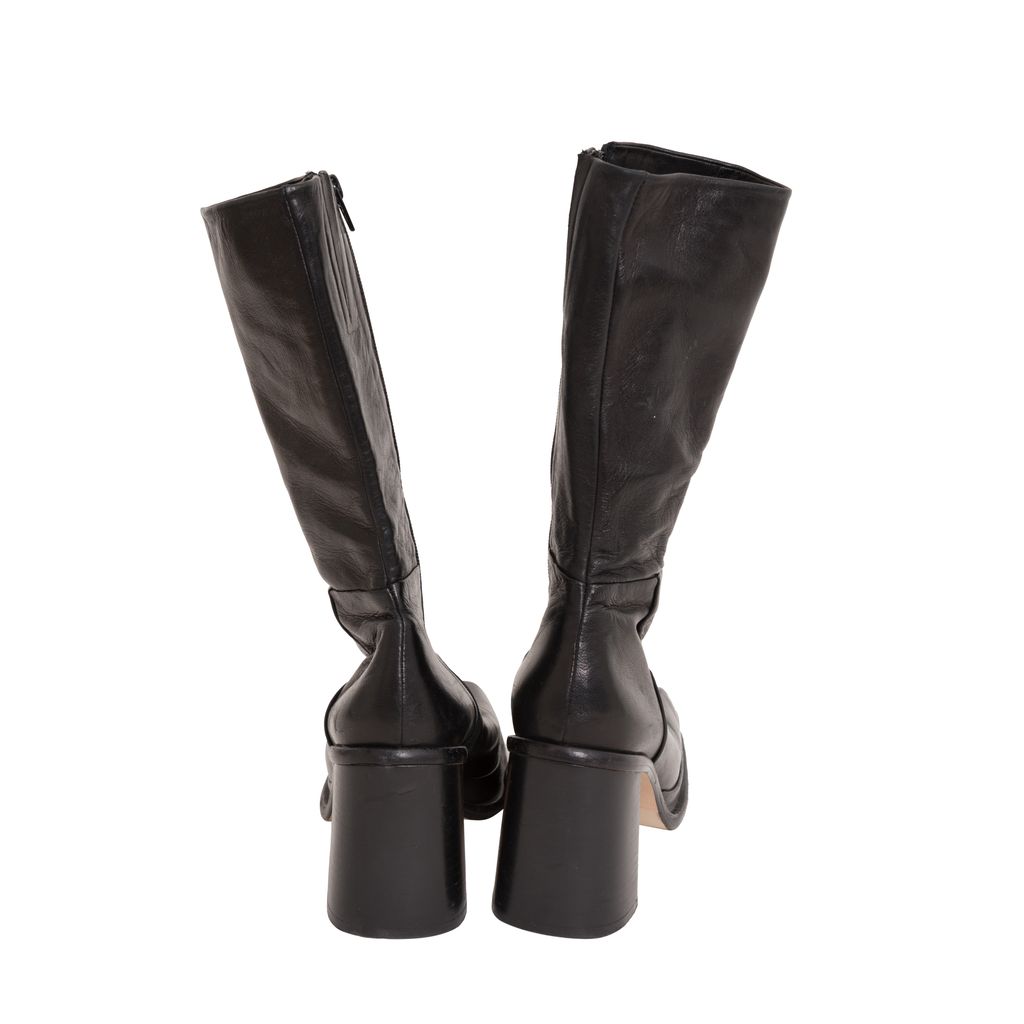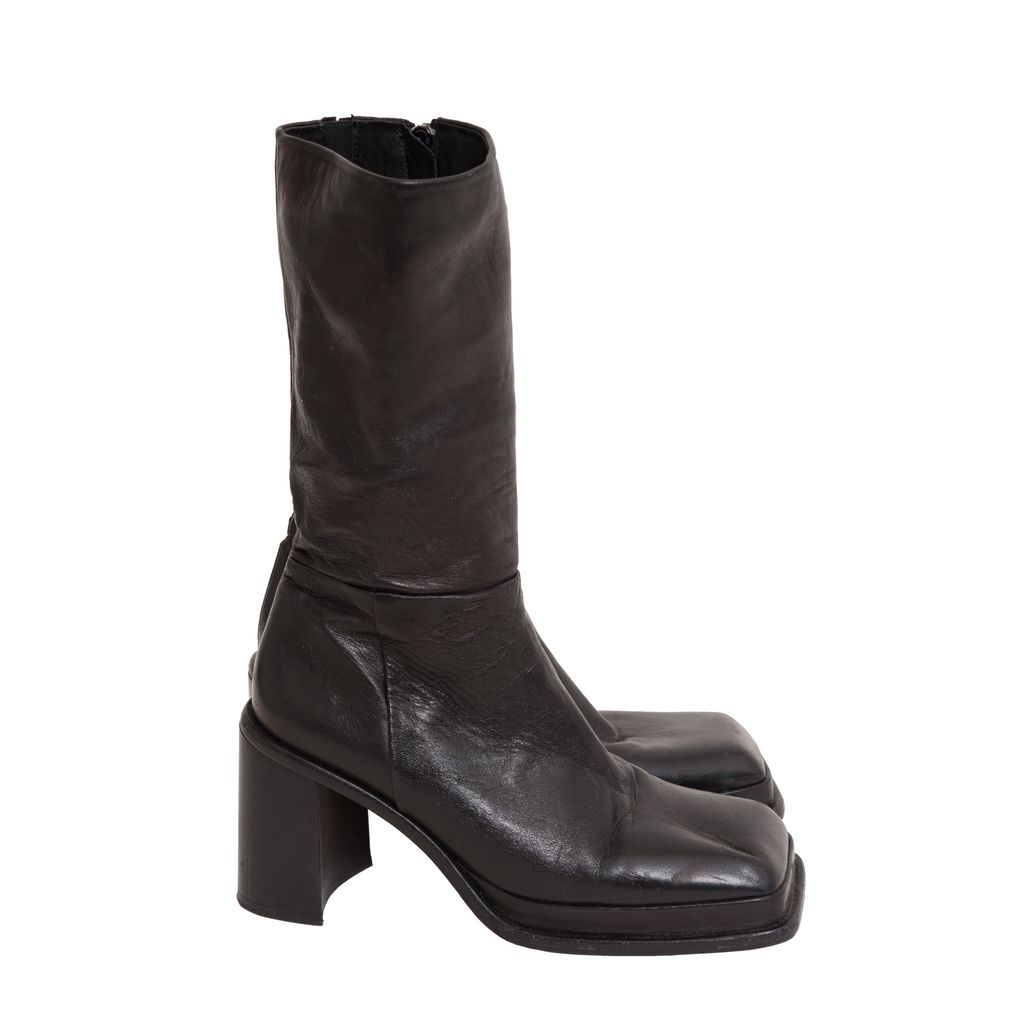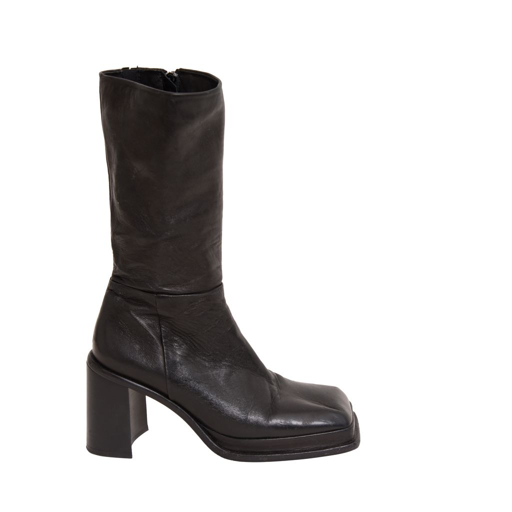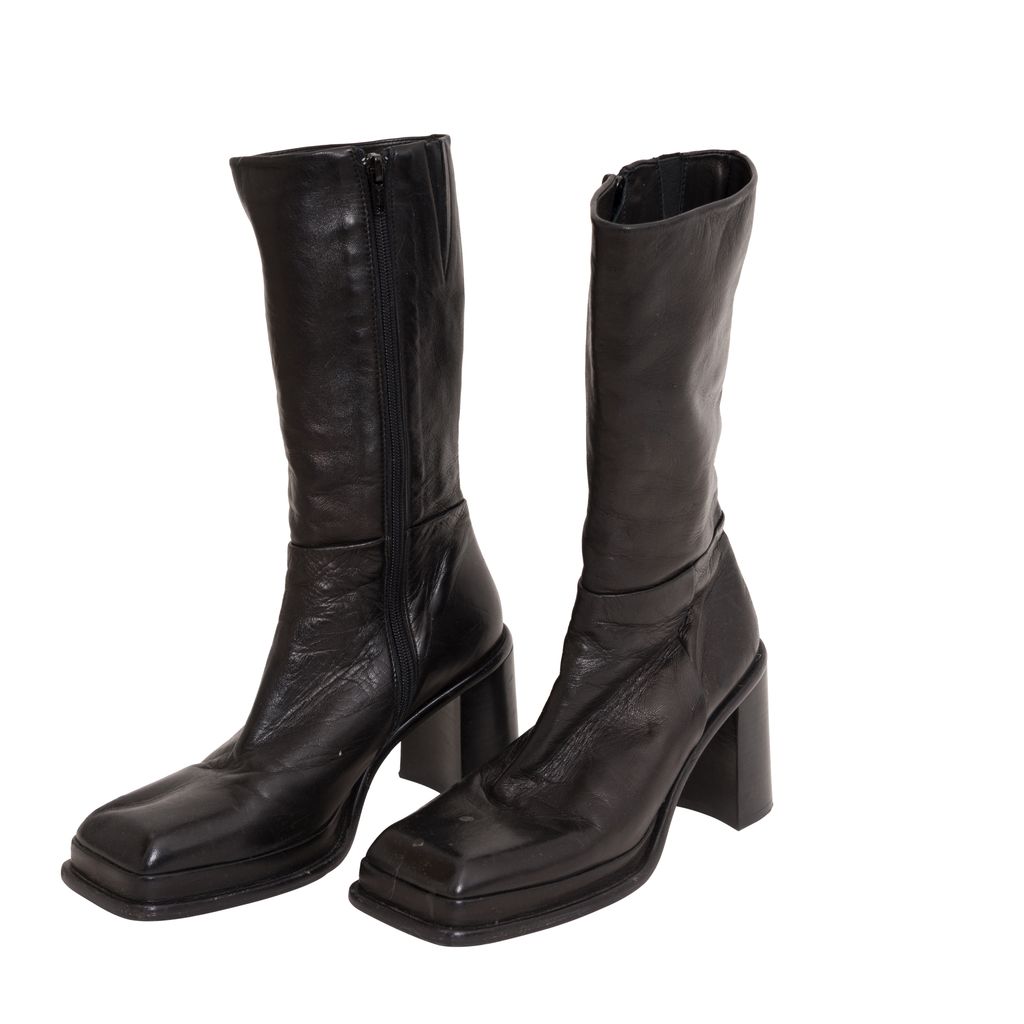 Miista Square Toe Boots features leather material, zipper on inside leg, thick heel, moderate wear on soles, moderate creasing throughout.