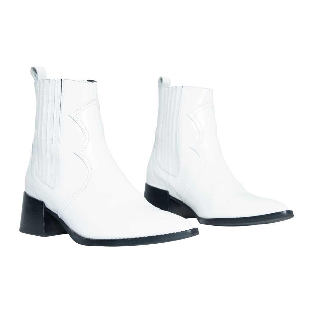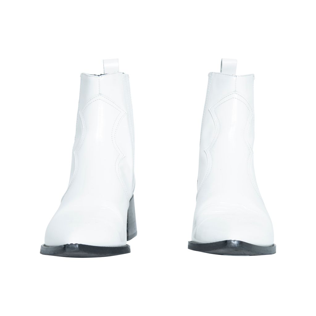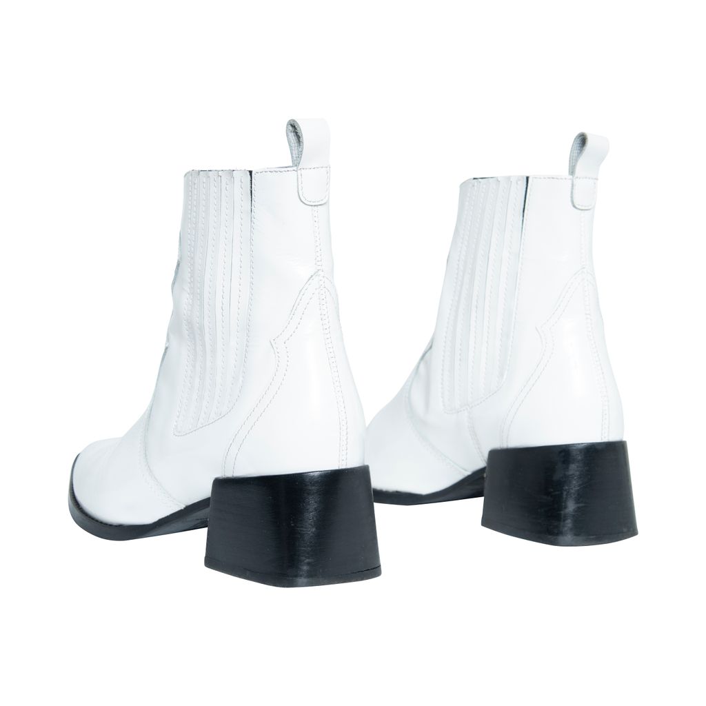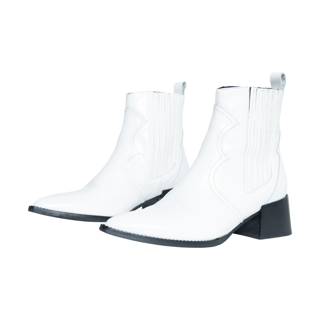 Miista White Boots features pointed toe, short block heel, white patent leather, and western designs.