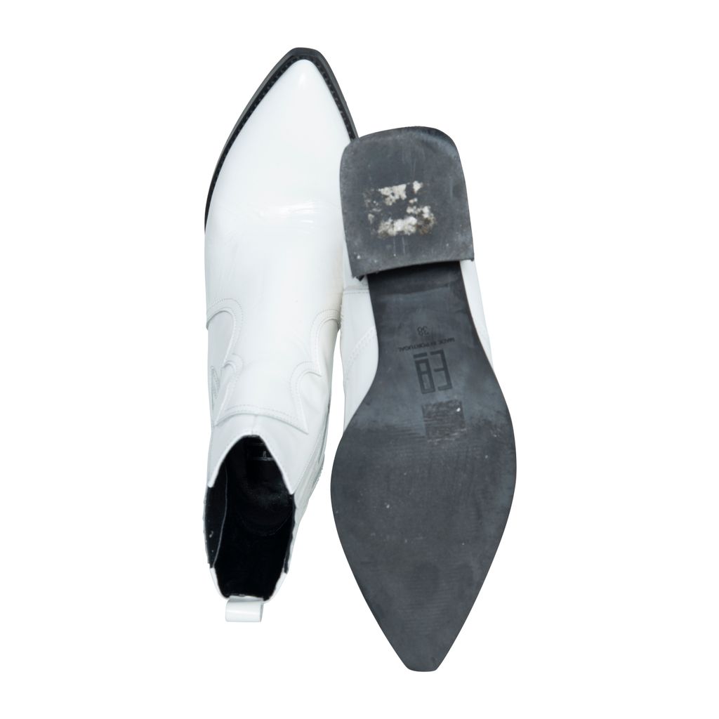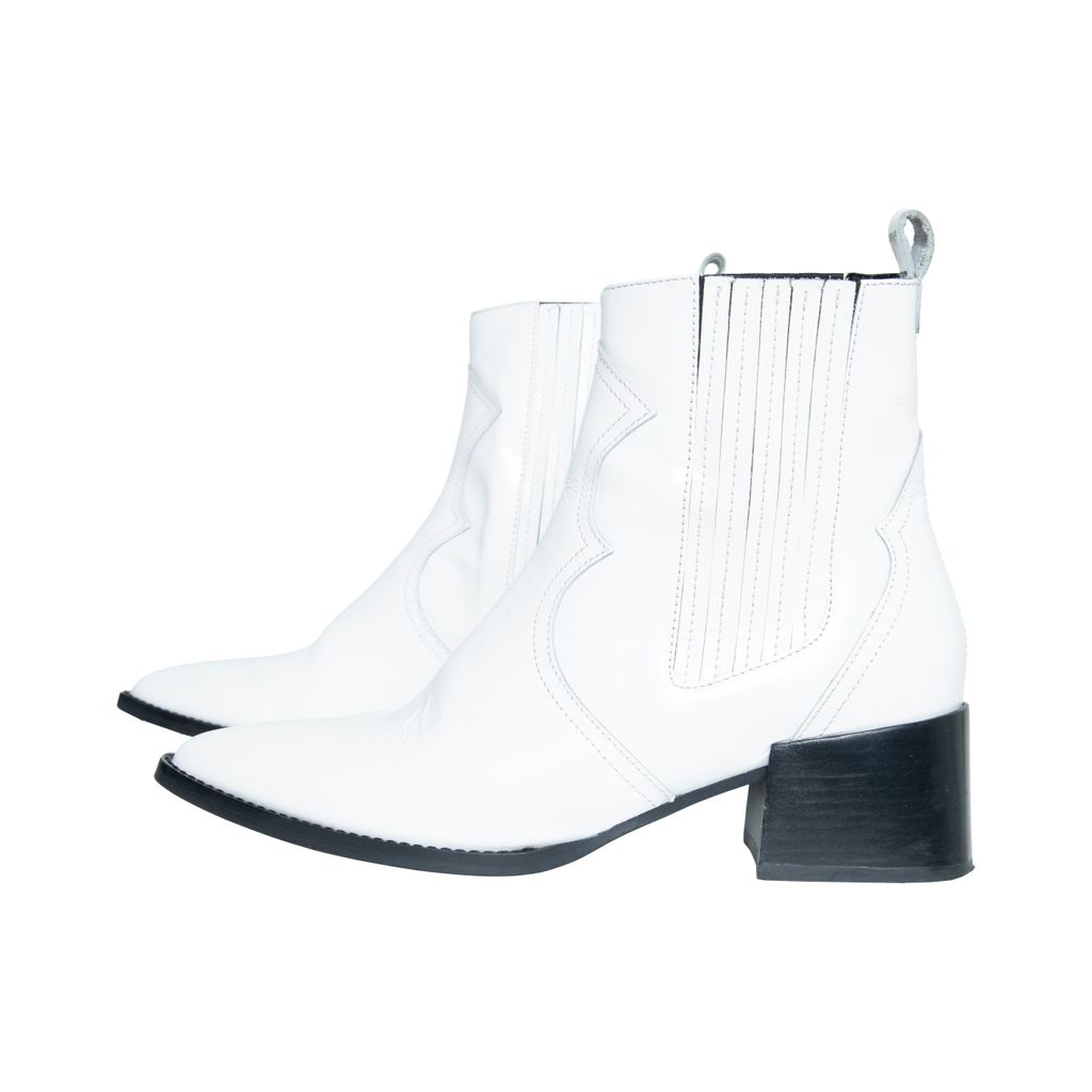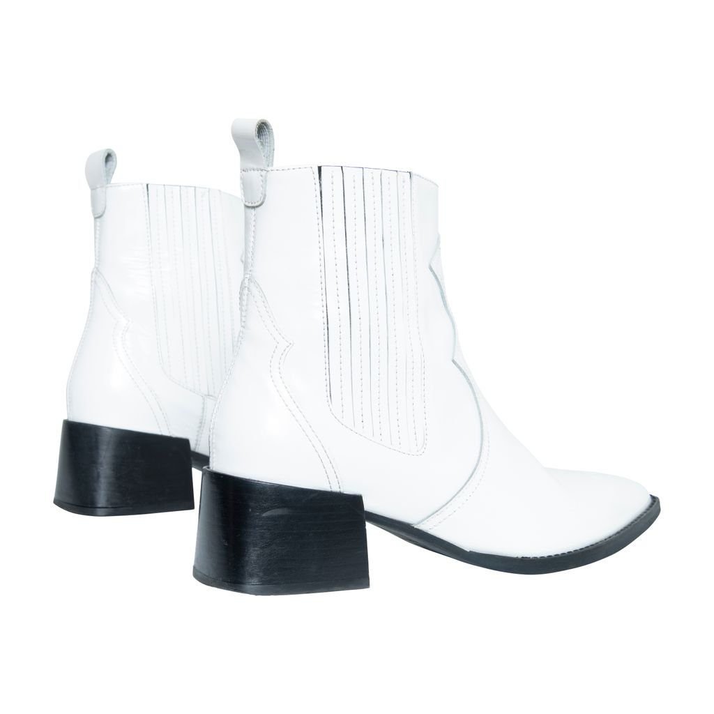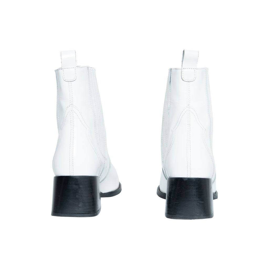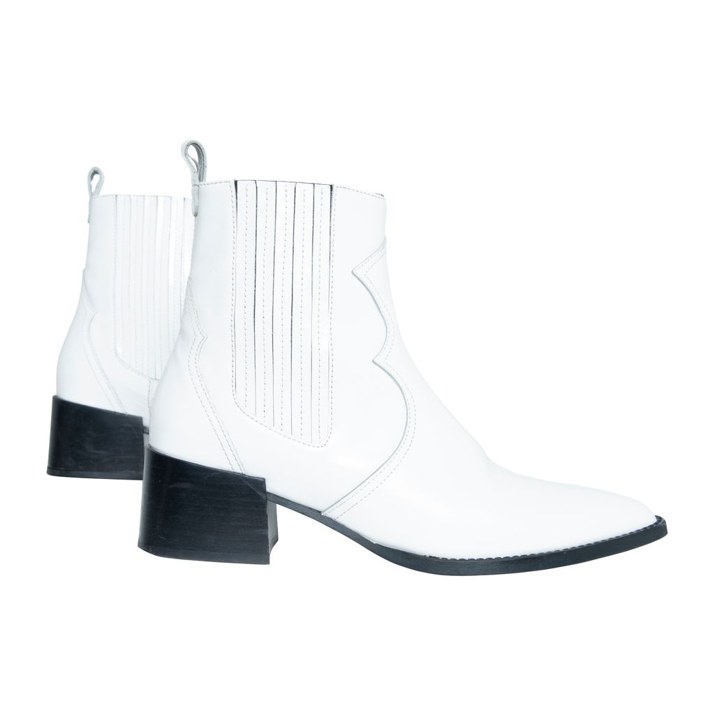 Miista White Boots features pointed toe, short block heel, white patent leather, and western designs.
