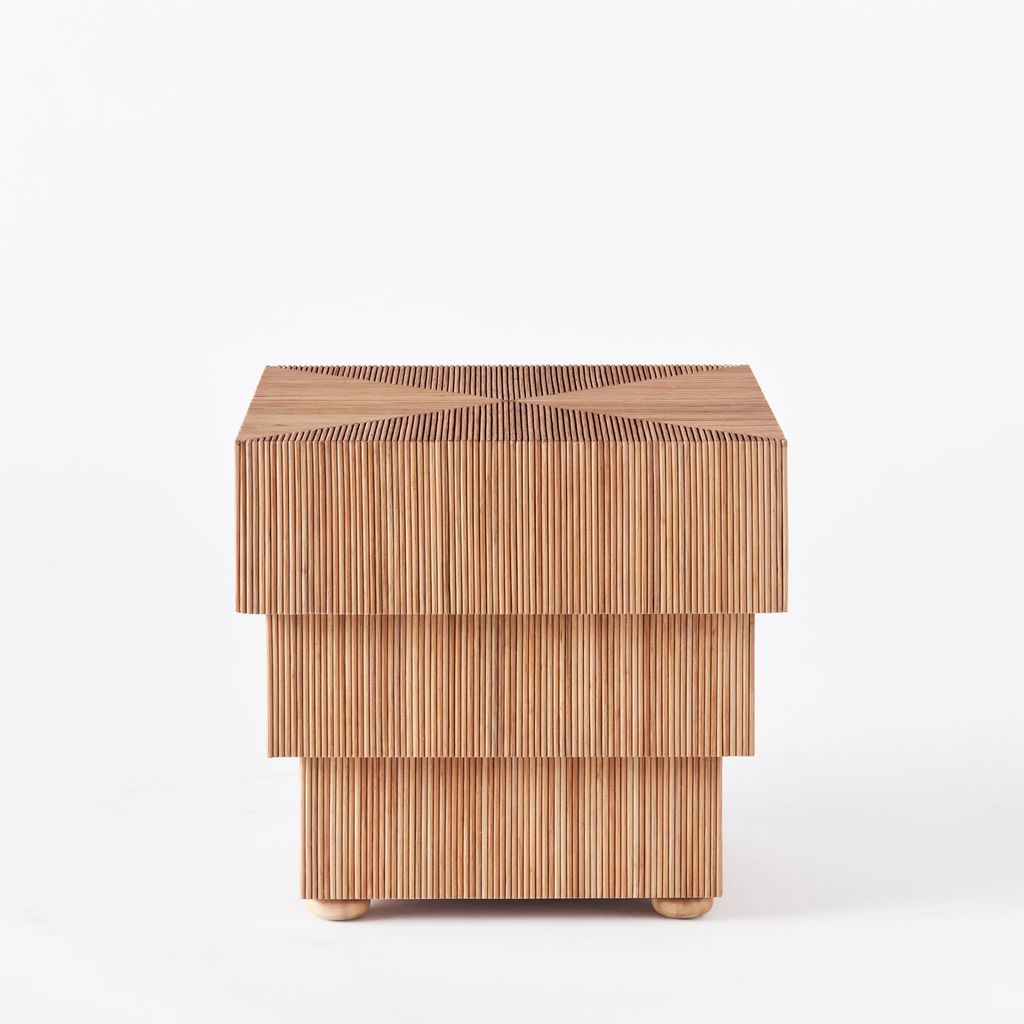 Mikado Side Table is a contemporary side table with a vintage essence. The unique design of a layered, cubic structure crafted from natural rattan, where each layer alternates slightly in size, adds a touch of modern vintage to any room. The top of the table showcases an eye-catching geometric pattern, enhancing a dynamic visual accent. A perfect fit for cozy corners or as a chic bedside table. In the same series, a rectangular coffee table version is also presented.