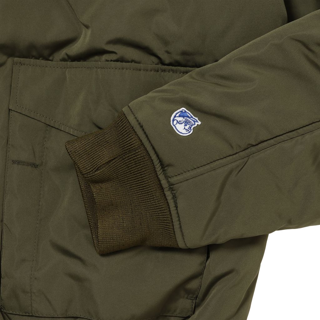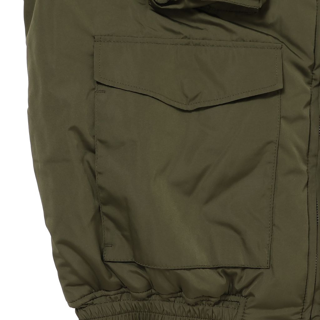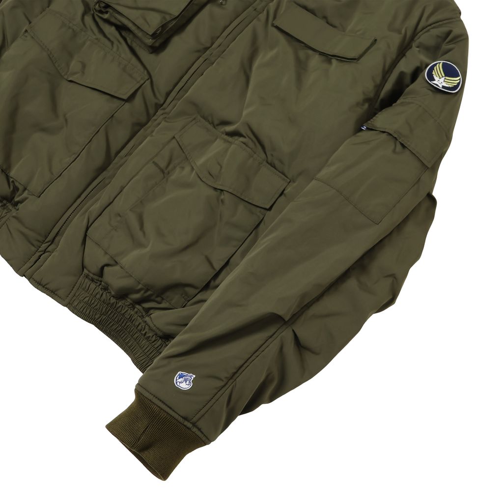 MILITARY JACKET features water-repellent nylon construction, various pockets, logo velcro patch, patch on left sleeve, woven logo patch, front zip closure, and ribbed collar, cuffs, and band.
