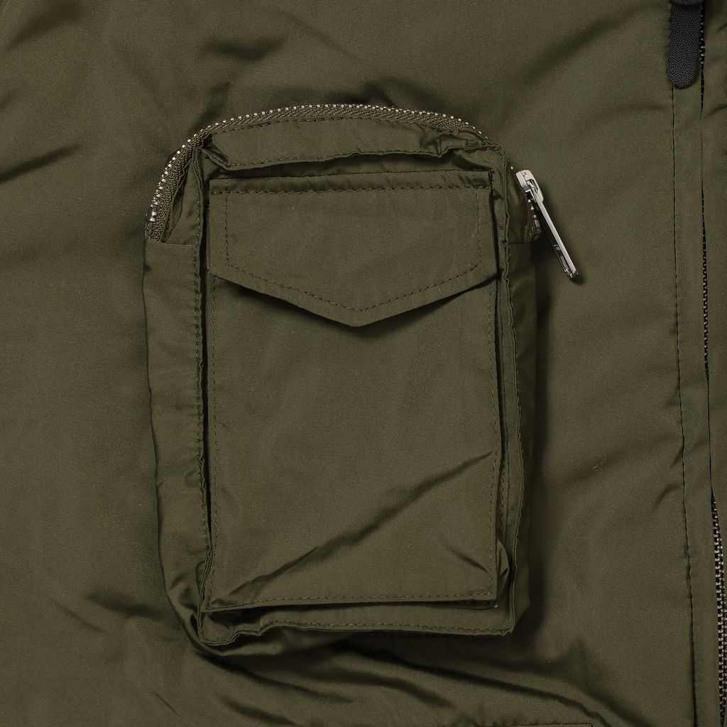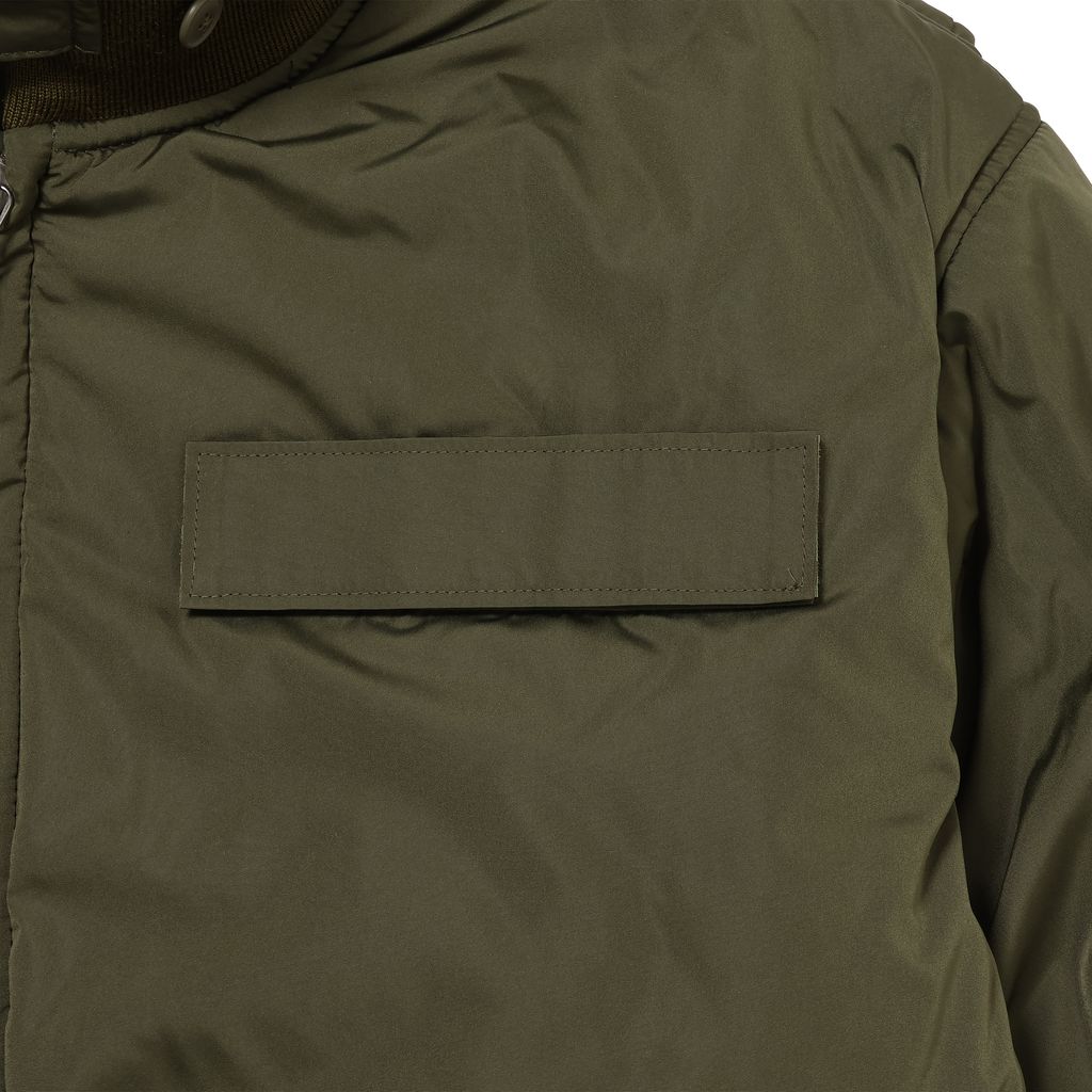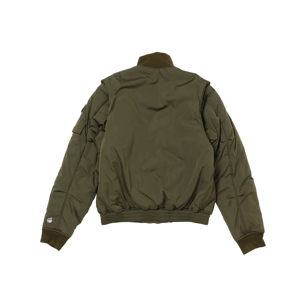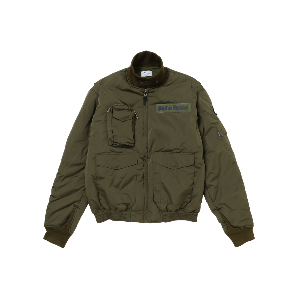 MILITARY JACKET features water-repellent nylon construction, various pockets, logo velcro patch, patch on left sleeve, woven logo patch, front zip closure, and ribbed collar, cuffs, and band.