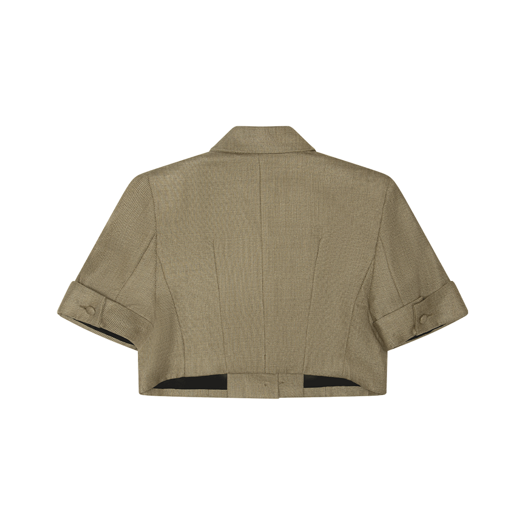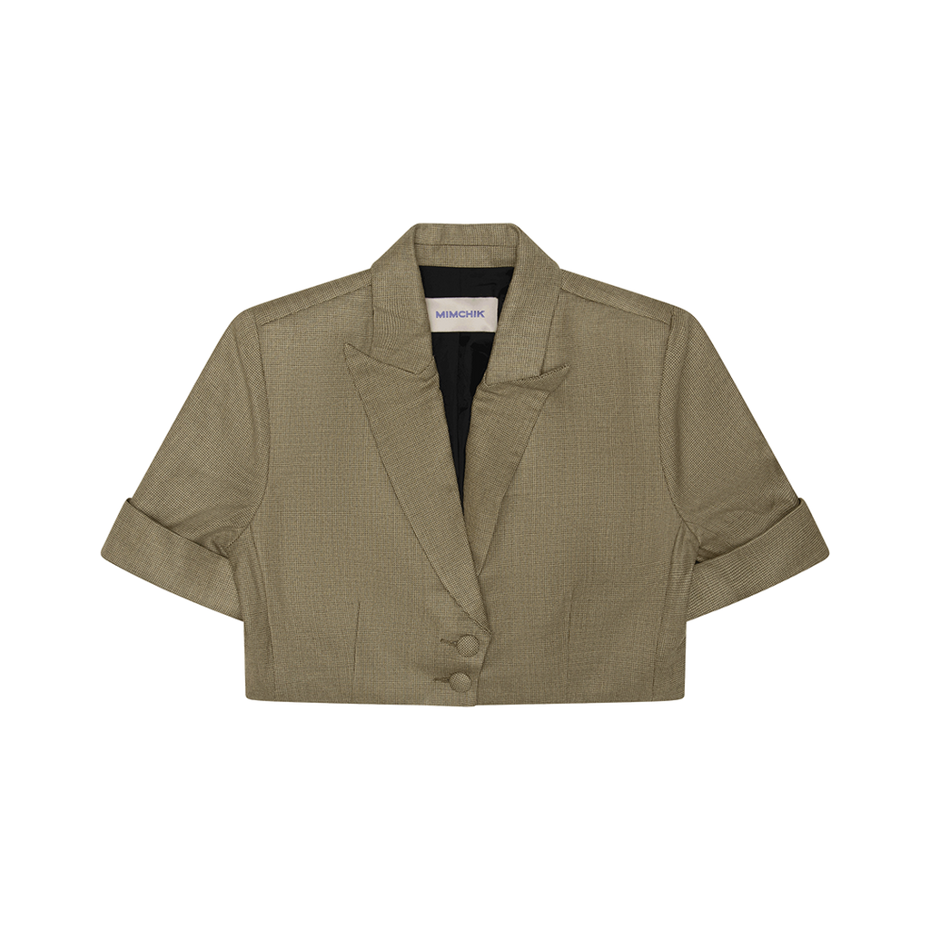 Mimchik Cropped Jacket features front button closure and cropped sleeves.