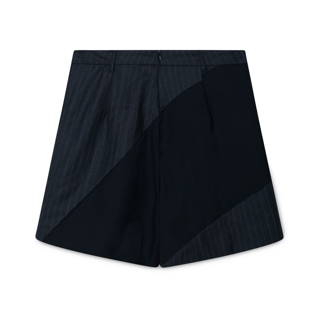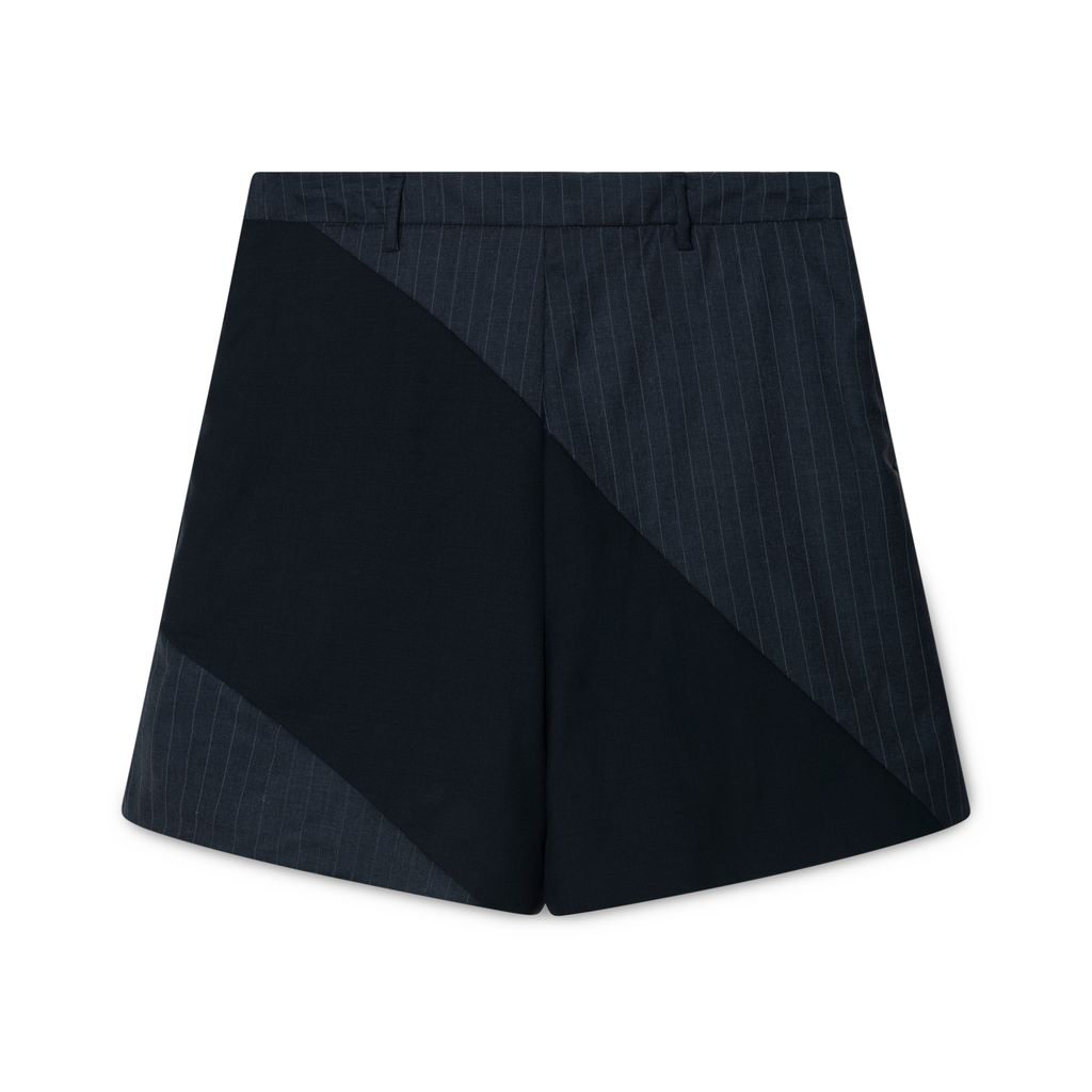 Mimchik Jigsaw Basketball Shorts features side pockets, invisible zipper down center back, and graphic style lines in contrasting wool.