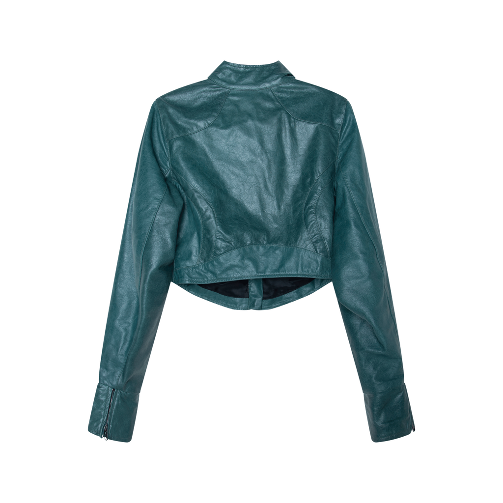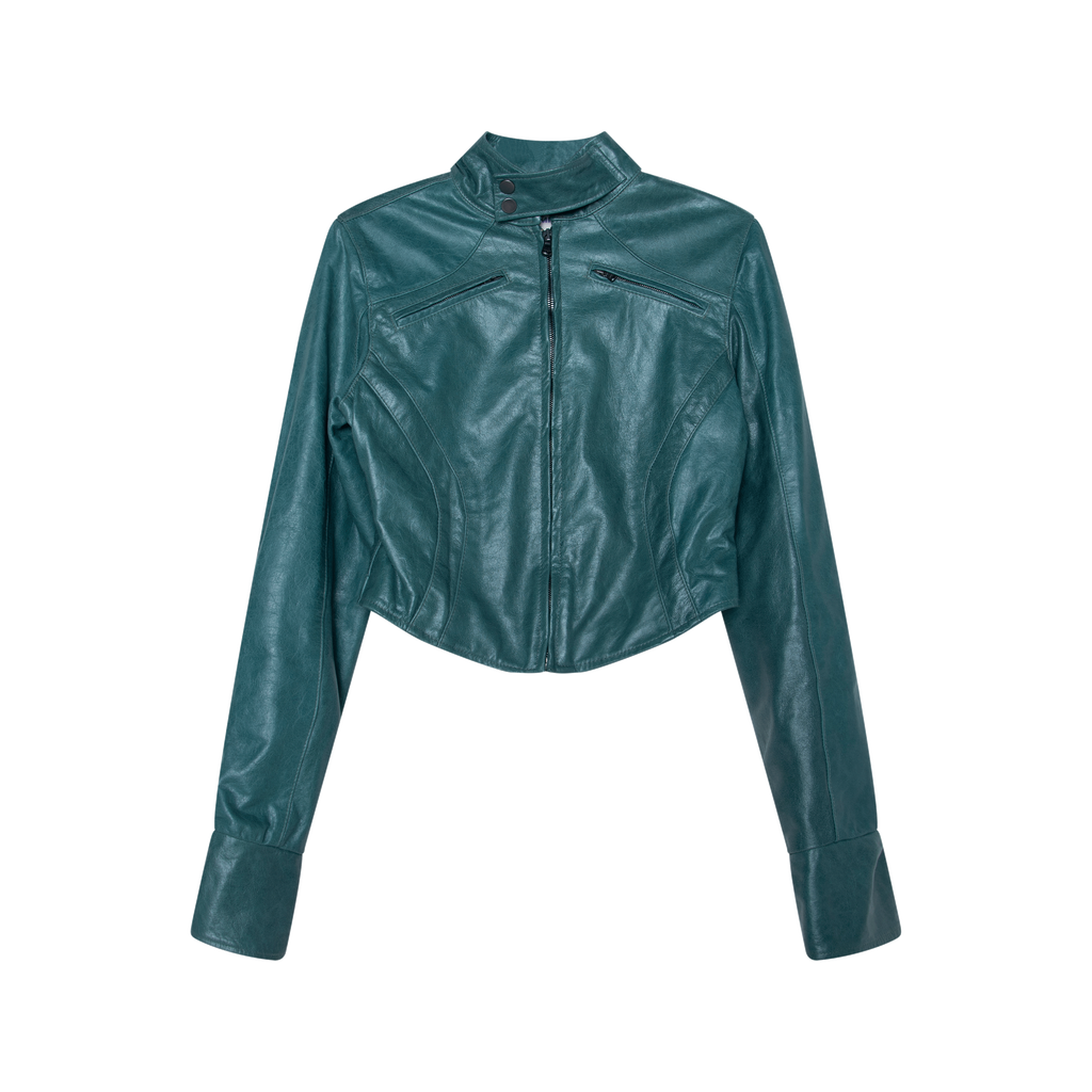 MIMCHIK Teal Leather Moto Jacket features fitted design, slight crop, contoured waistline, star detail seams in back, and zippers on center front, chest, and flared sleeve cuffs.