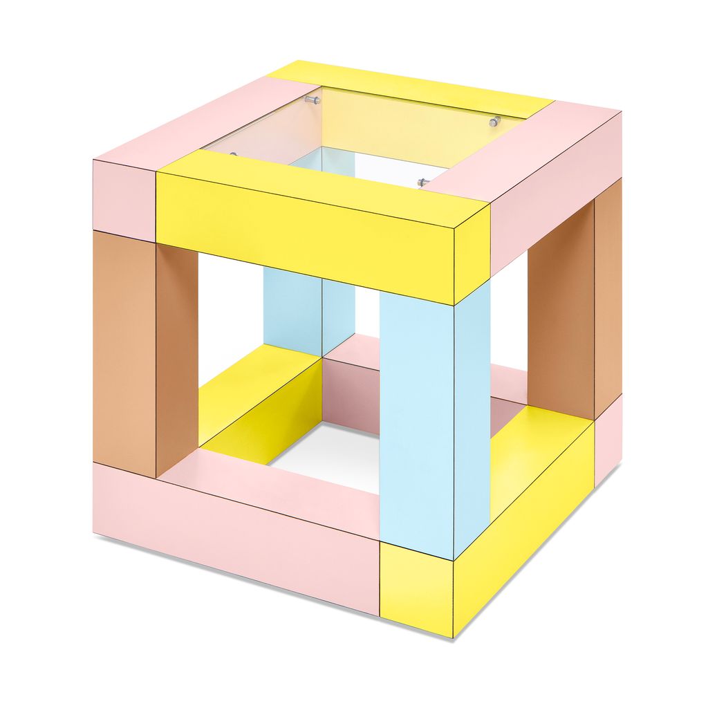 Designed by Ettore Sottsass in 1984, Mimosa is a wooden coffee table where colored blocks intersect in a perpendicular arrangement: the result is a “giant” colored cubical plaything with delicate pastel hues.
