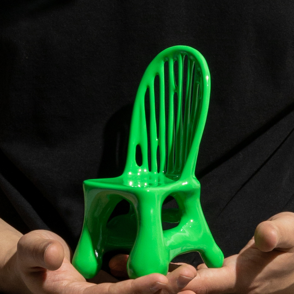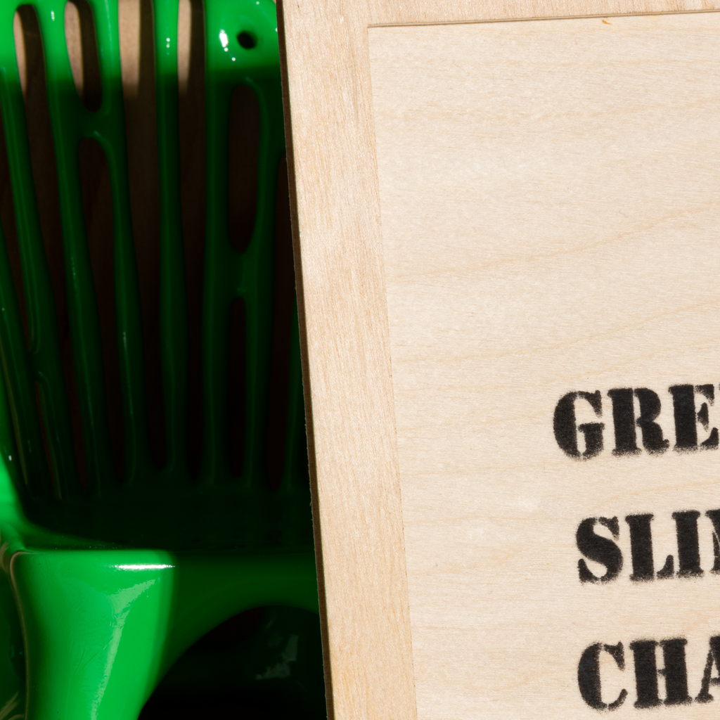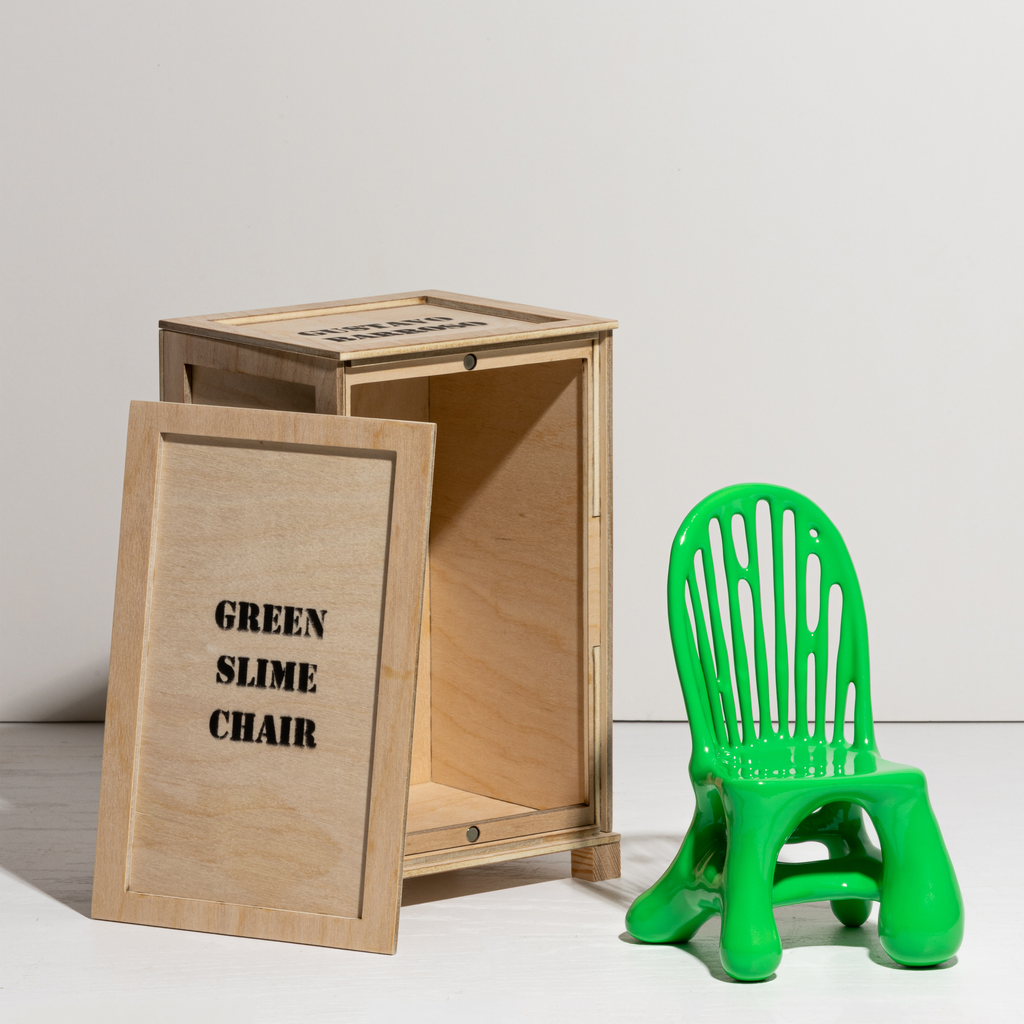 1:6 scale miniature of Gustavo Barroso’s Green Slime Chair (2020). Chair is made from solid cast PU. Comes packaged in a miniature wood crate. Crate & chair is signed + numbered by Gustavo Barroso.