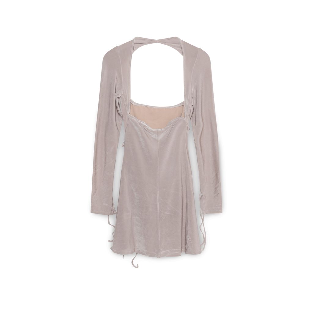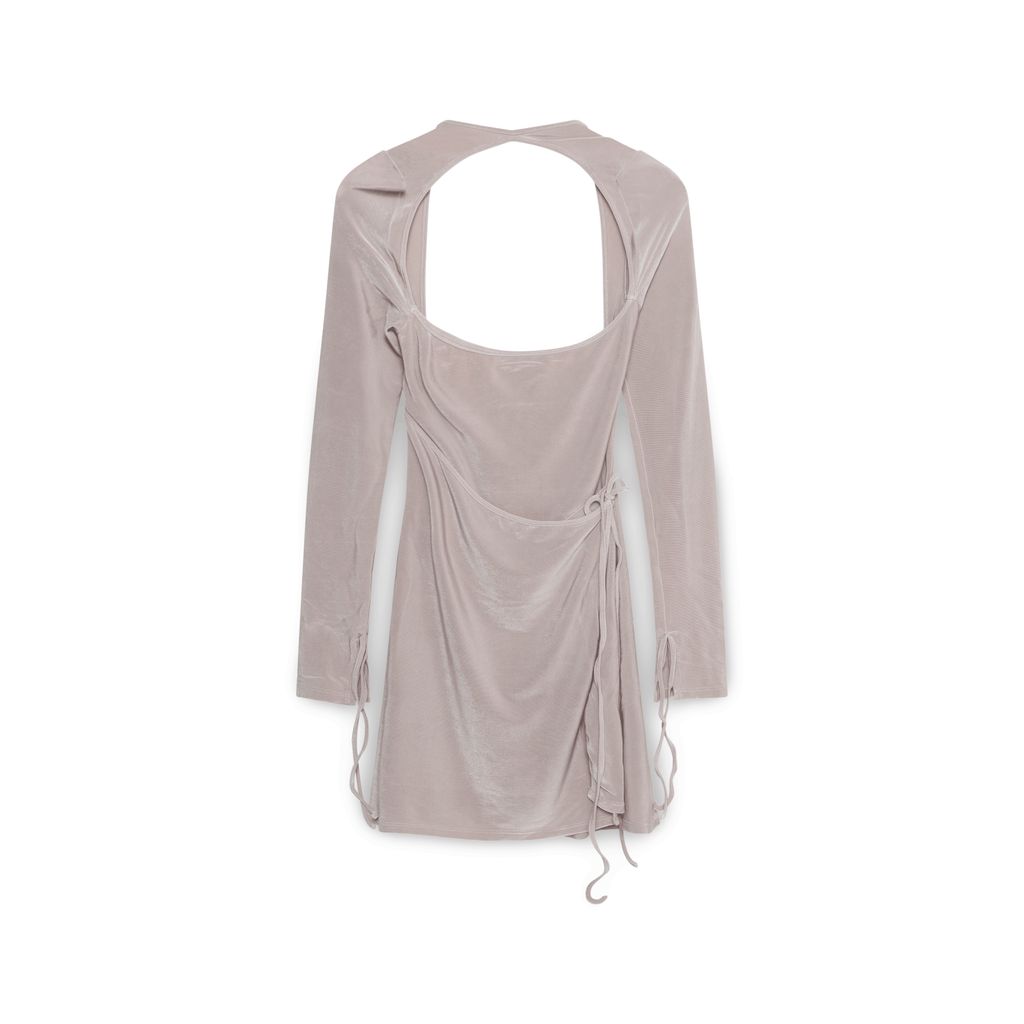 Mini Wrap Dress Dove features wrist ties, built in bodysuit, cut out back, and side tie.