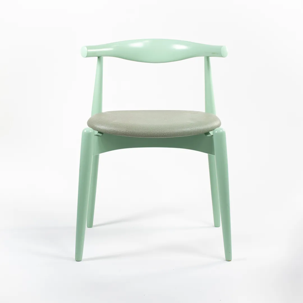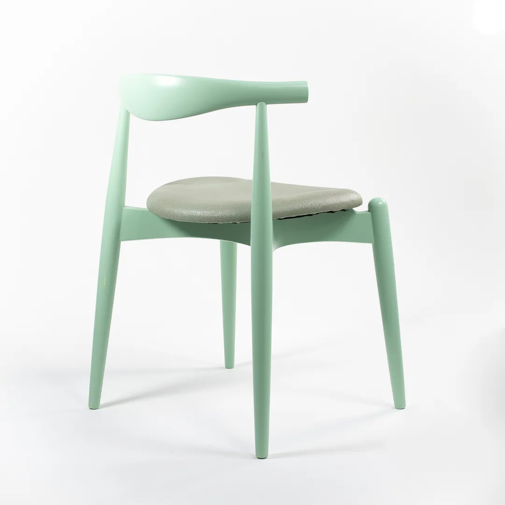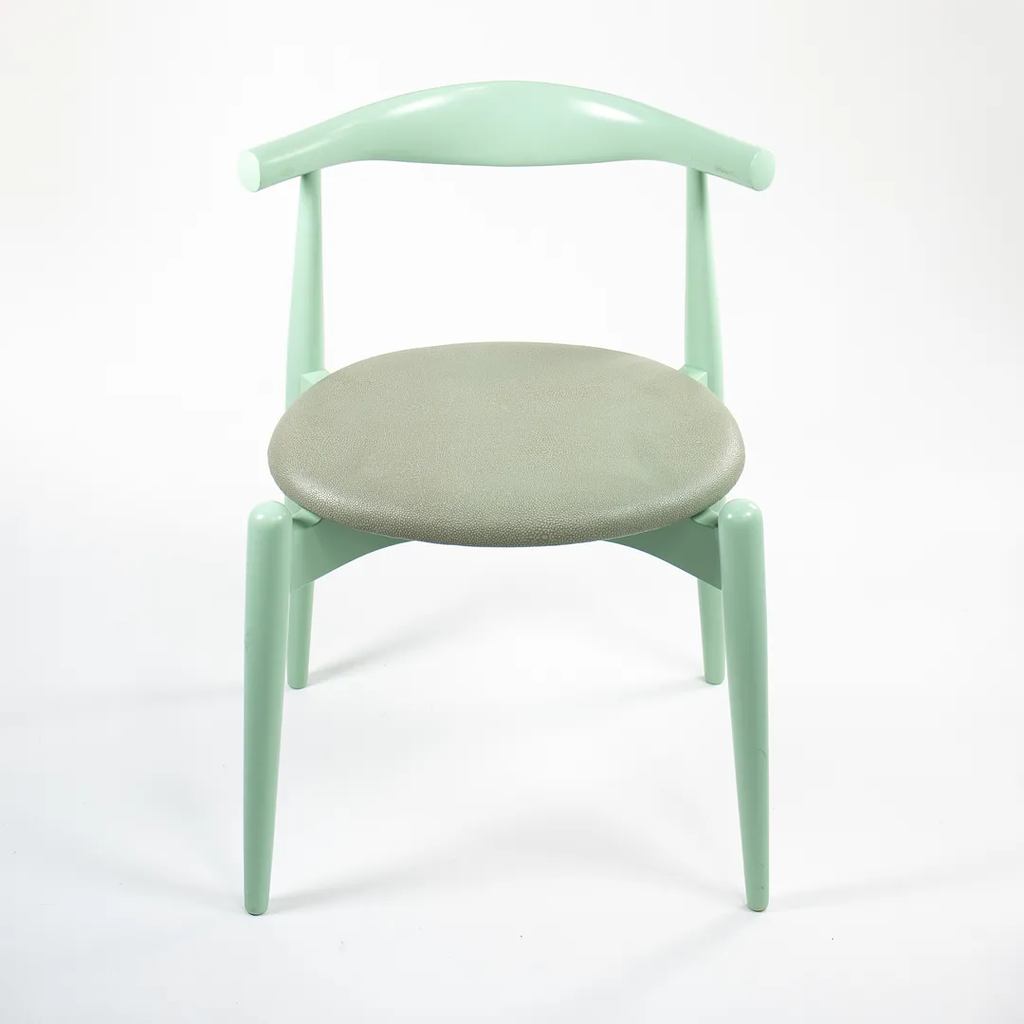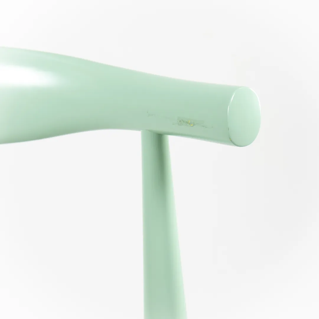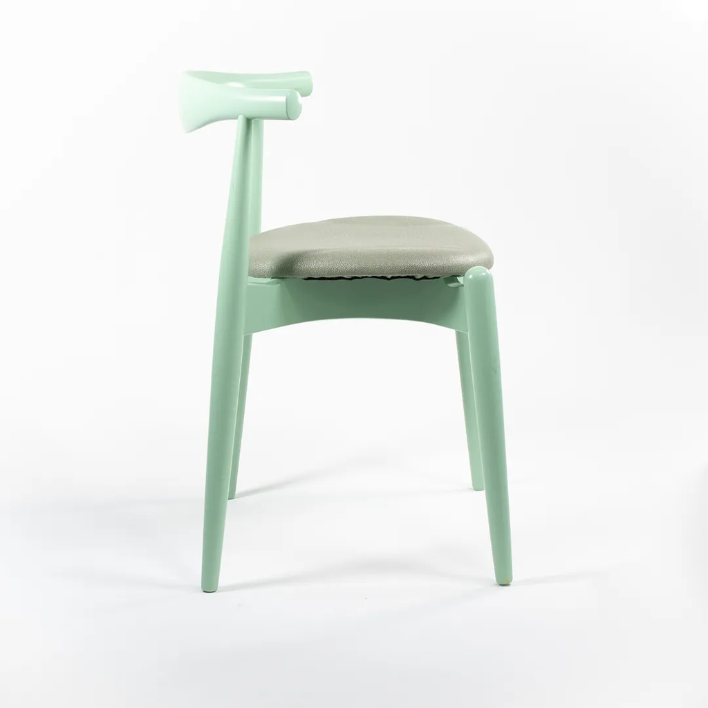 This is a CH20 Elbow Dining Chair made with a solid beech frame, painted mint green, and a green Chagrin leather seat (ordered COL or Customers Own Leather via Edelman leather most likely). The chair, designed by Hans Wegner and produced by Carl Hansen & Son in Denmark, dates to circa 2021 and is guaranteed as authentic. Condition is very good to excellent with some light wear from use. It was used a floor model within one of Carl Hansen's showrooms. See photos.